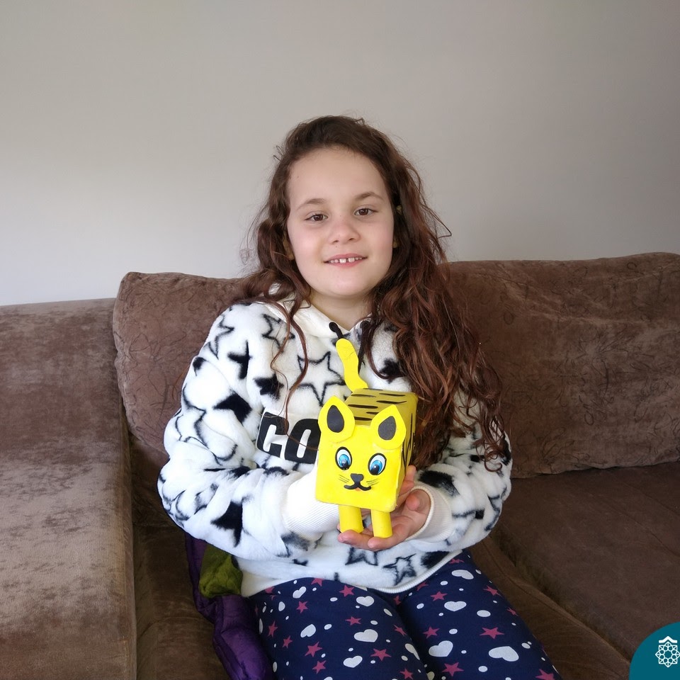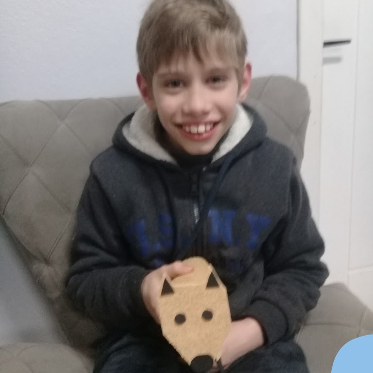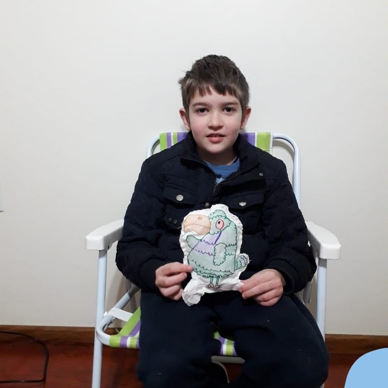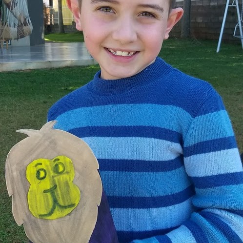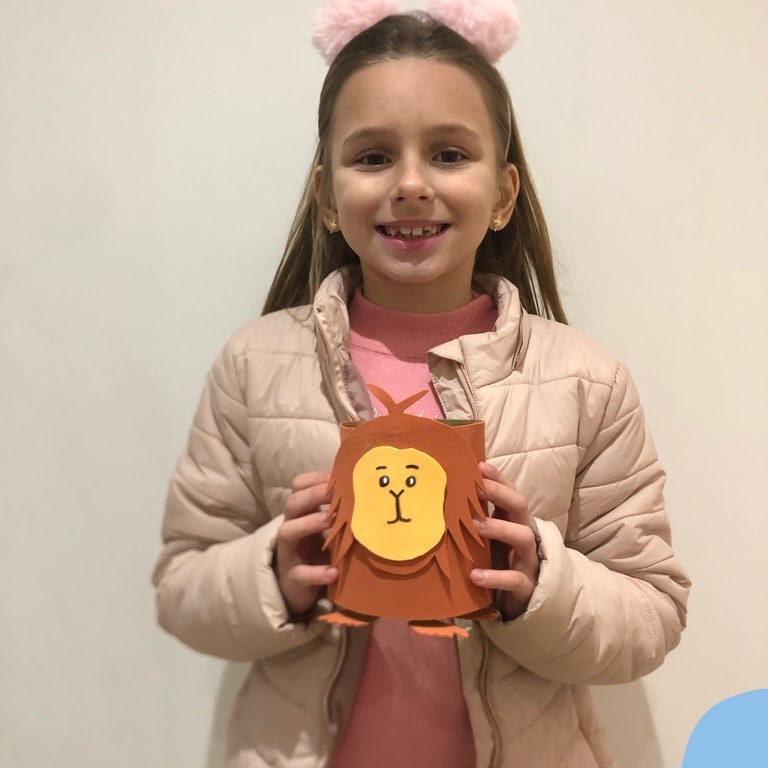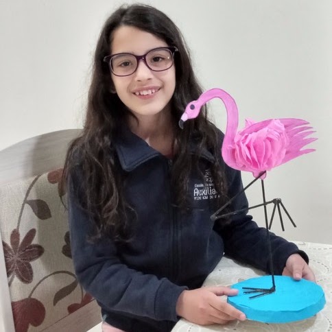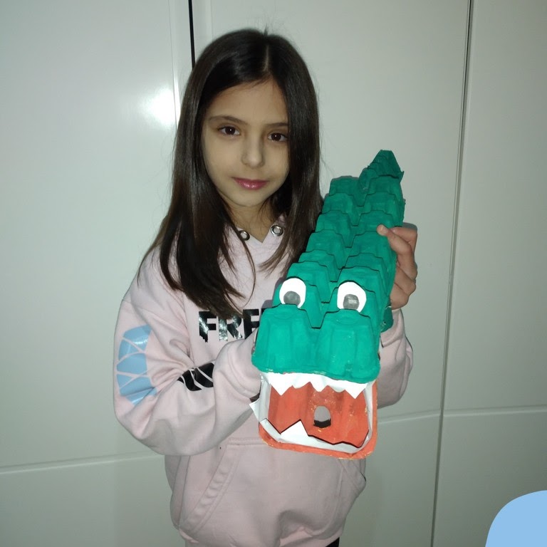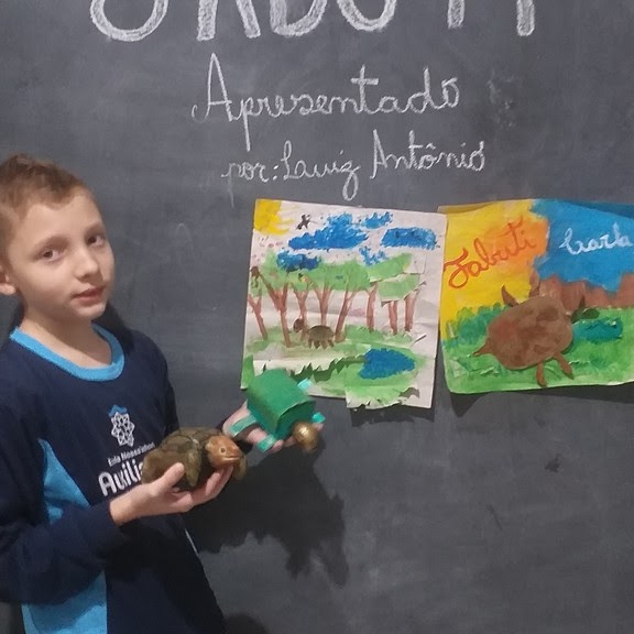 Fotos dos alunos com o animal em extinção pesquisado por cada um e construído com material alternativo: