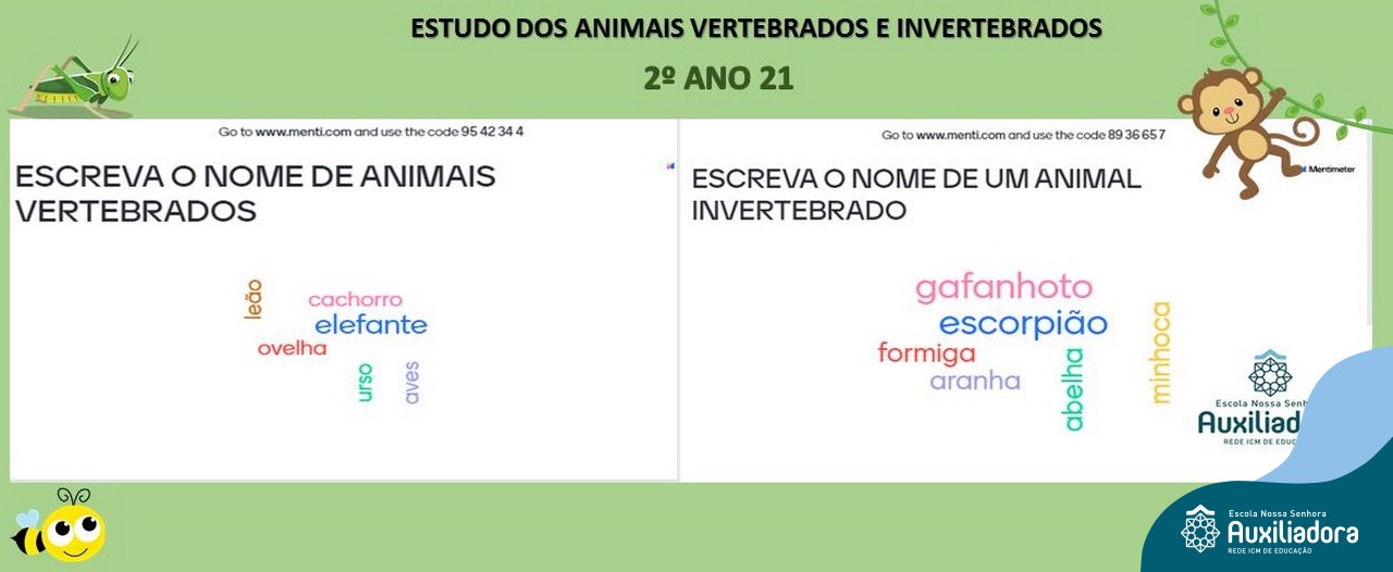Após o estudo, as turmas utilizaram a ferramenta “Mentimeter” para construir uma nuvem de palavras com exemplos de animais vertebrados e invertebrados!