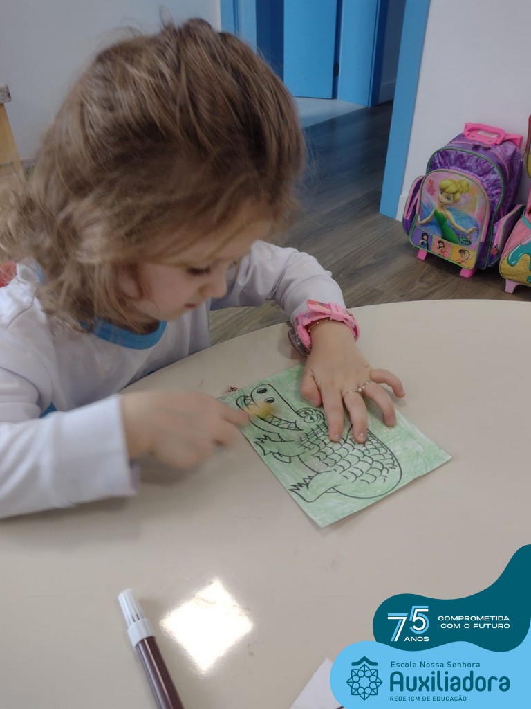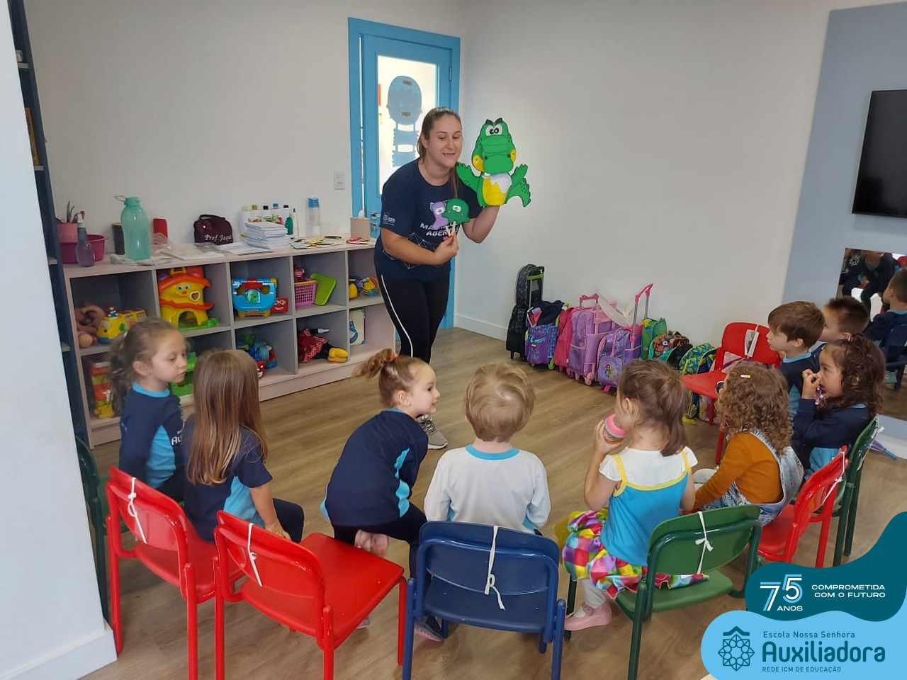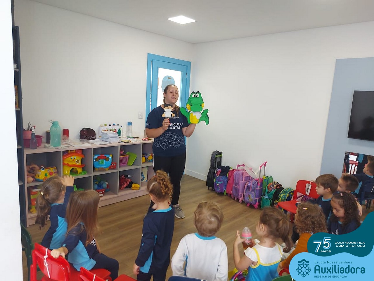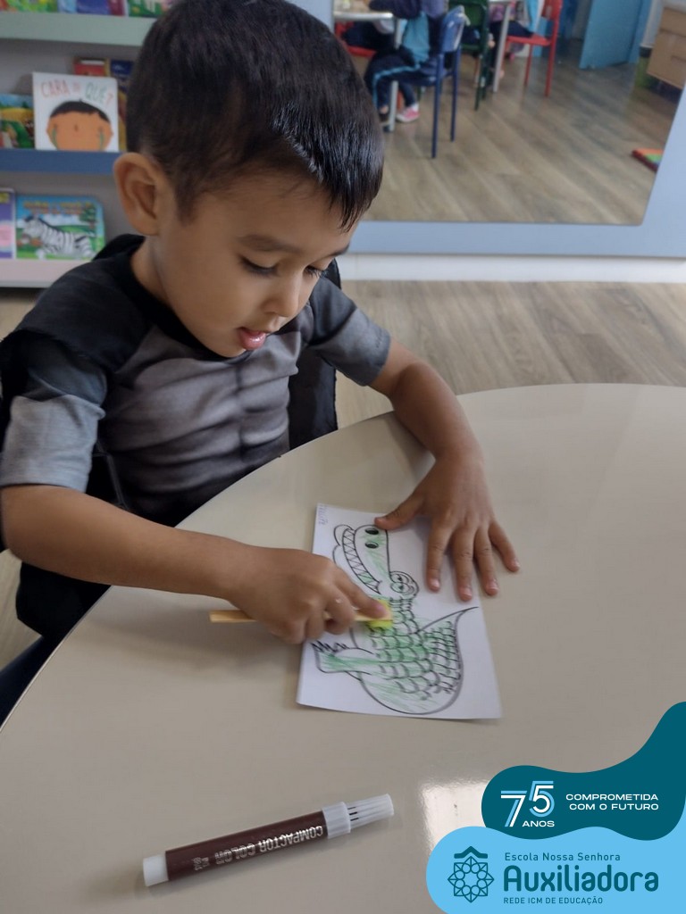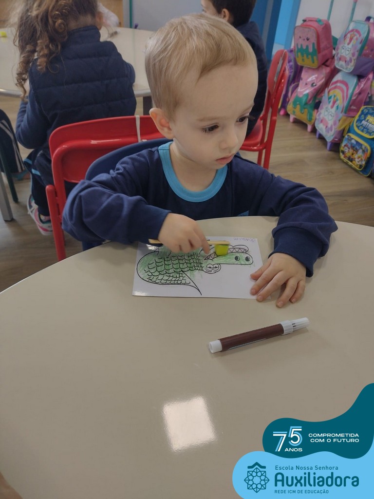 Na semana que passou as turmas do maternal 2 trabalharam sobre a importância de mantermos uma boa higiene do nosso corpo, dando ênfase à higiene bucal a partir da história “Joca, o jacaré com dor de dente”.