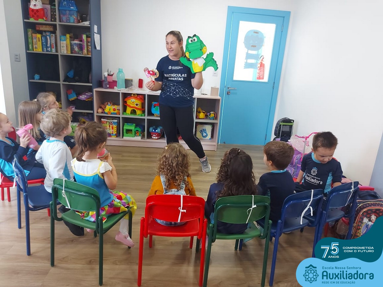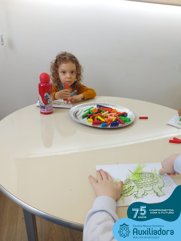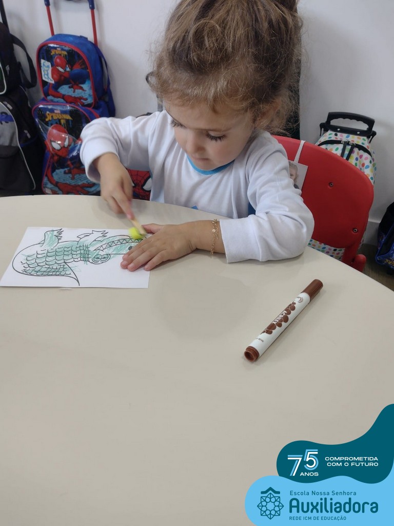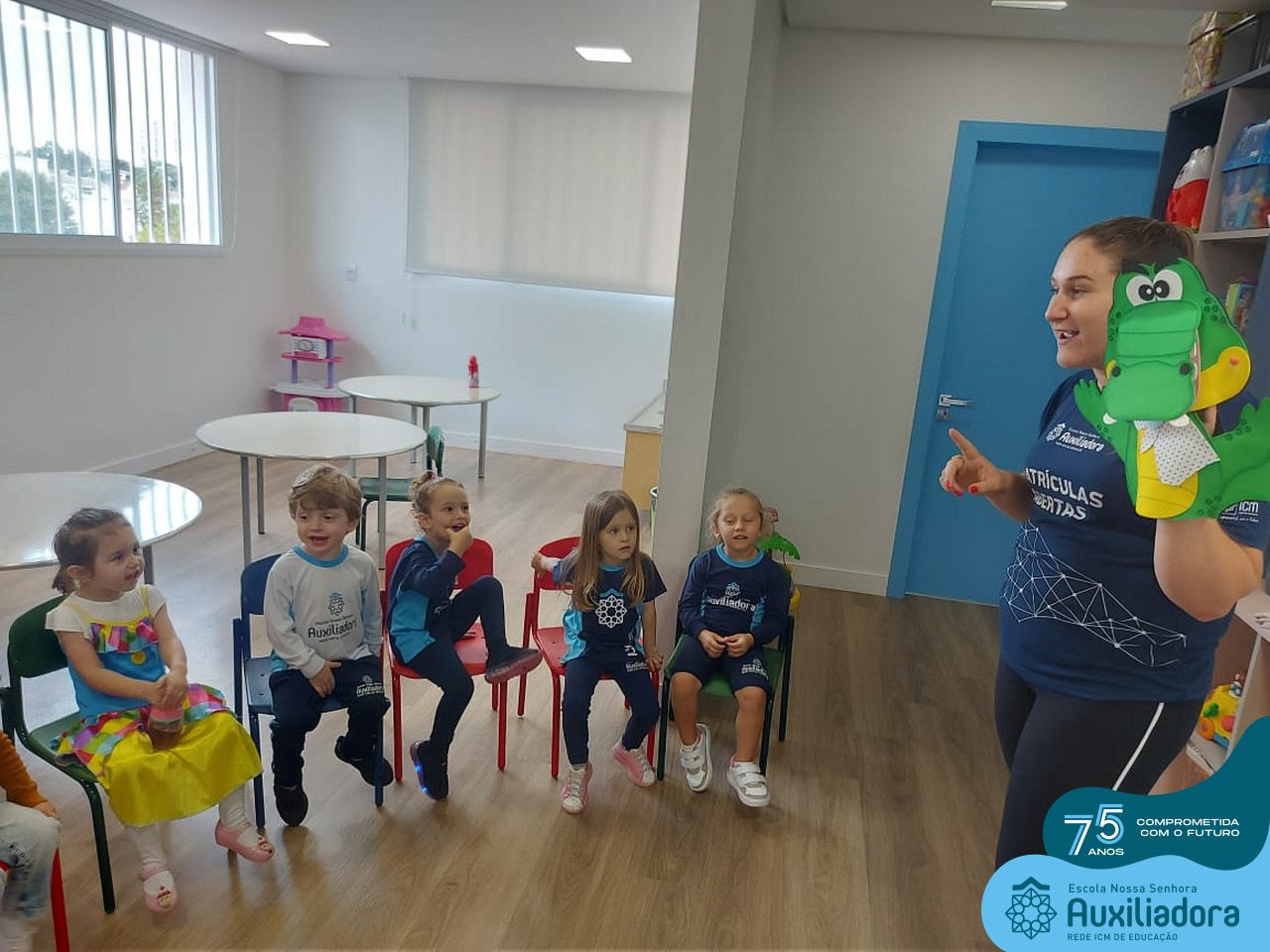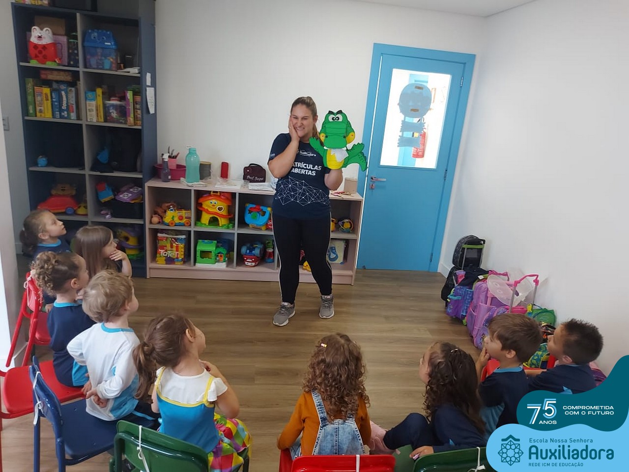 Na semana que passou as turmas do maternal 2 trabalharam sobre a importância de mantermos uma boa higiene do nosso corpo, dando ênfase à higiene bucal a partir da história “Joca, o jacaré com dor de dente”.