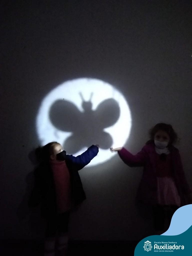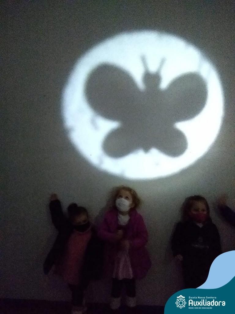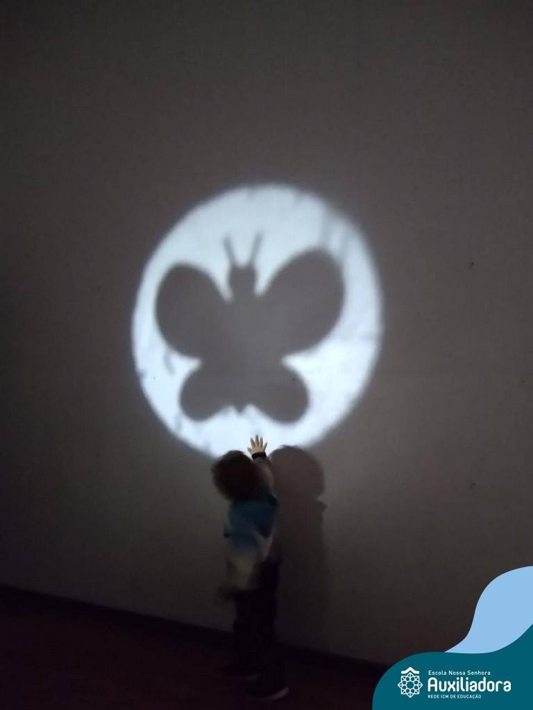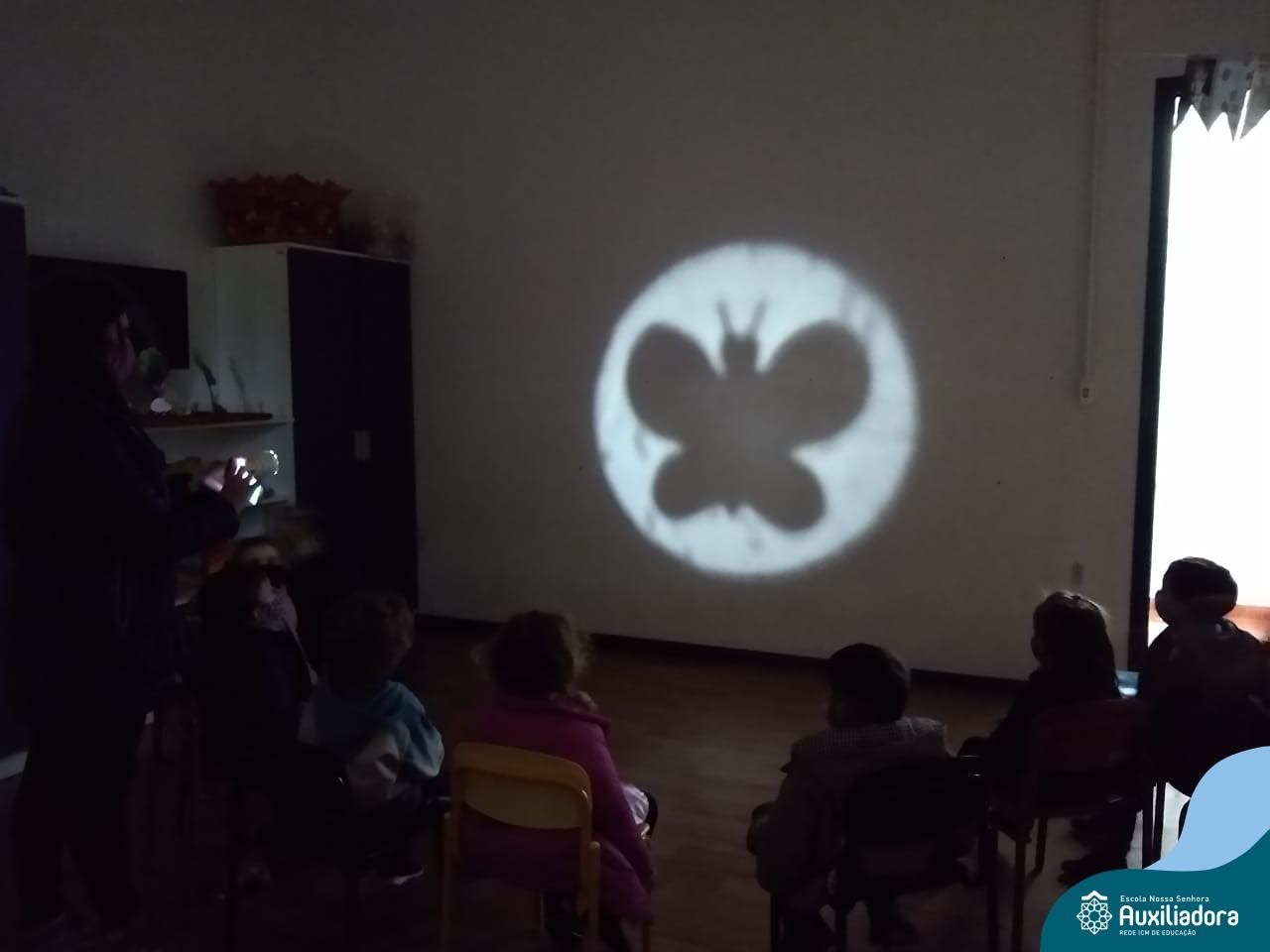 Os alunos foram convidados a observar as formas e formatos das sombras, onde os mesmos representavam alguns dos bichinhos do jardim. Após este momento, foi possível os alunos brincarem criando outras formas usando as mãos e partes do corpo.