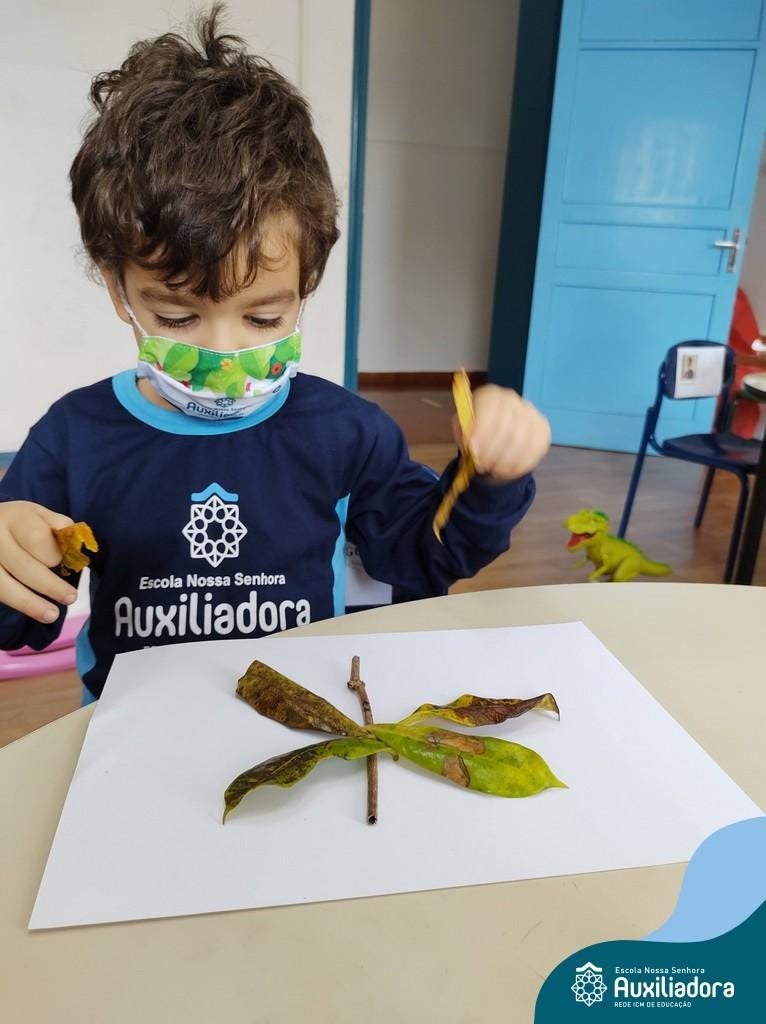 Com o intuito de proporcionar experiências significativas e explorar a imaginação e a criatividade dos nossos alunos, foram utilizados diversos materiais não estruturados para a construção dos Bichinhos de Jardim, como folhas e galhos secos, recolhidos pelos alunos no pátio da Escola.