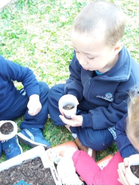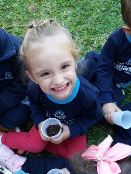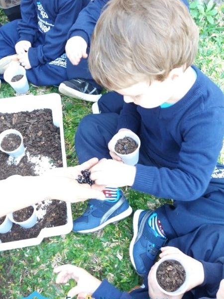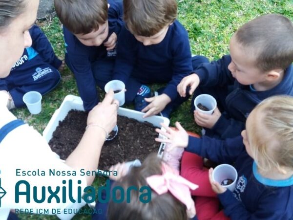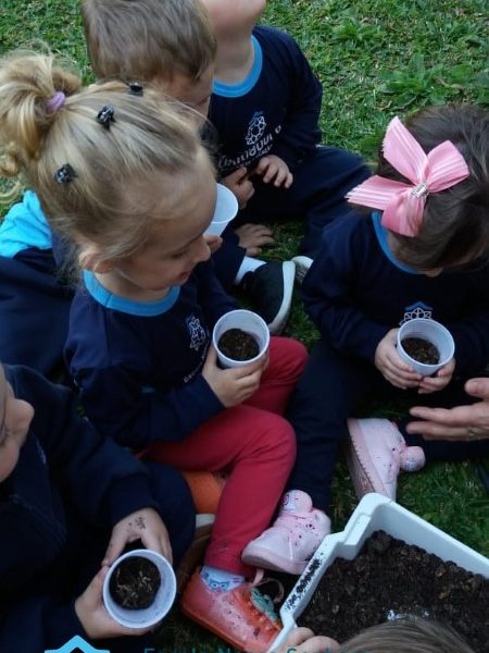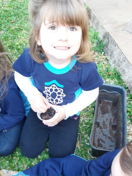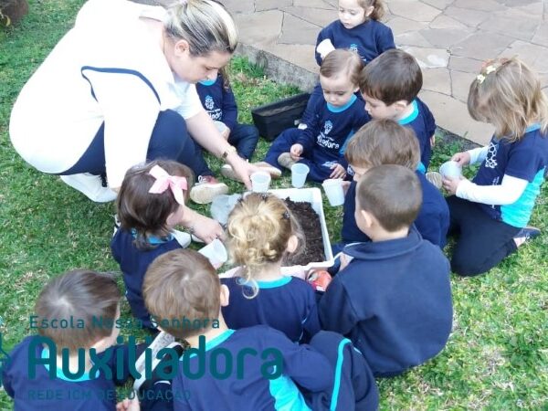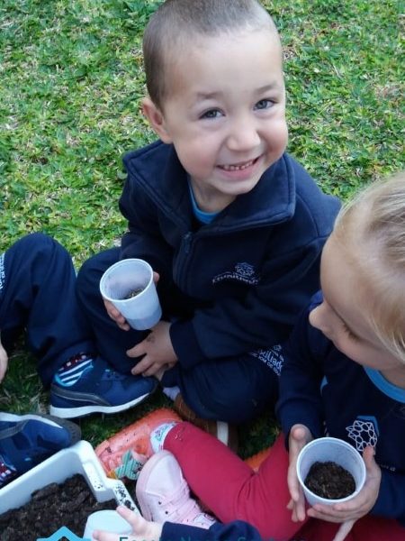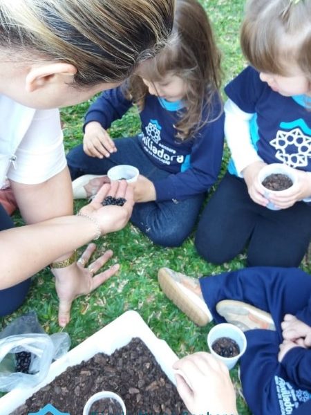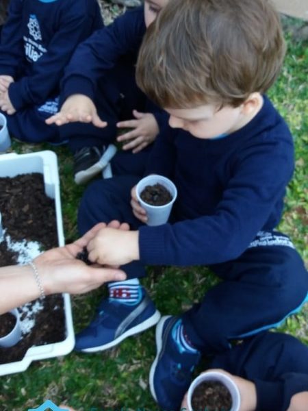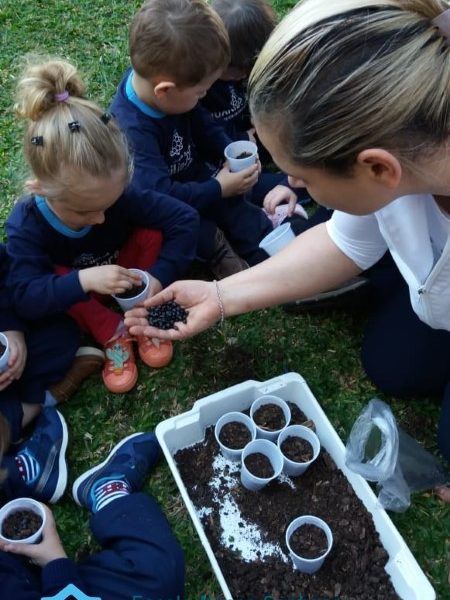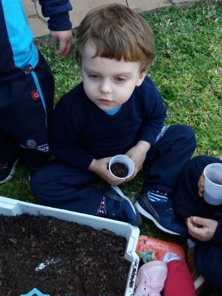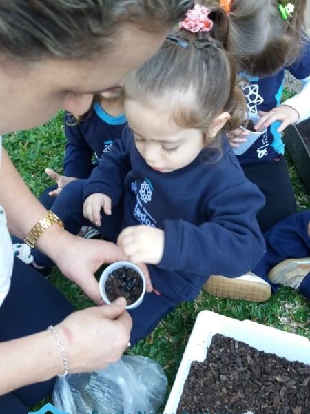 Para iniciar o projeto “Contos de Fadas” com a história: João e o pé de feijão, a turma do Maternal 1 experienciou o plantio do feijão.