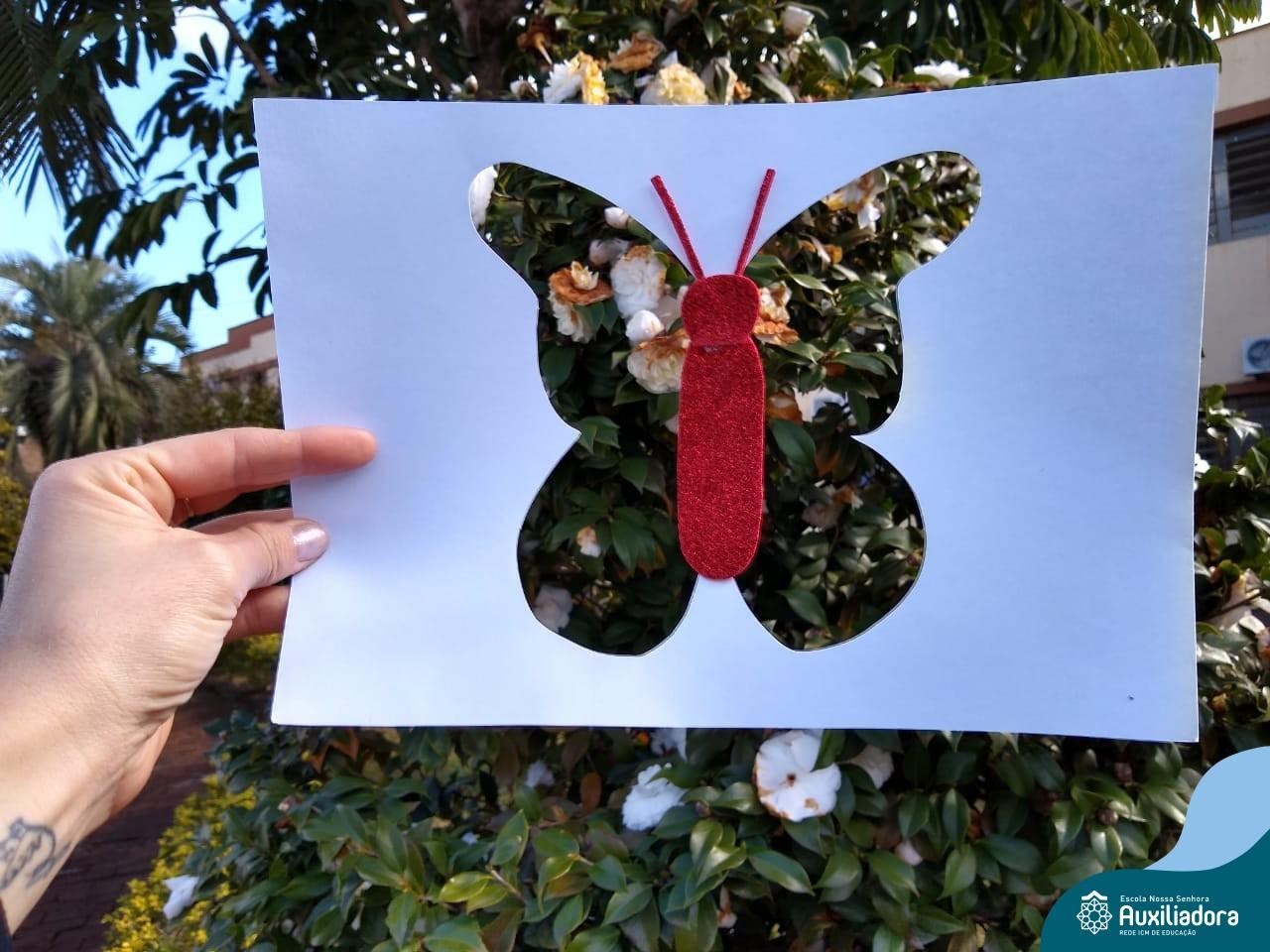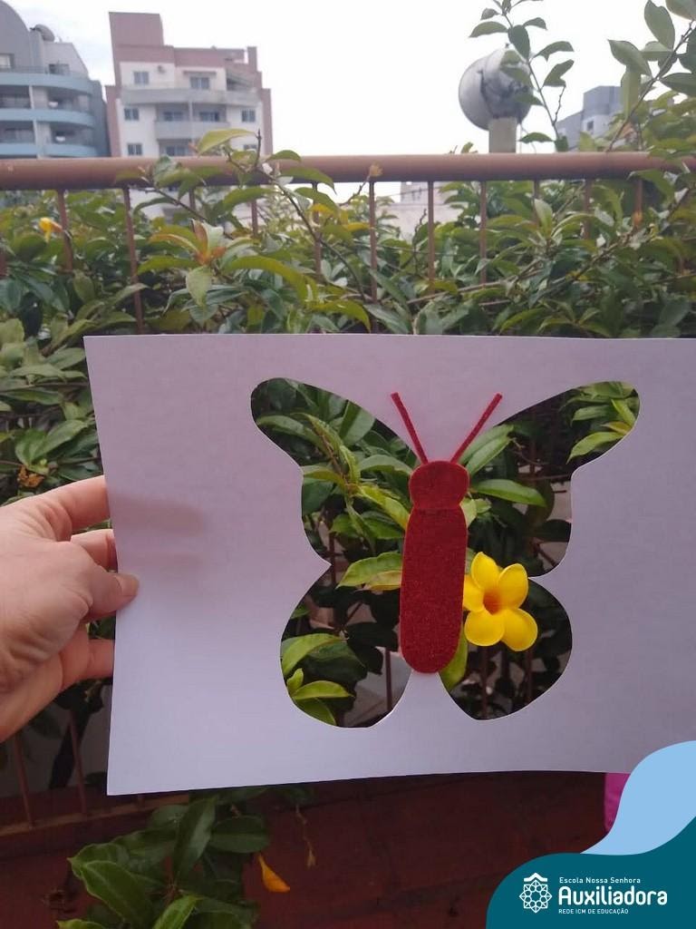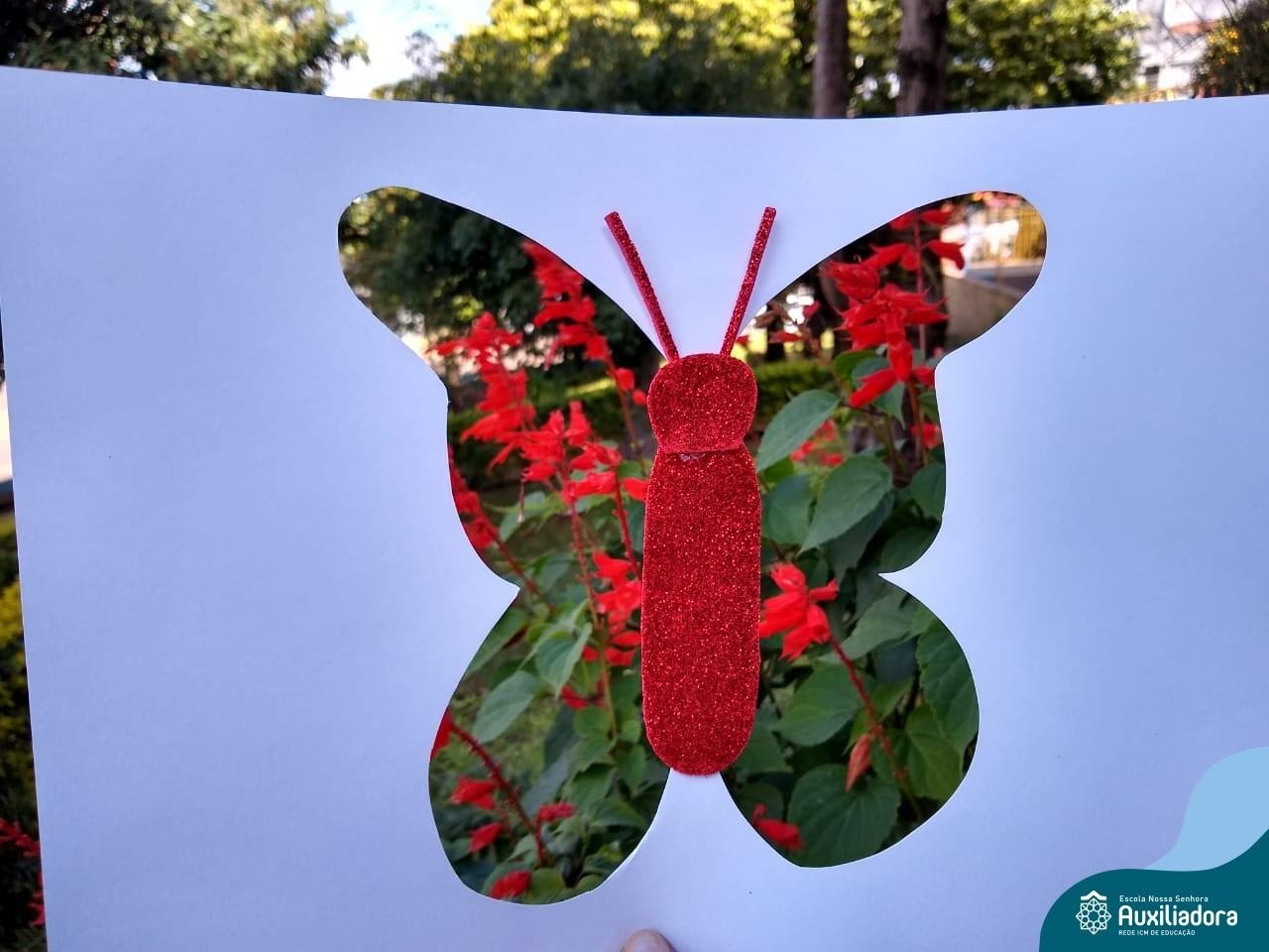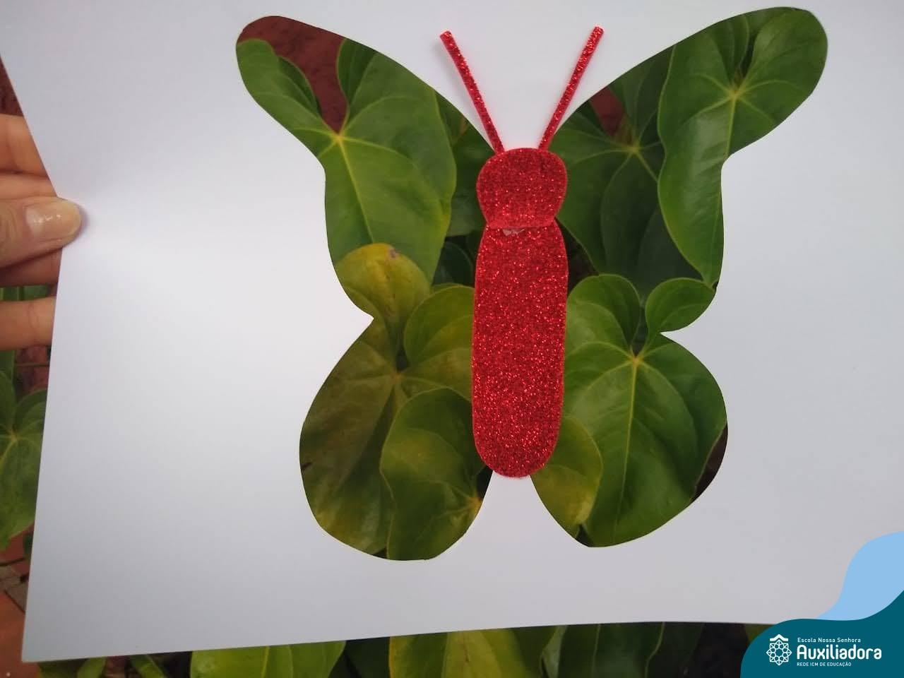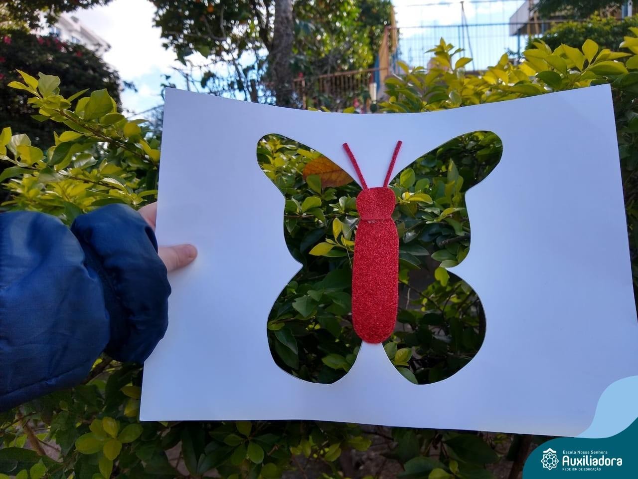 Com o intuito de explorar pelas cores, texturas e espécies de plantas existentes no pátio da nossa Escola, onde vivem os bichinhos do jardim, foi realizada a atividade com a seguinte pergunta: “Como seria essa borboleta se suas asas fossem assim?”