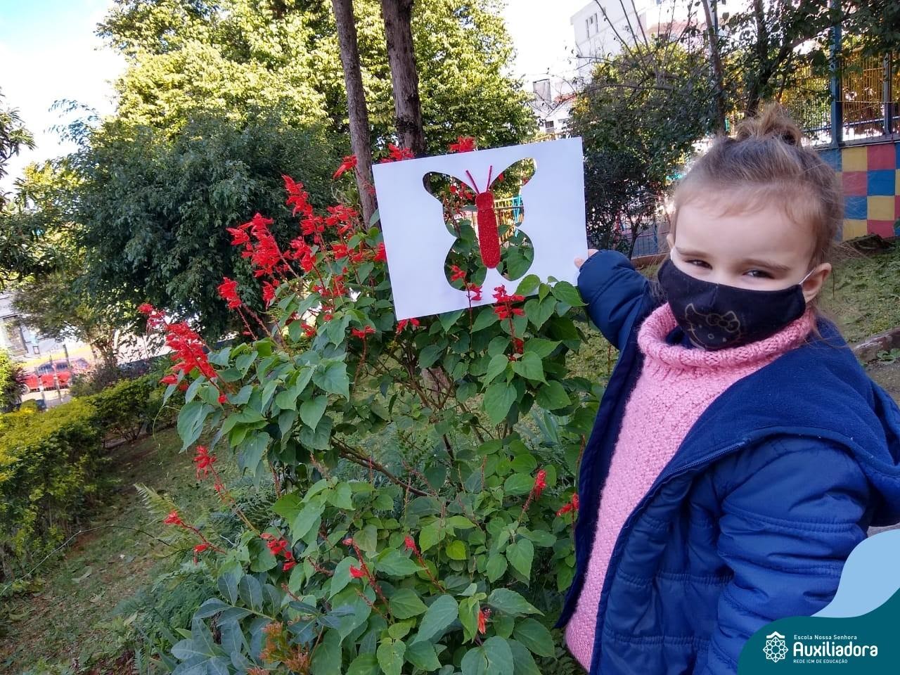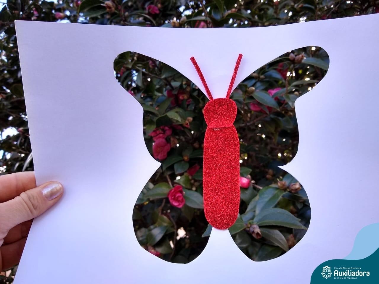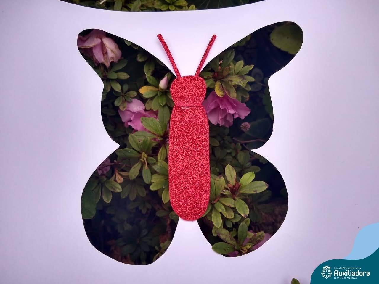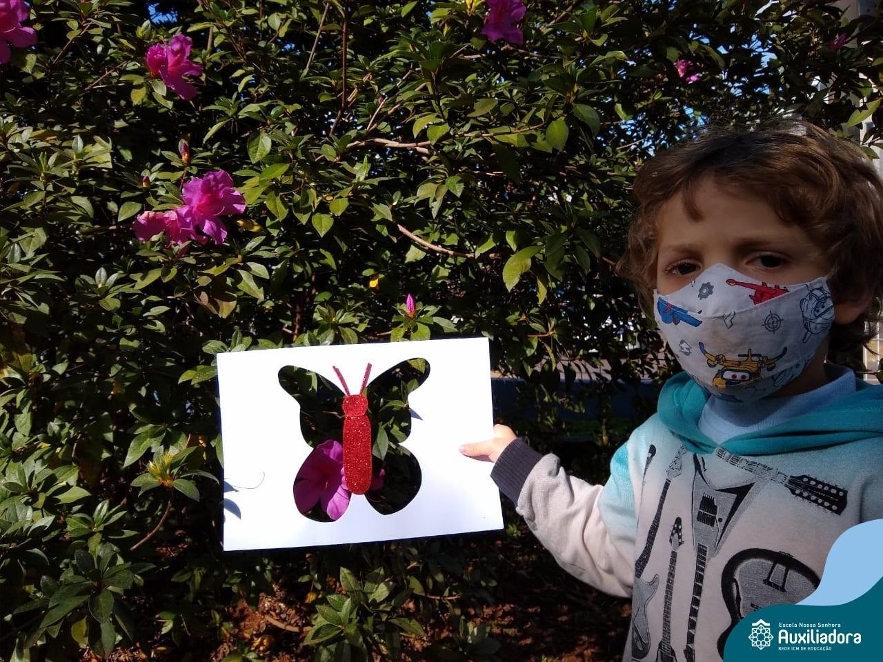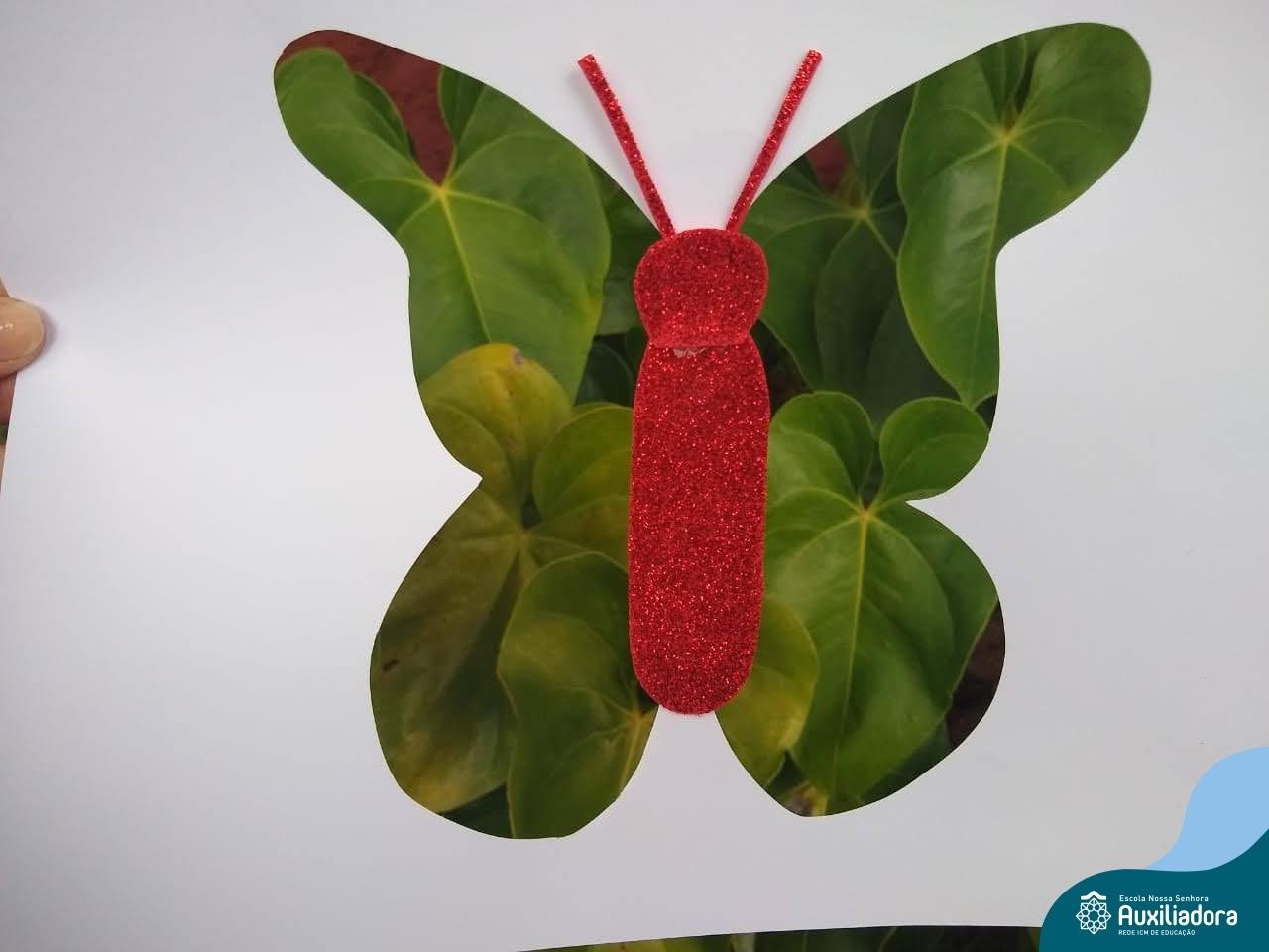 Com o intuito de explorar pelas cores, texturas e espécies de plantas existentes no pátio da nossa Escola, onde vivem os bichinhos do jardim, foi realizada a atividade com a seguinte pergunta: “Como seria essa borboleta se suas asas fossem assim?”