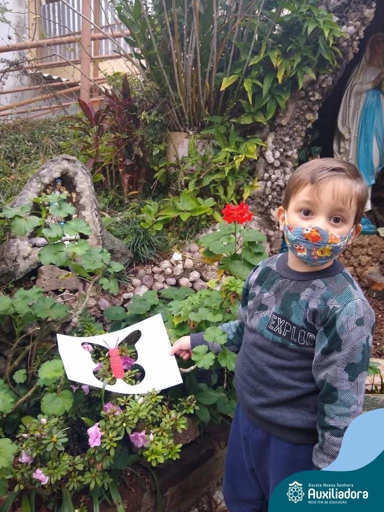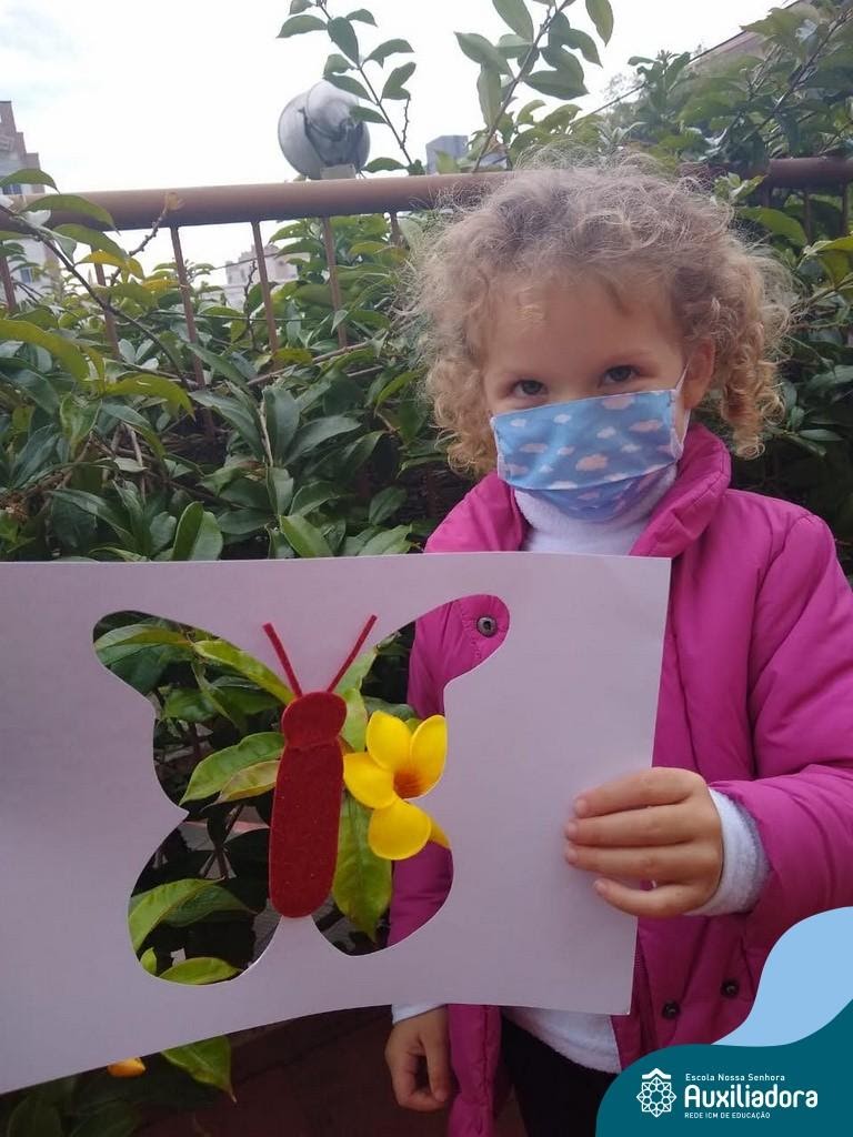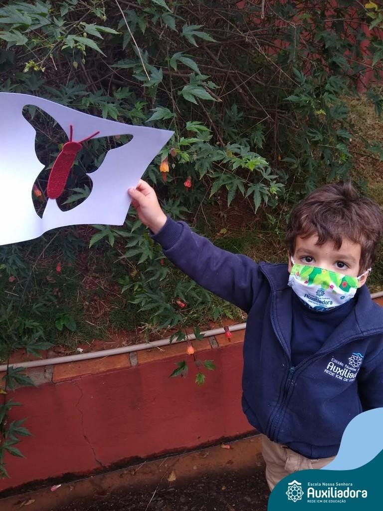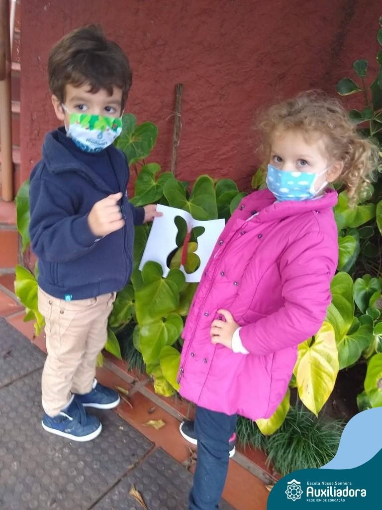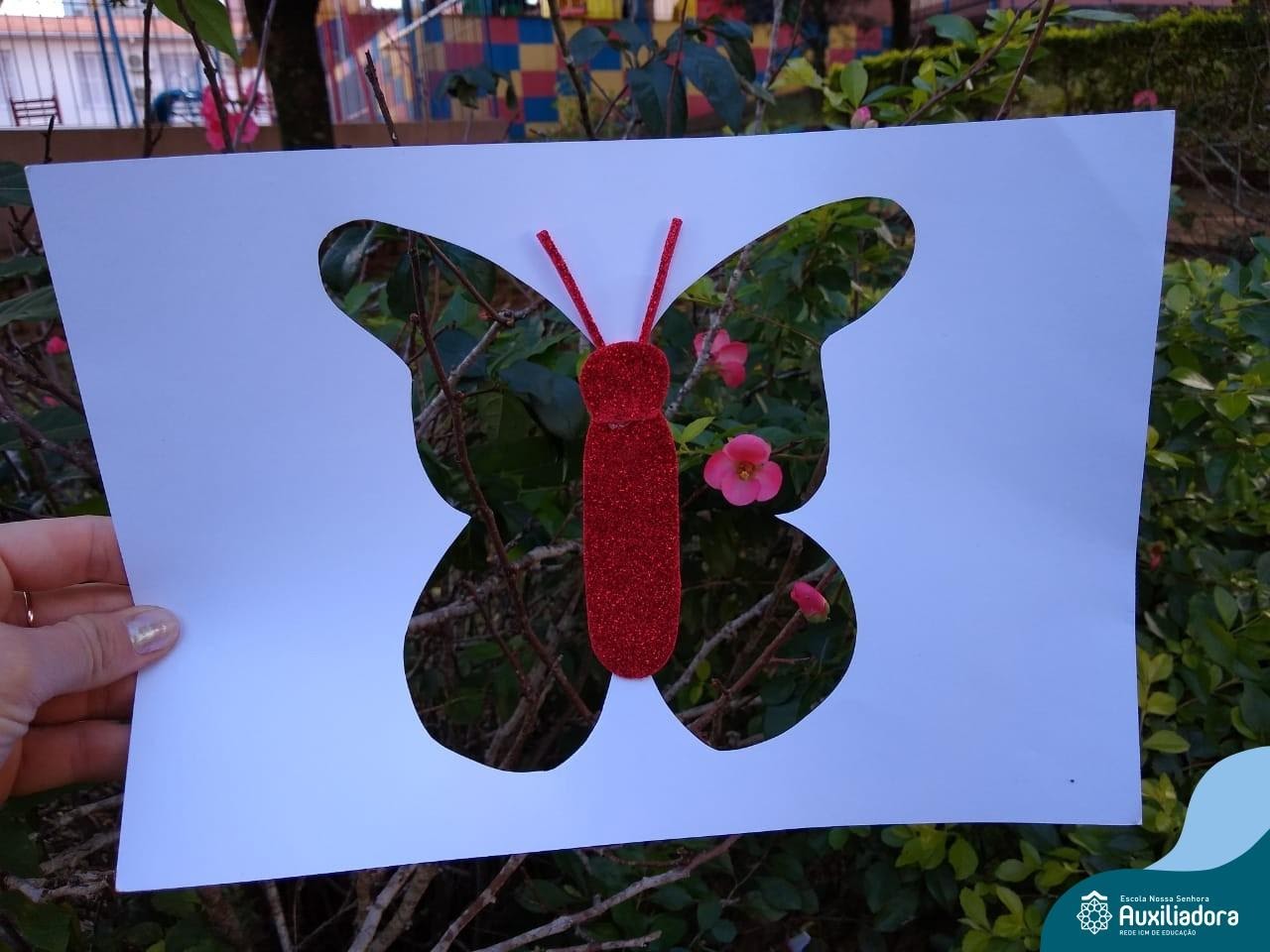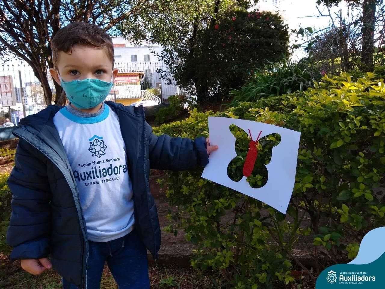 Com o intuito de explorar pelas cores, texturas e espécies de plantas existentes no pátio da nossa Escola, onde vivem os bichinhos do jardim, foi realizada a atividade com a seguinte pergunta: “Como seria essa borboleta se suas asas fossem assim?”