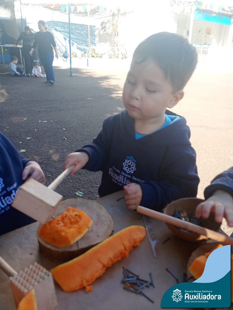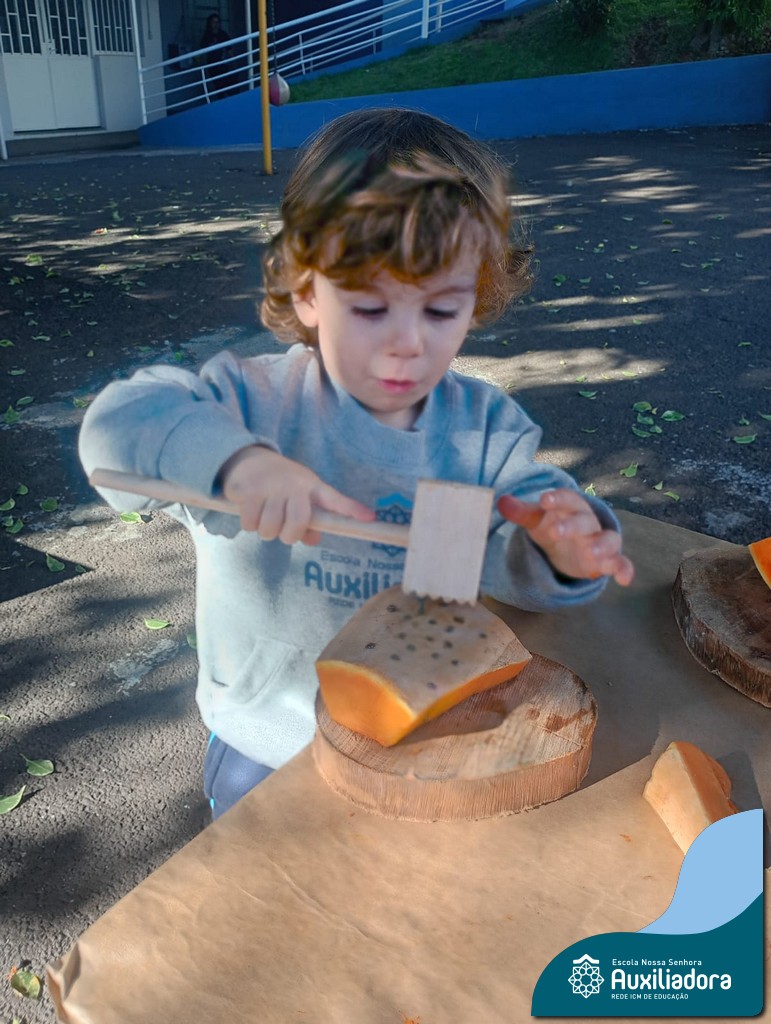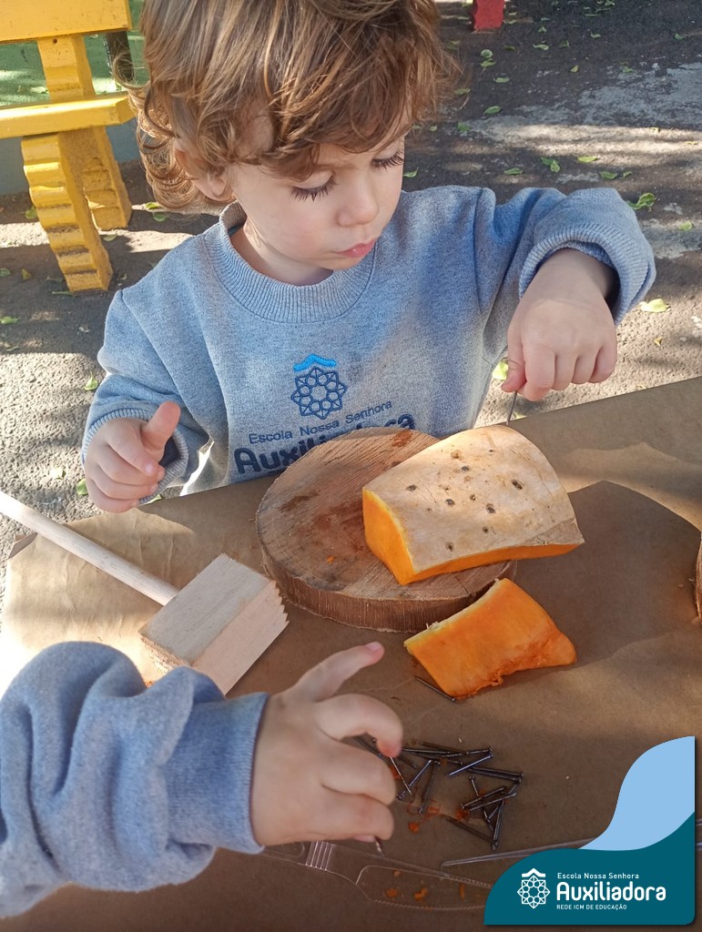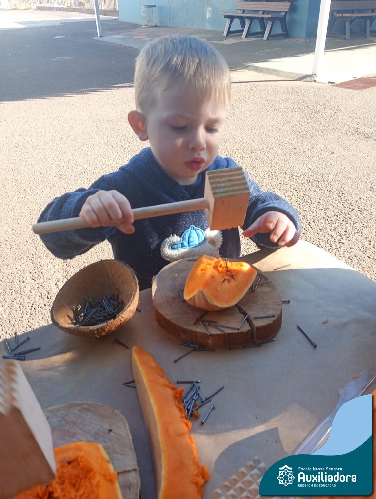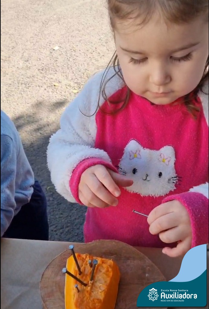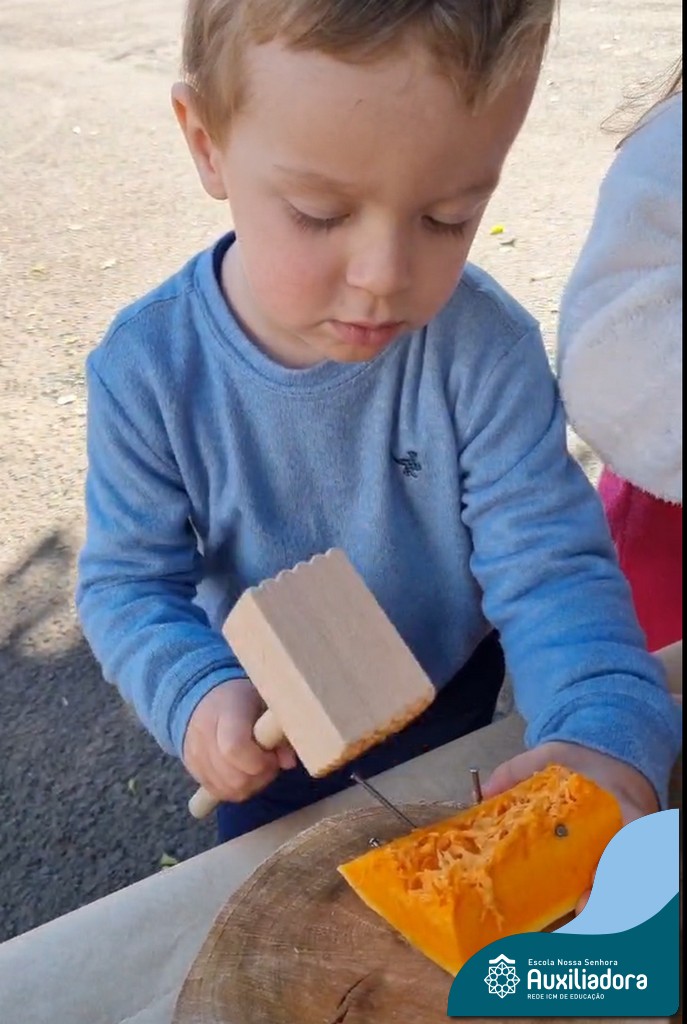 Em mais uma experiência de exploração sensorial e motora, as crianças tiveram a oportunidade de interagir com uma grande abóbora utilizando martelos e pregos, em um convite à investigação, à coordenação e à criatividade. A proposta despertou curiosidade, concentração e entusiasmo, permitindo que cada criança deixasse sua marca e experimentasse novas possibilidades de movimento e força.