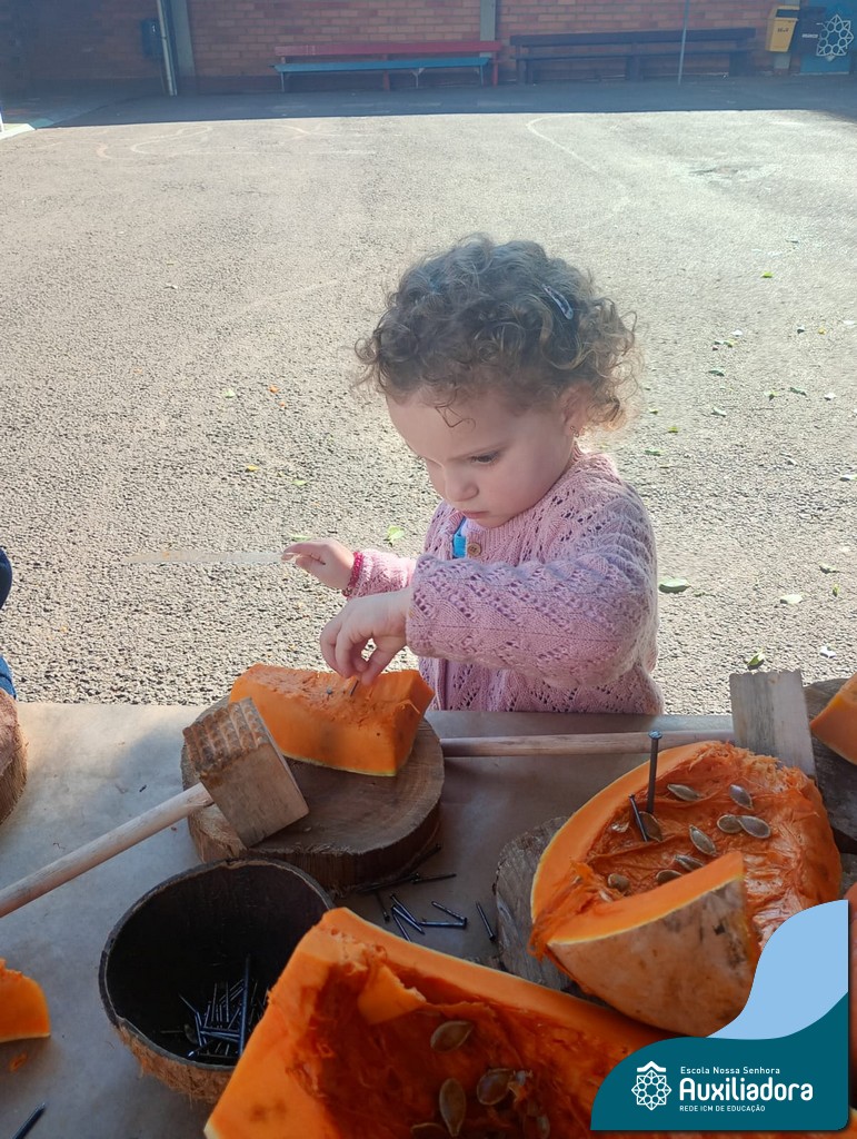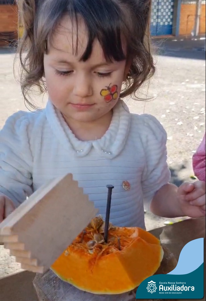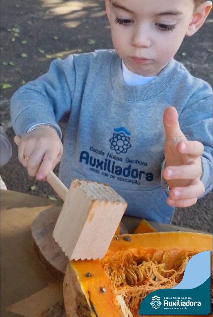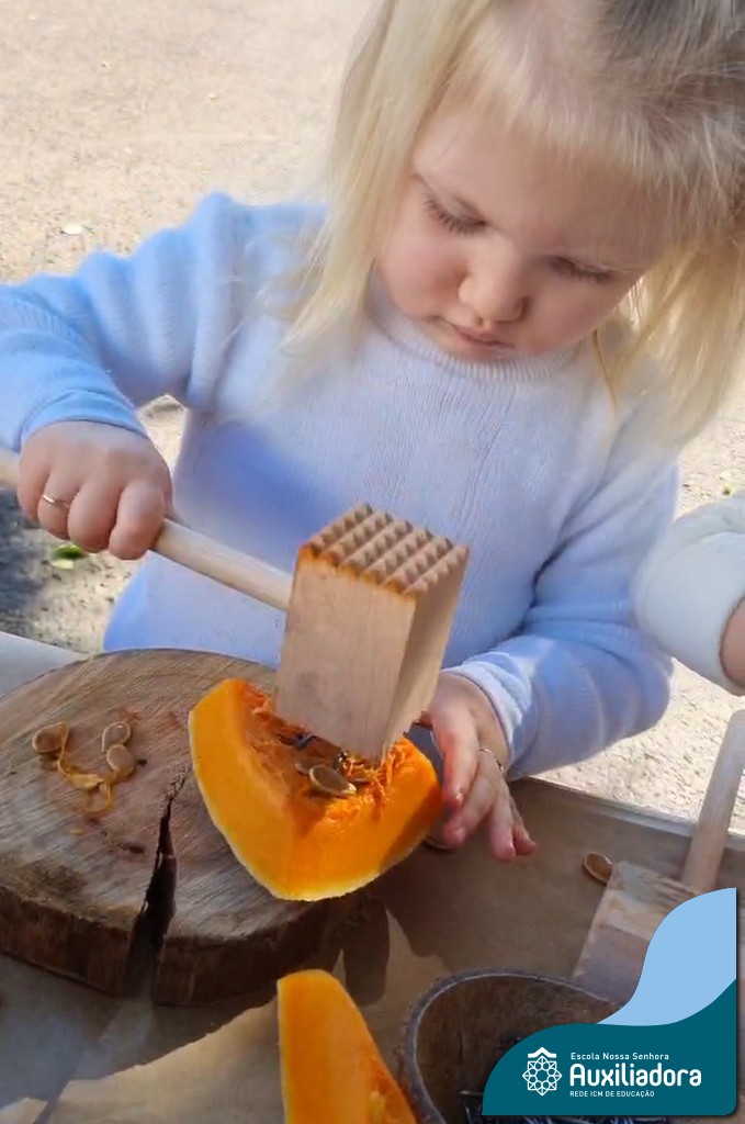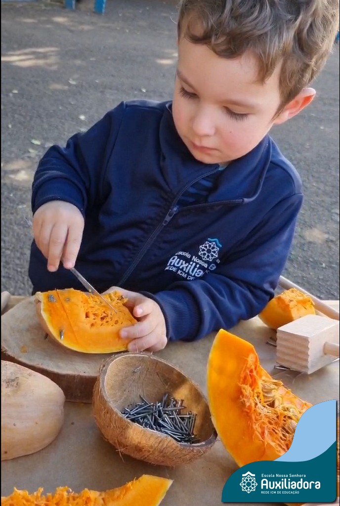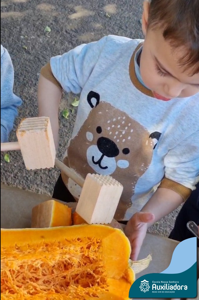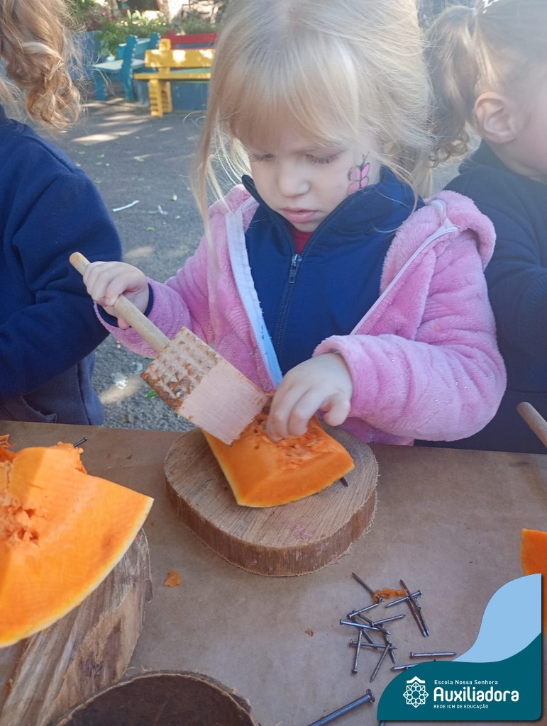 Em mais uma experiência de exploração sensorial e motora, as crianças tiveram a oportunidade de interagir com uma grande abóbora utilizando martelos e pregos, em um convite à investigação, à coordenação e à criatividade. A proposta despertou curiosidade, concentração e entusiasmo, permitindo que cada criança deixasse sua marca e experimentasse novas possibilidades de movimento e força.