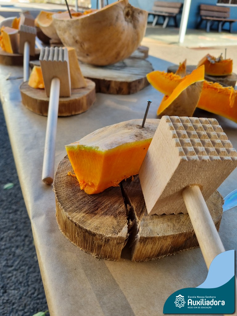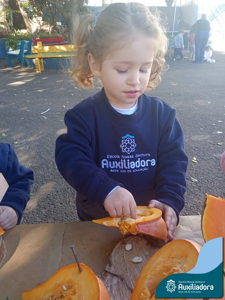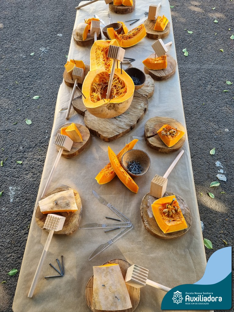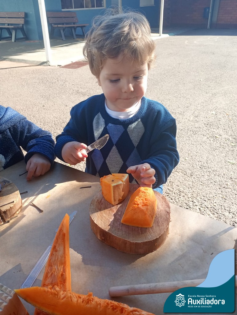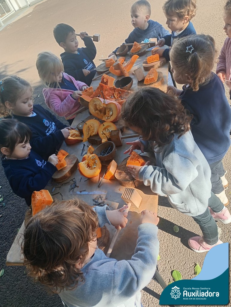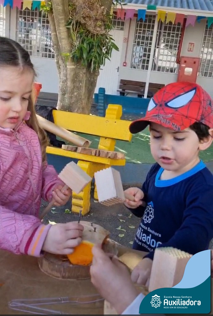 Em mais uma experiência de exploração sensorial e motora, as crianças tiveram a oportunidade de interagir com uma grande abóbora utilizando martelos e pregos, em um convite à investigação, à coordenação e à criatividade. A proposta despertou curiosidade, concentração e entusiasmo, permitindo que cada criança deixasse sua marca e experimentasse novas possibilidades de movimento e força.
