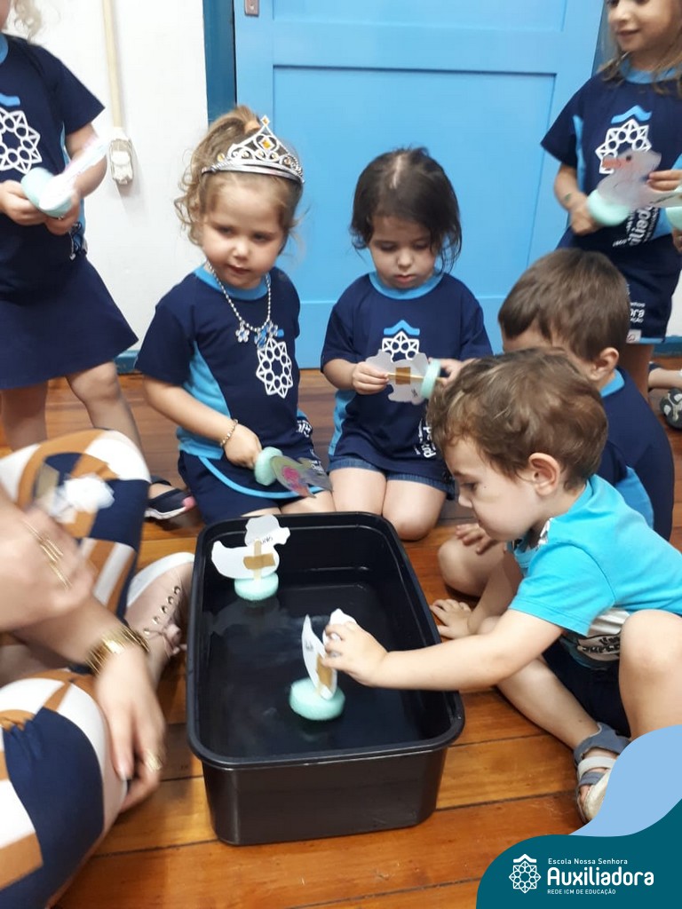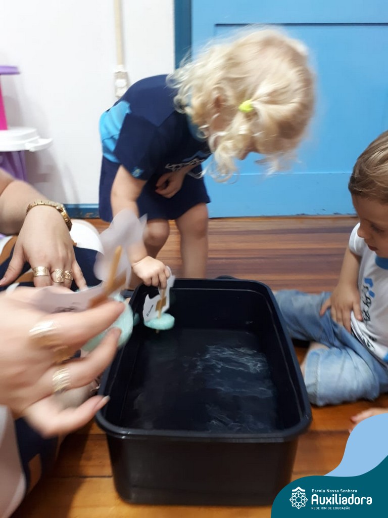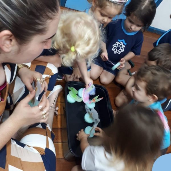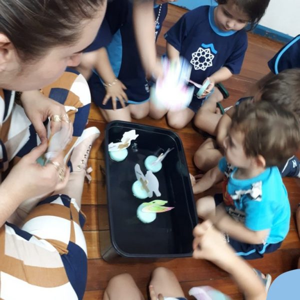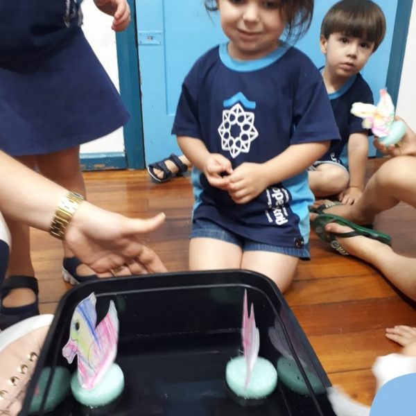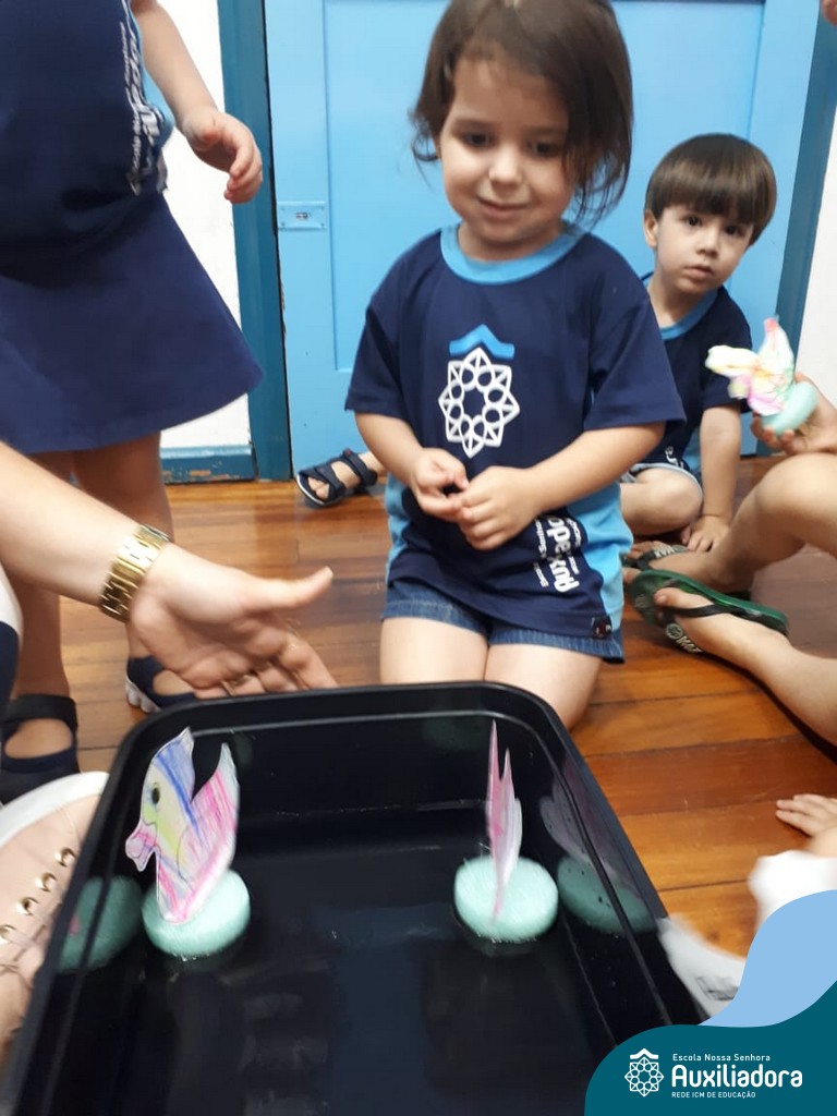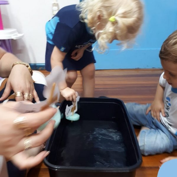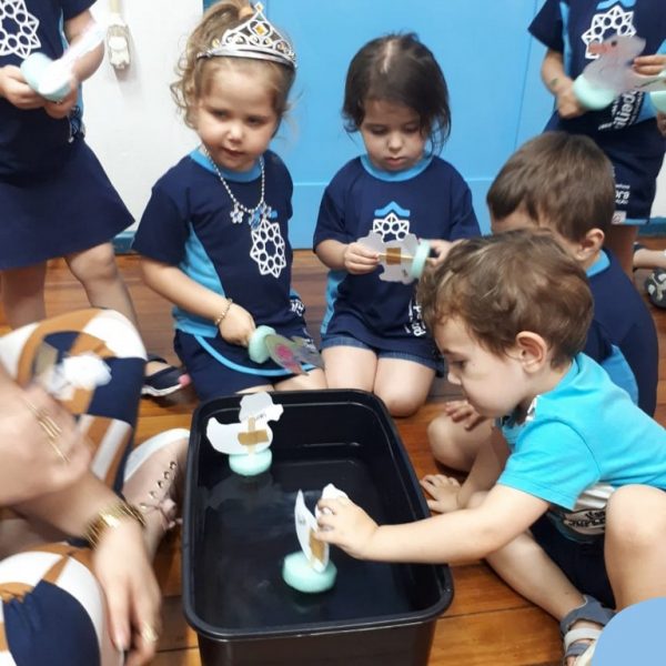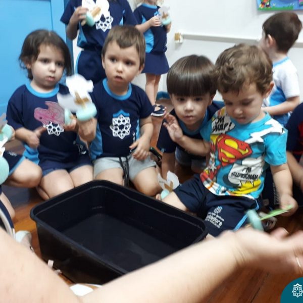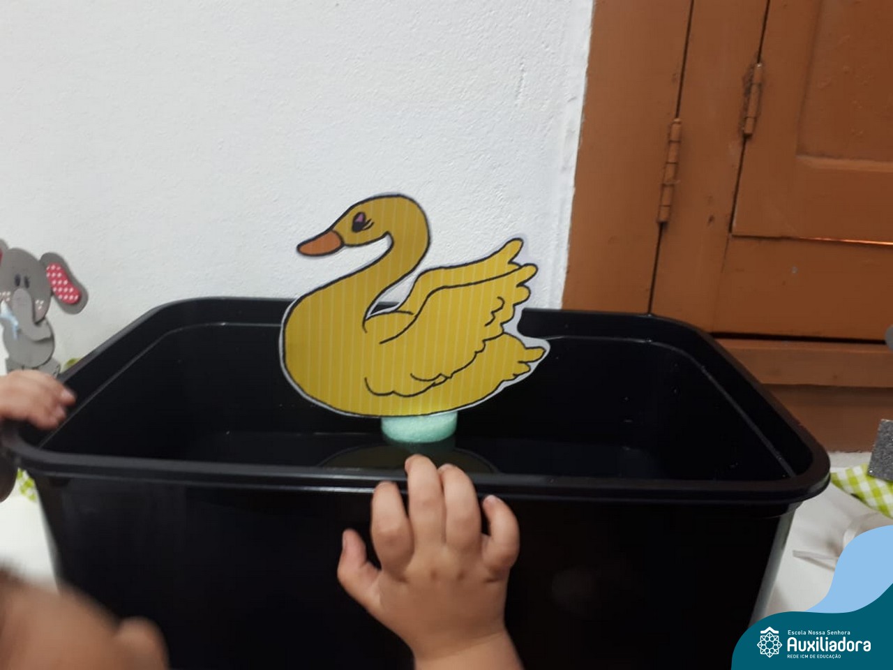 A turma do Maternal 1 B da Profe Jaque trabalhou os animais da Fazenda. A atividade que mais fez a alegria das crianças foi a do patinho flutuando na água, atividade sensorial que desenvolve a imaginação do aluno.