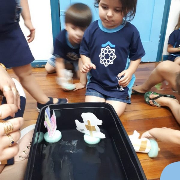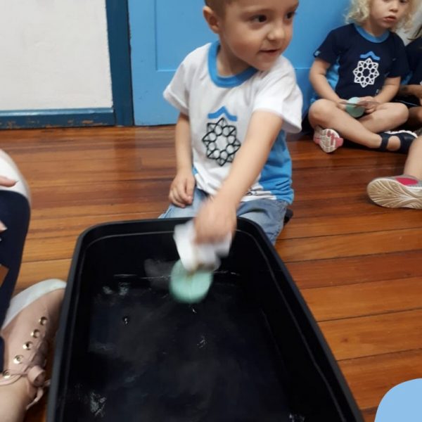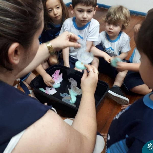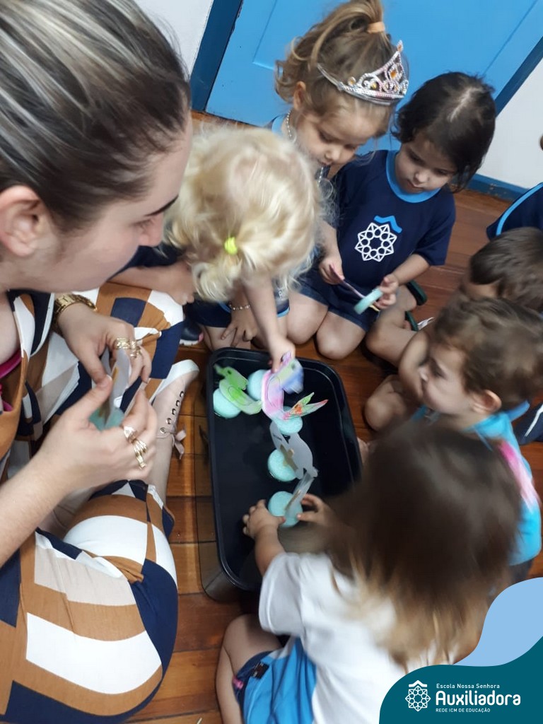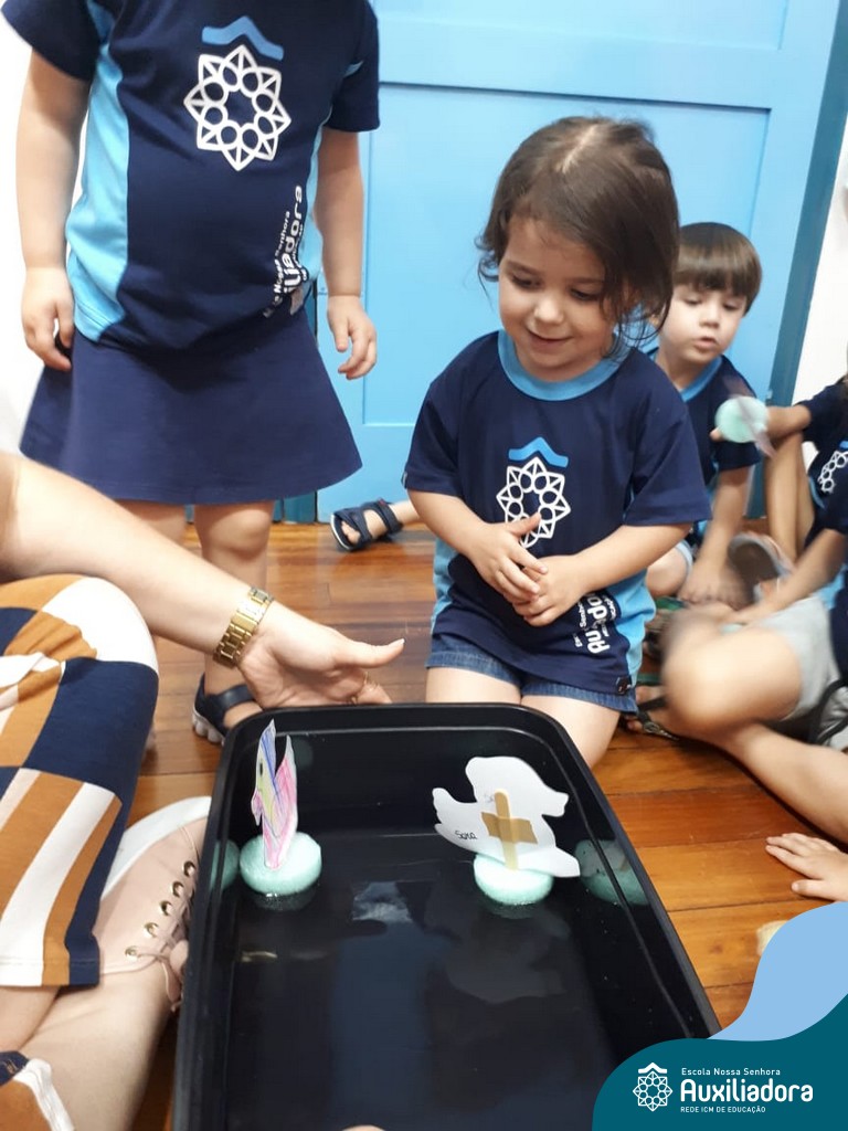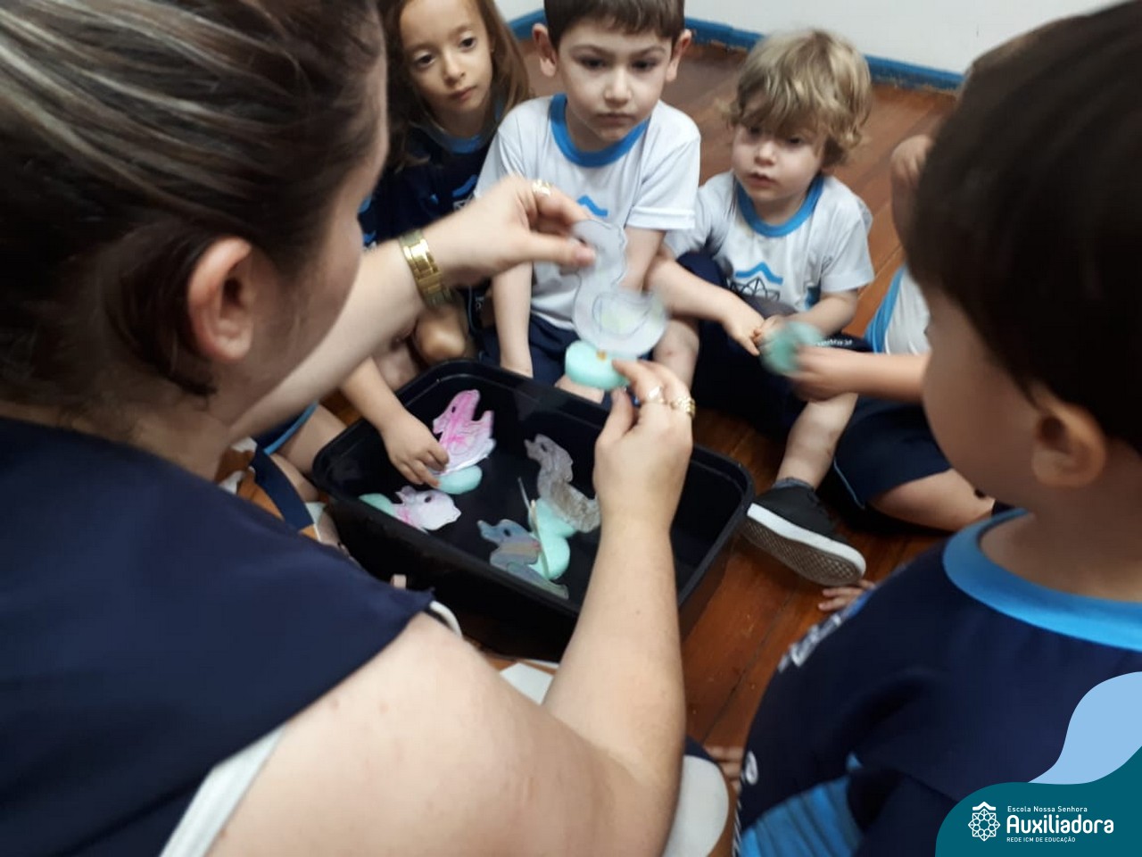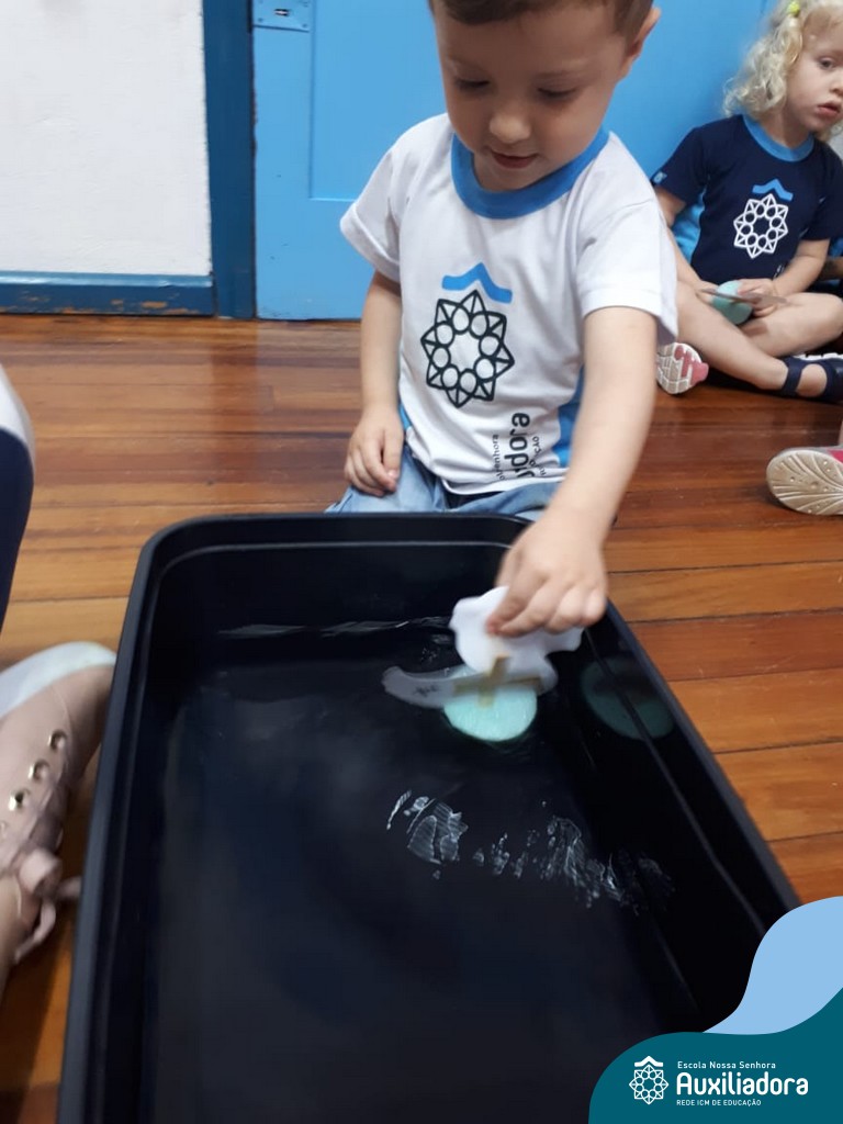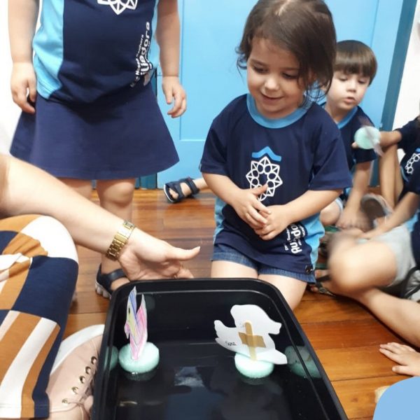 A turma do Maternal 1 B da Profe Jaque trabalhou os animais da Fazenda. A atividade que mais fez a alegria das crianças foi a do patinho flutuando na água, atividade sensorial que desenvolve a imaginação do aluno.