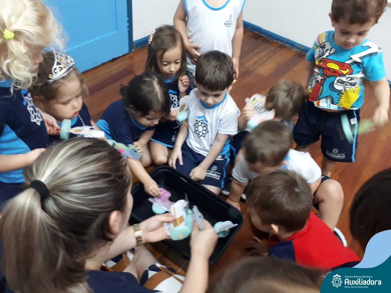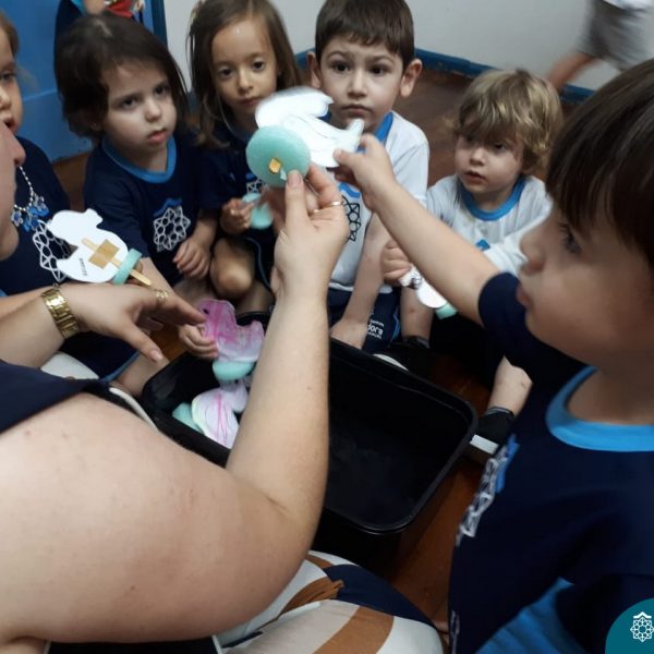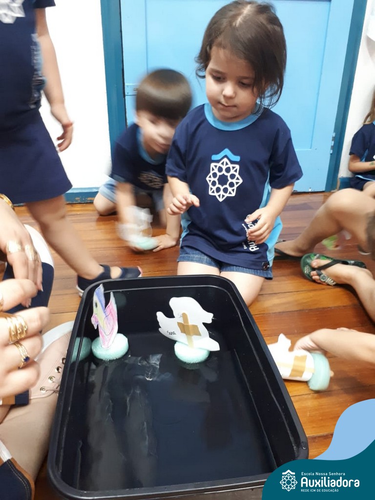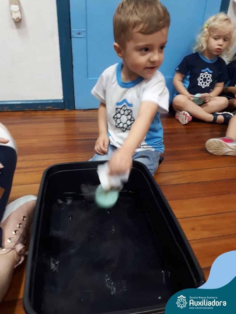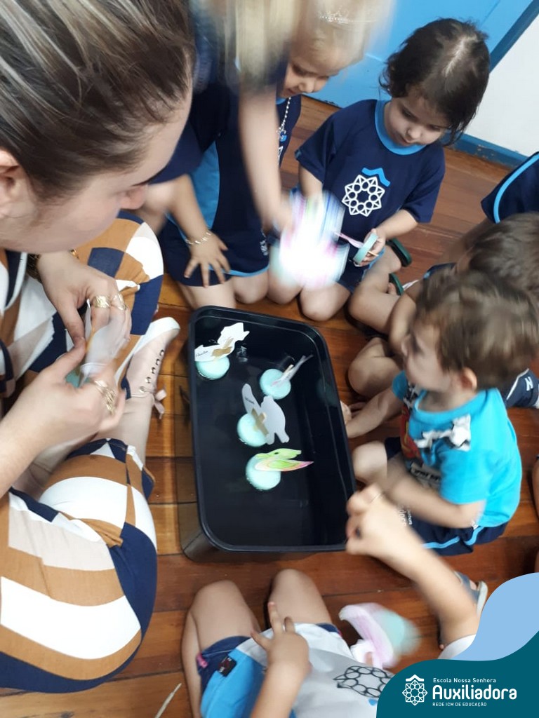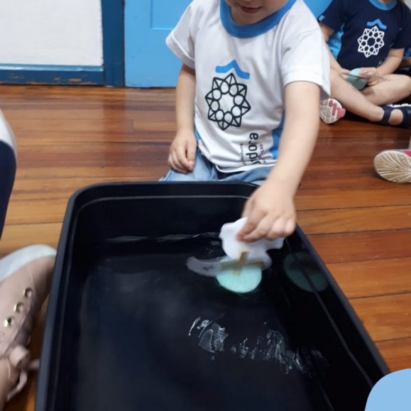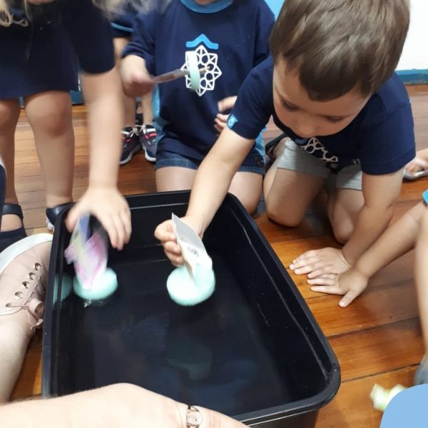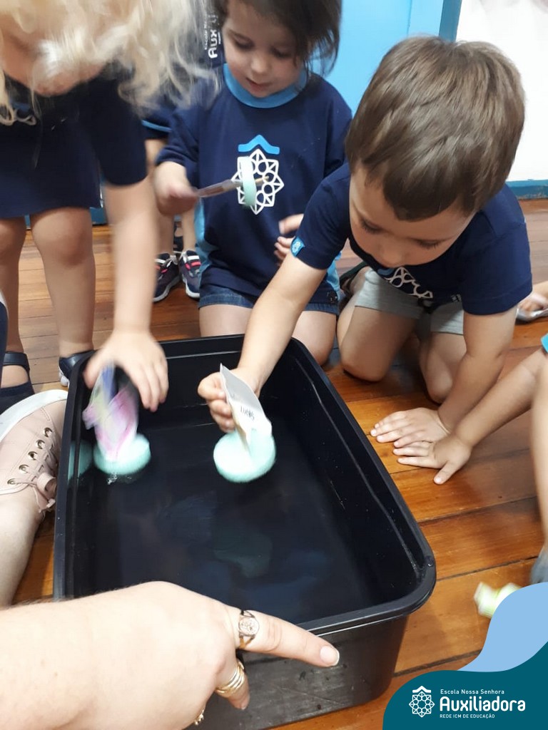 A turma do Maternal 1 B da Profe Jaque trabalhou os animais da Fazenda. A atividade que mais fez a alegria das crianças foi a do patinho flutuando na água, atividade sensorial que desenvolve a imaginação do aluno.
