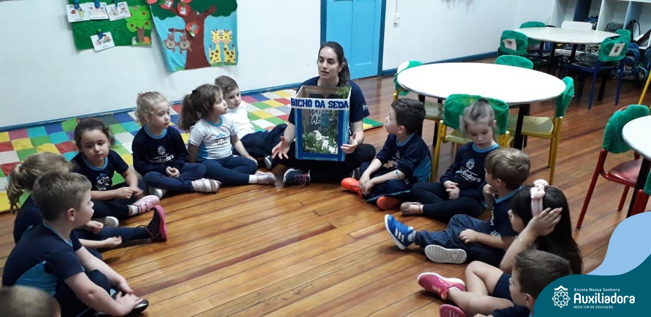 As crianças do Maternal 2 A conheceram a vida dos bichos da seda, com demonstração de fotos, vídeos, atividades e brincadeiras.