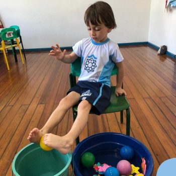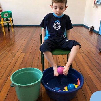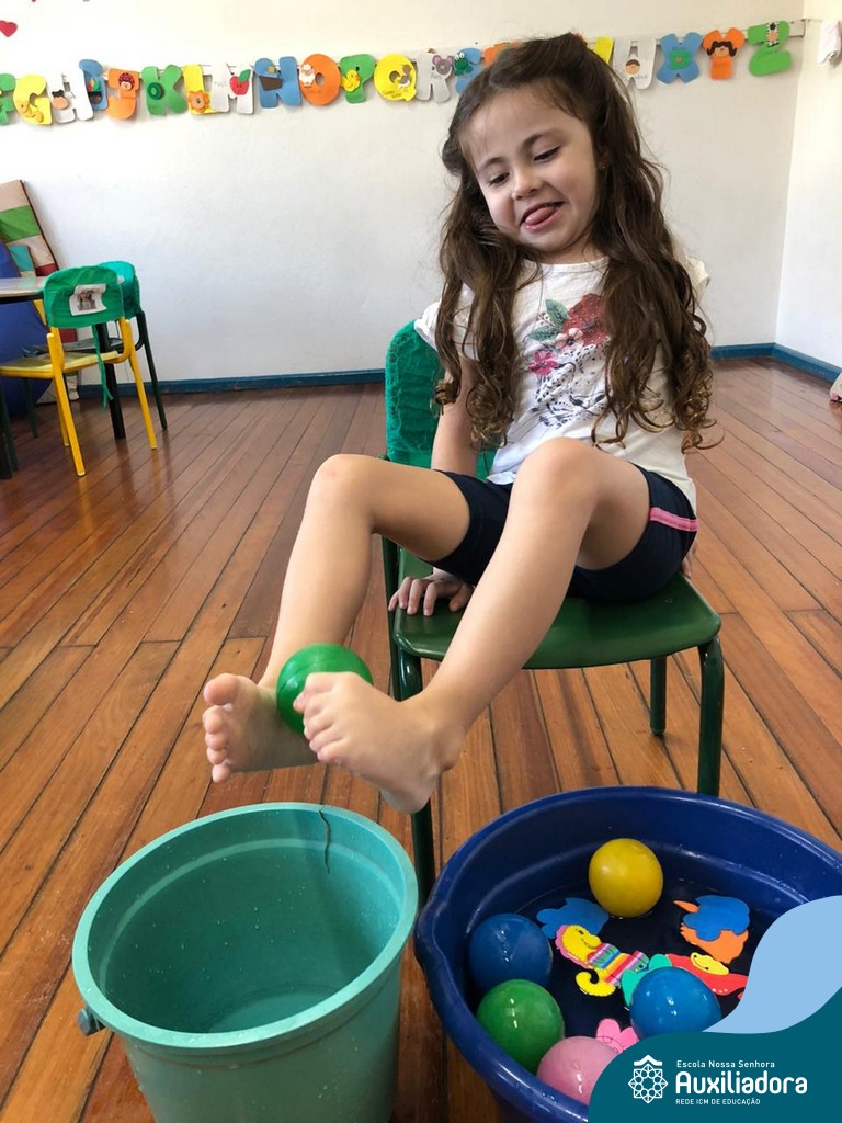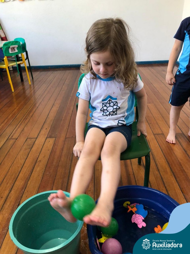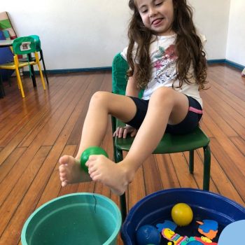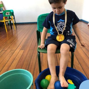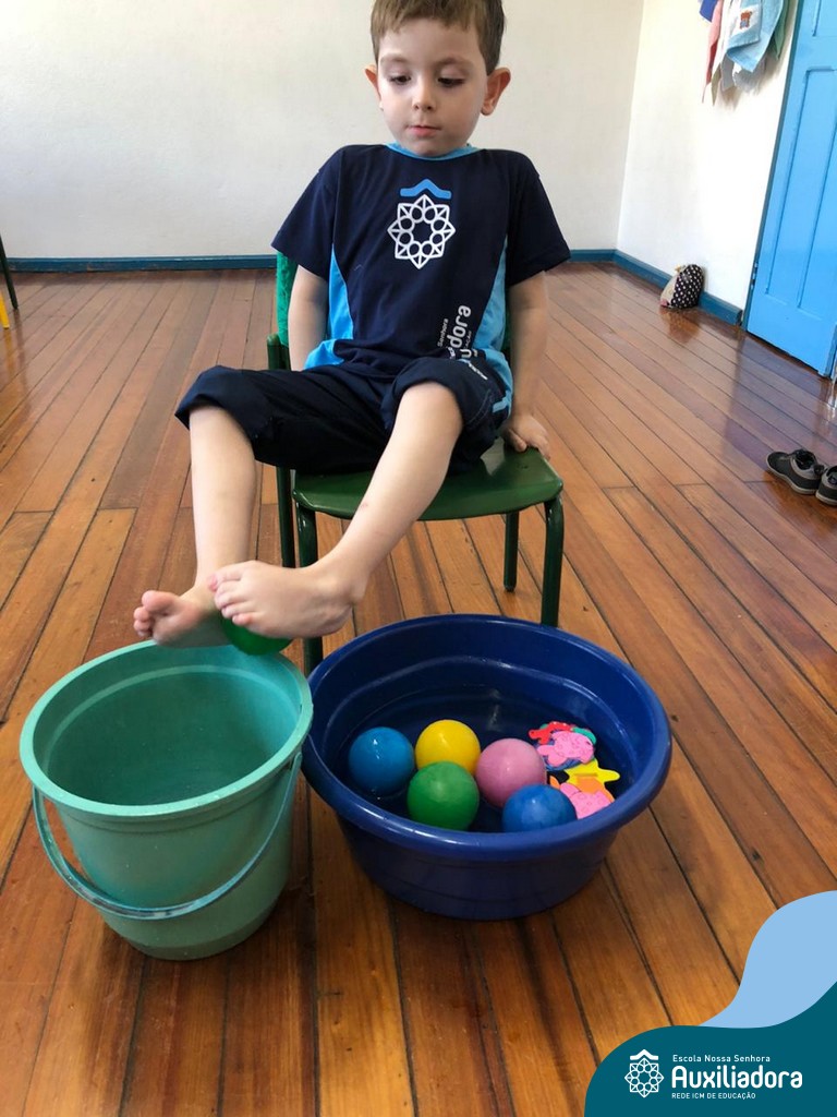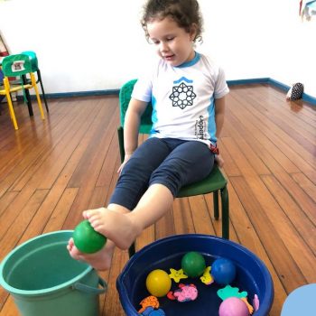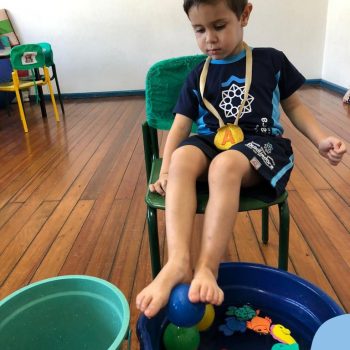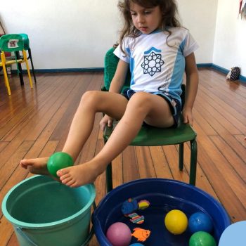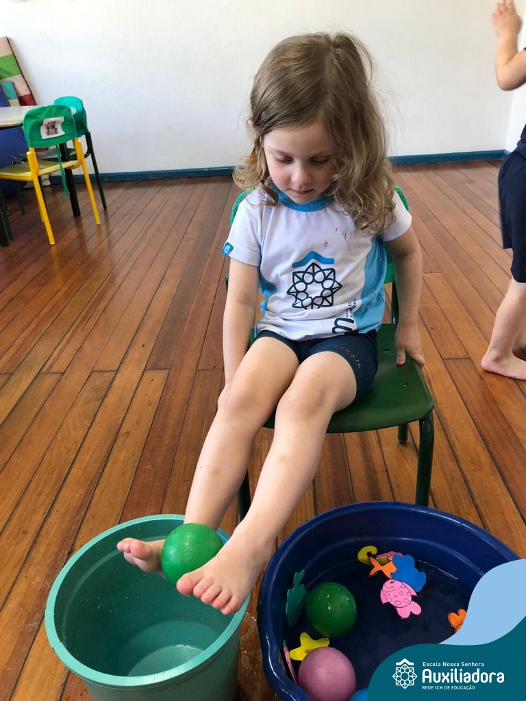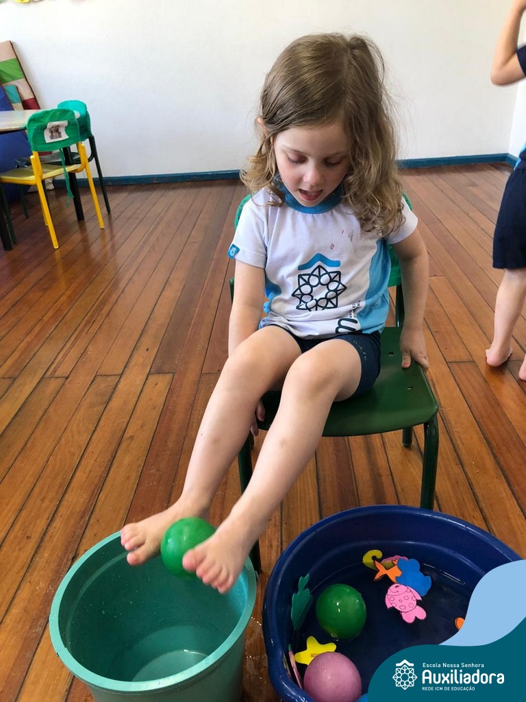-Um dos desafio era tirar as bolinhas (os lixos) do mar usando os pés!