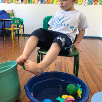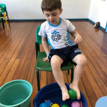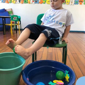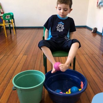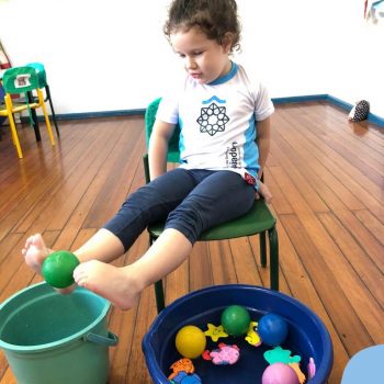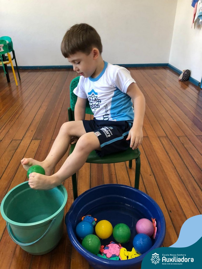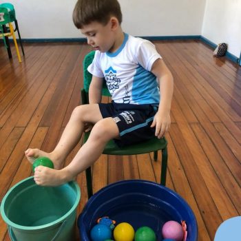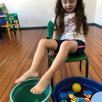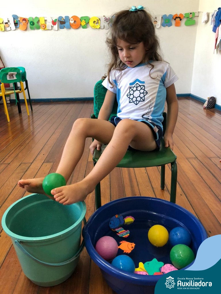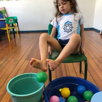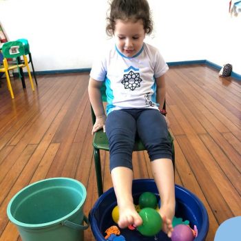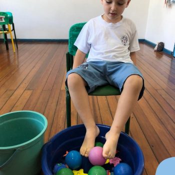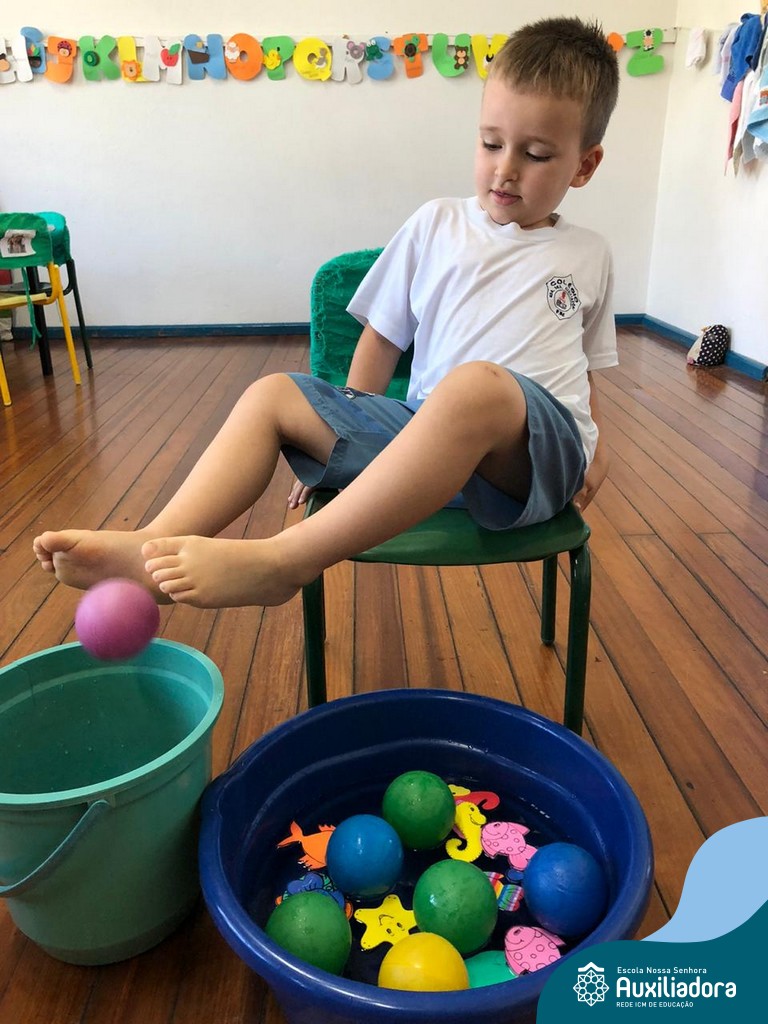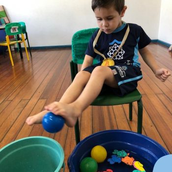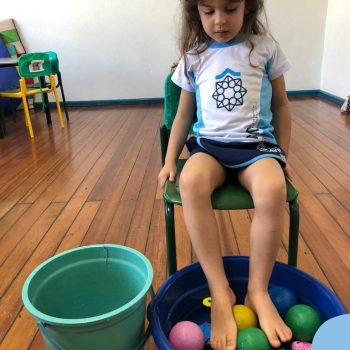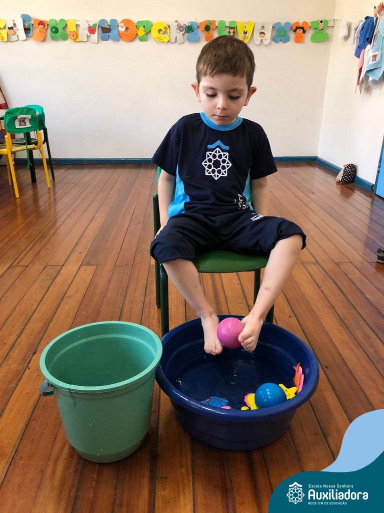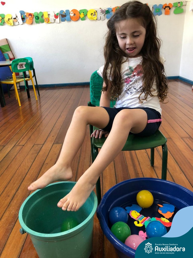 -Um dos desafio era tirar as bolinhas (os lixos) do mar usando os pés!