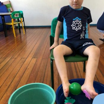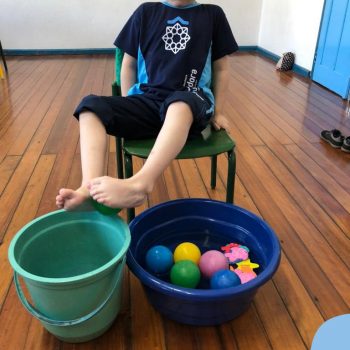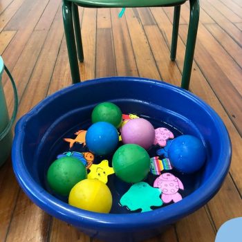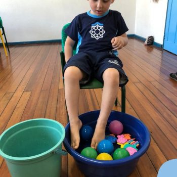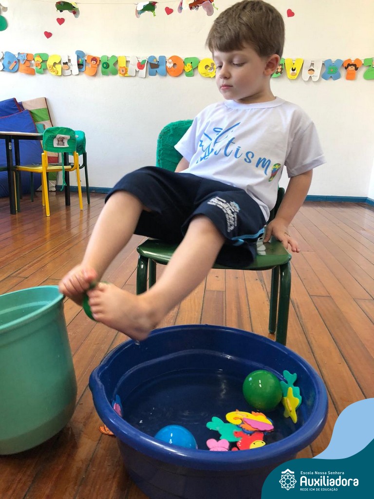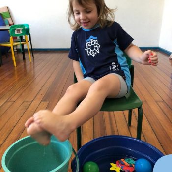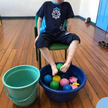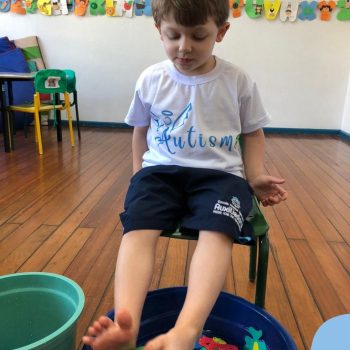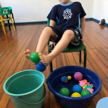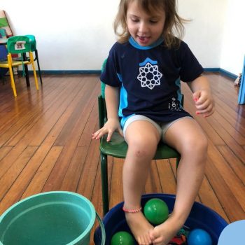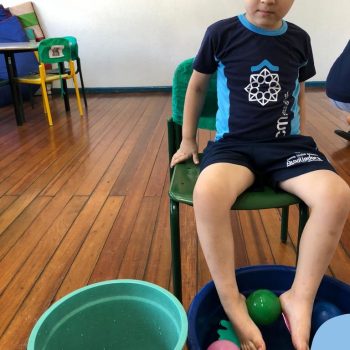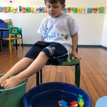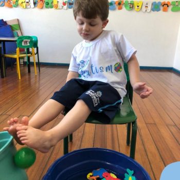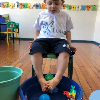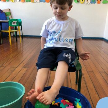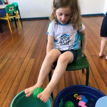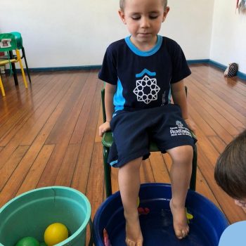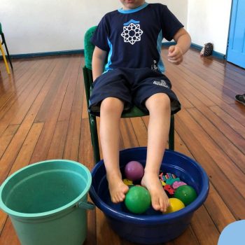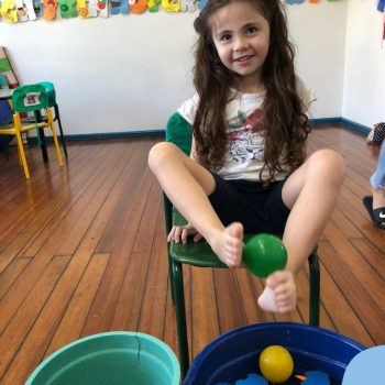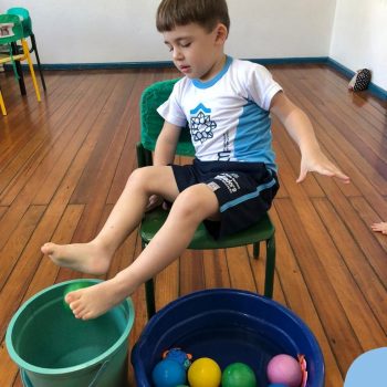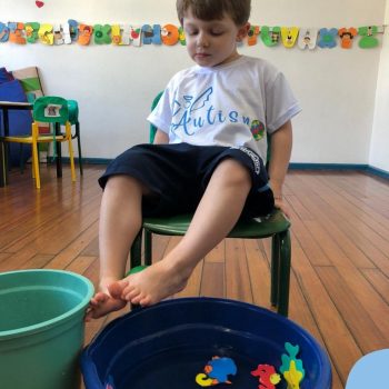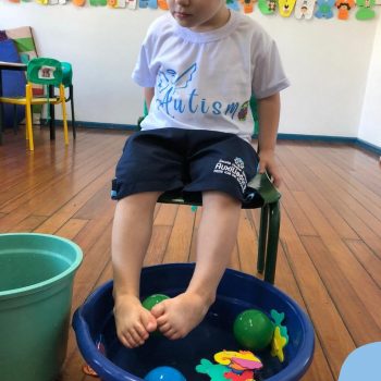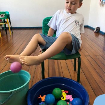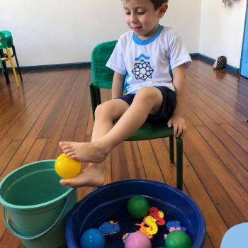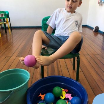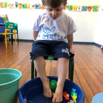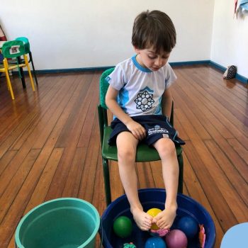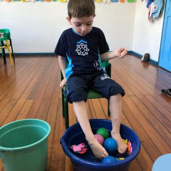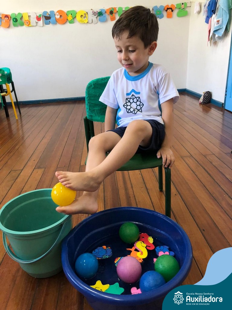 -Um dos desafio era tirar as bolinhas (os lixos) do mar usando os pés!