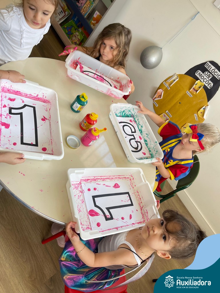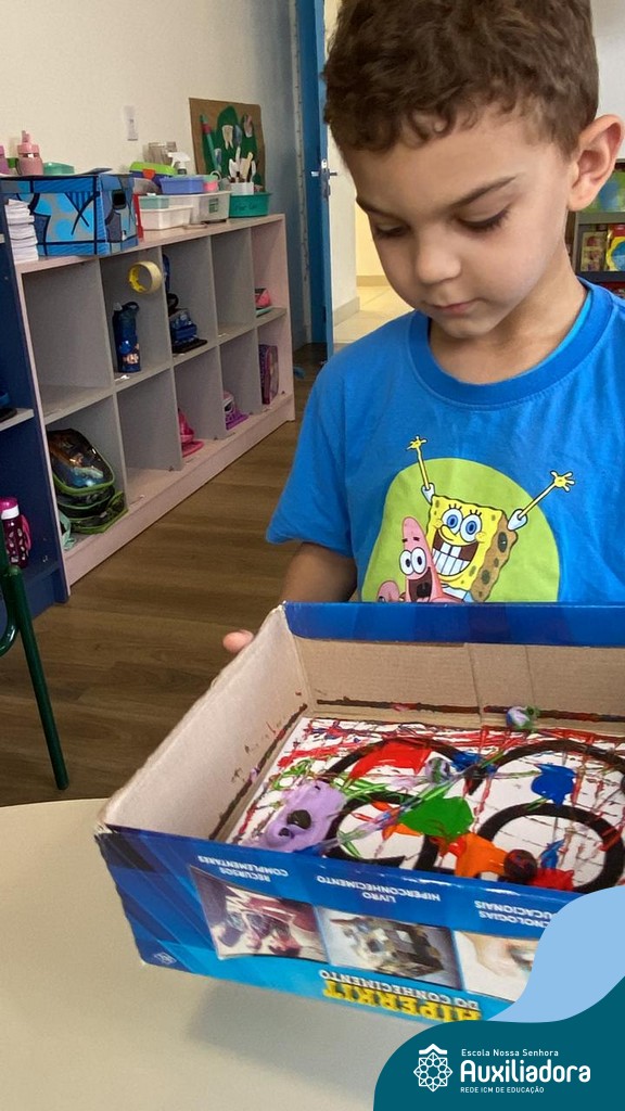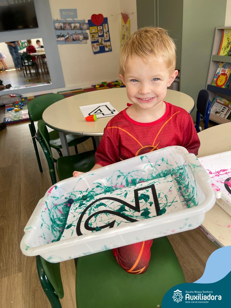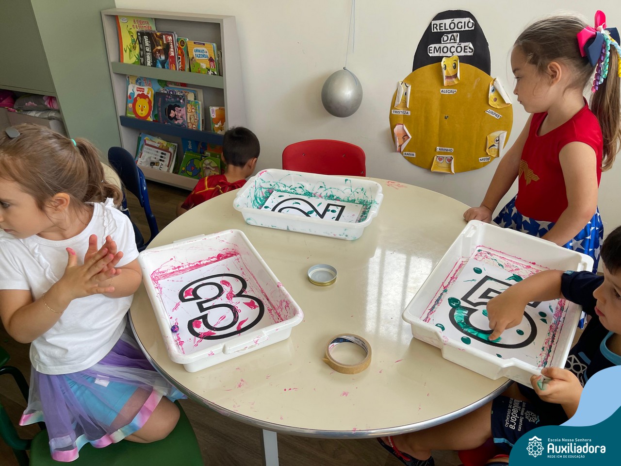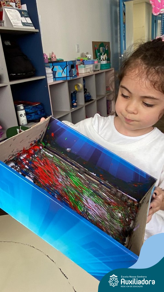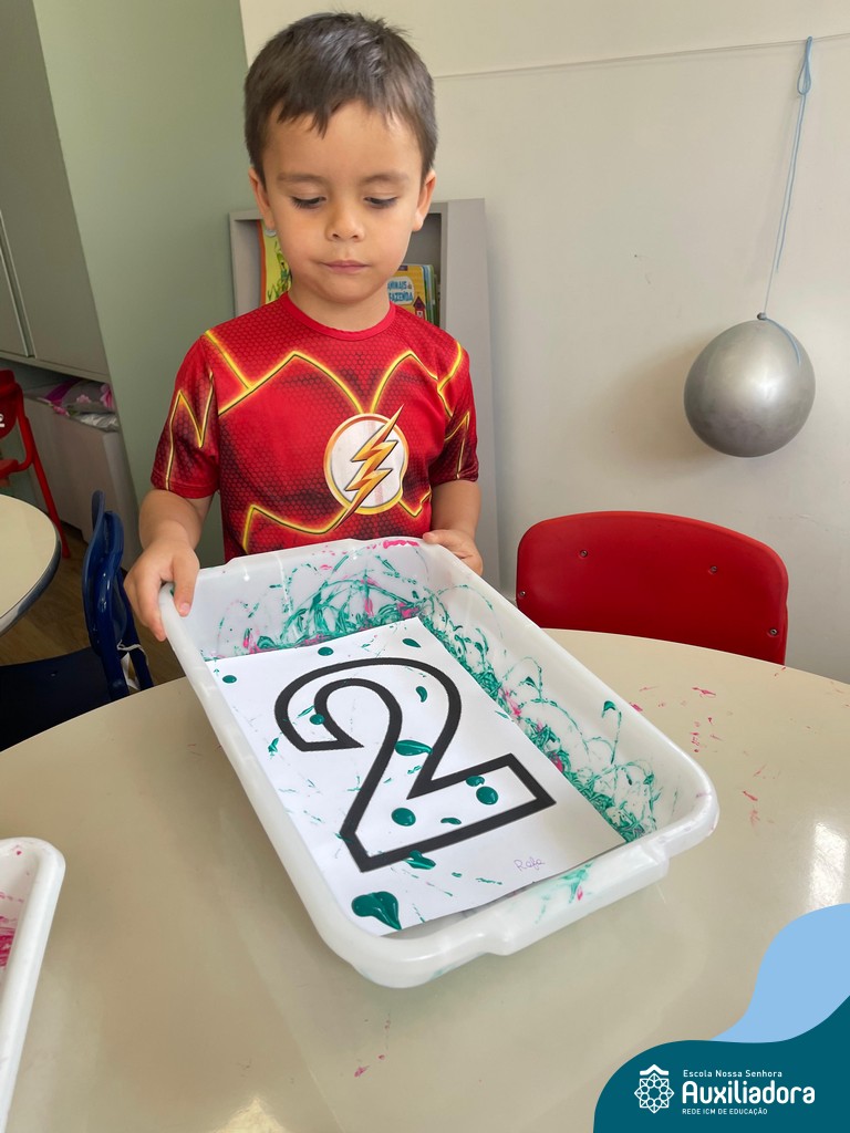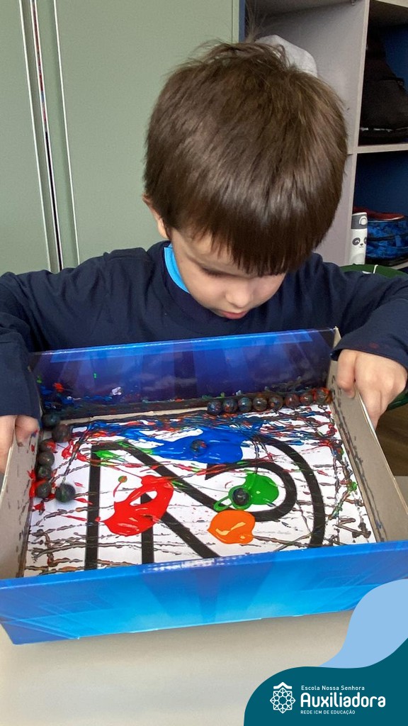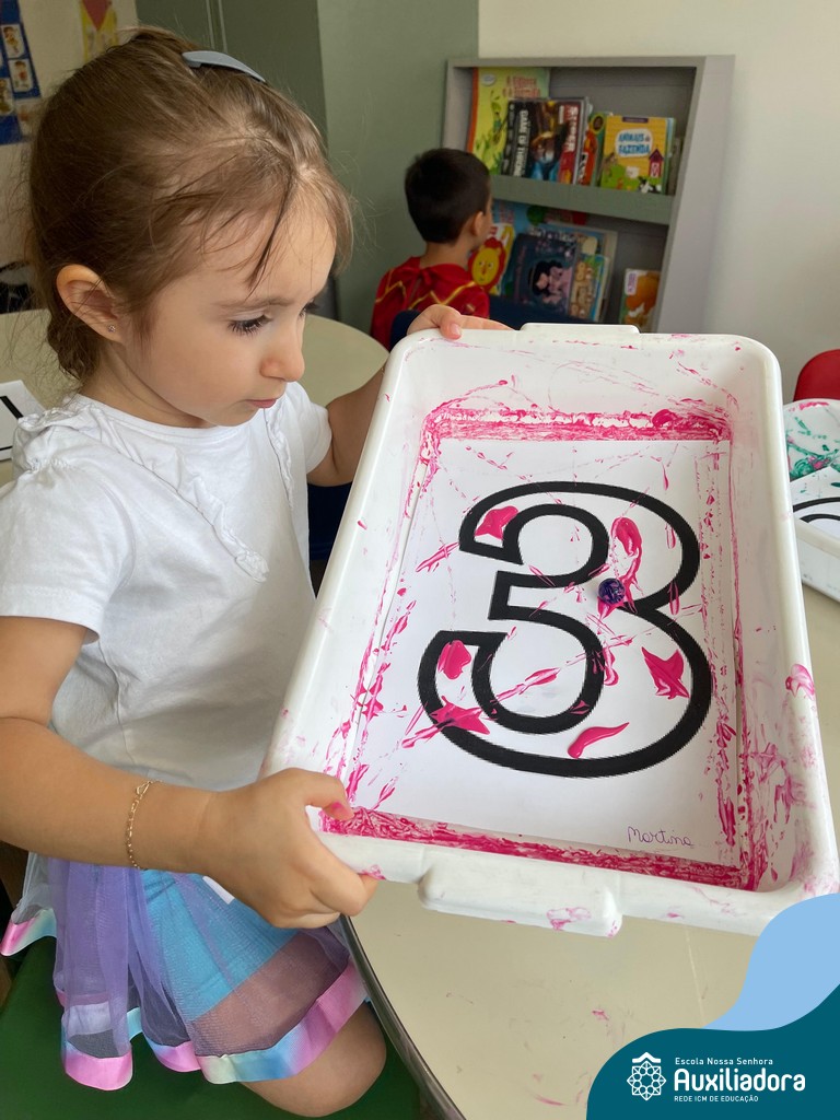 Esta semana realizamos uma atividade divertida e educativa com os numerais de 0 a 5. As crianças escolheram um número, identificaram-no e, em seguida, exploraram a técnica da ‘pintura em movimento’. Dentro de uma caixa de papelão, colocamos o número escolhido, pingos de tintas coloridas e algumas bolinhas de gude. Ao movimentar a caixa, as bolinhas rolavam e espalhavam as cores, criando um efeito único e encantador nos números! Foi uma experiência lúdica que estimulou o reconhecimento dos numerais e a criatividade. 🥰
