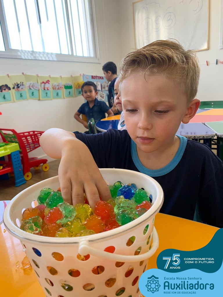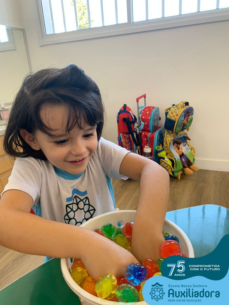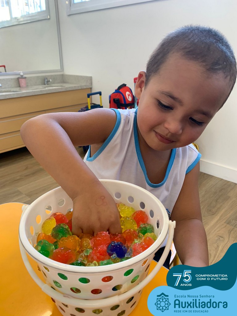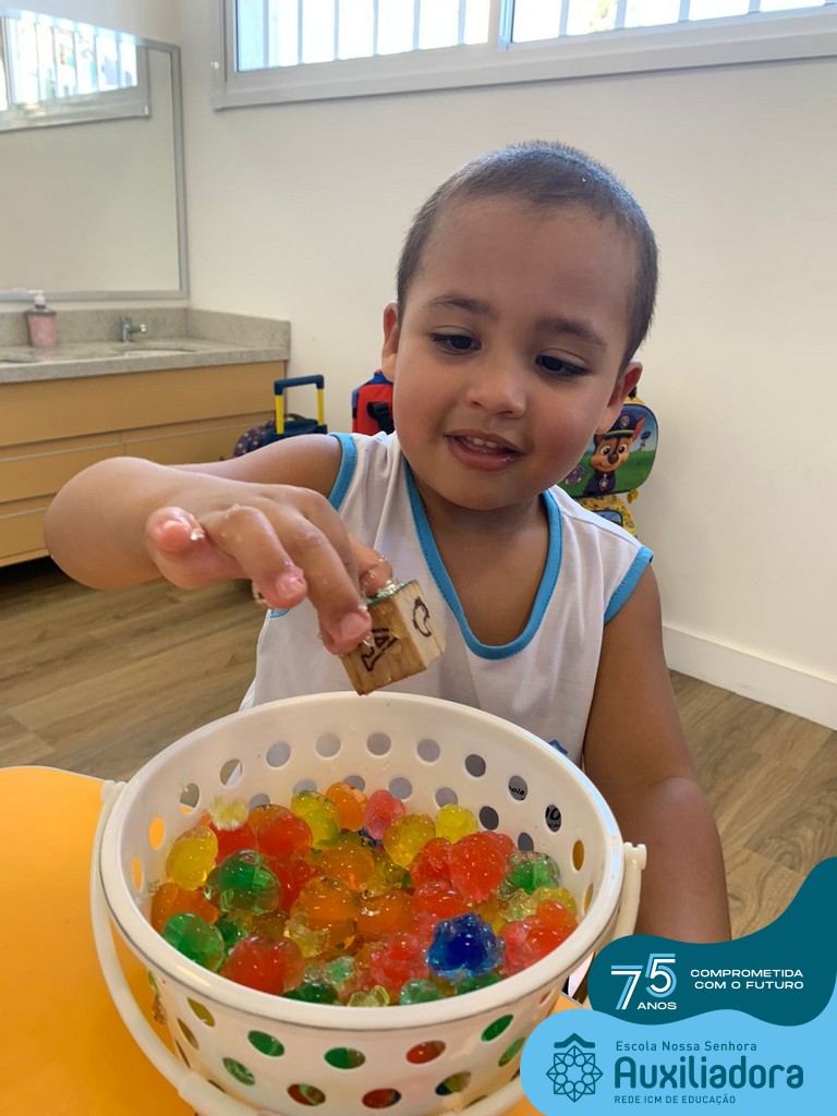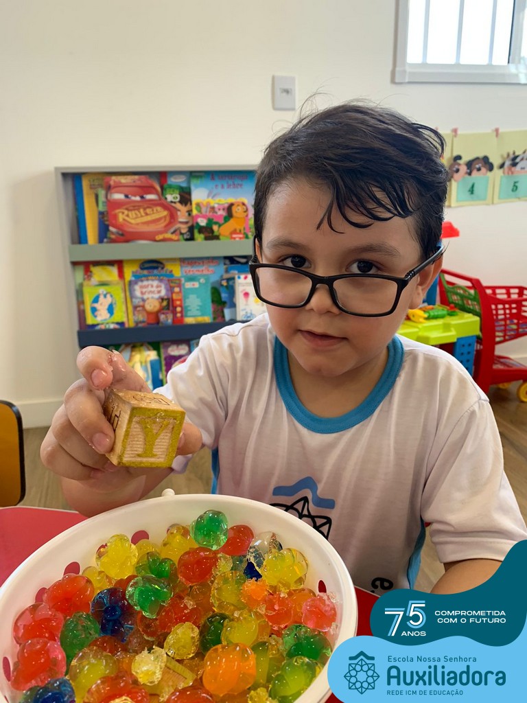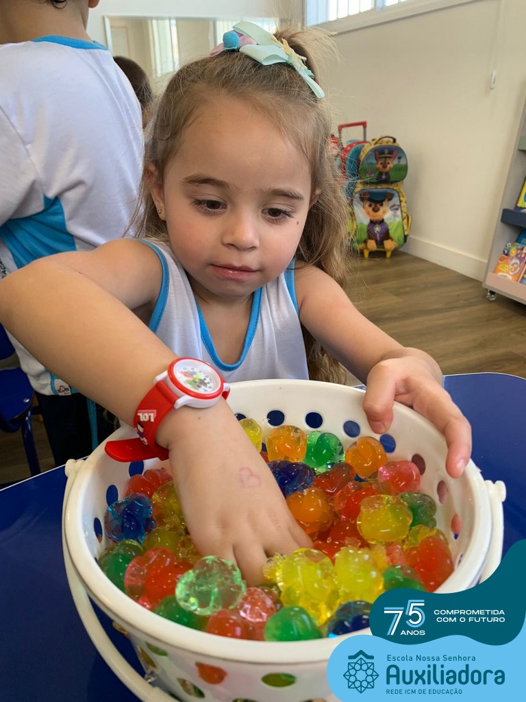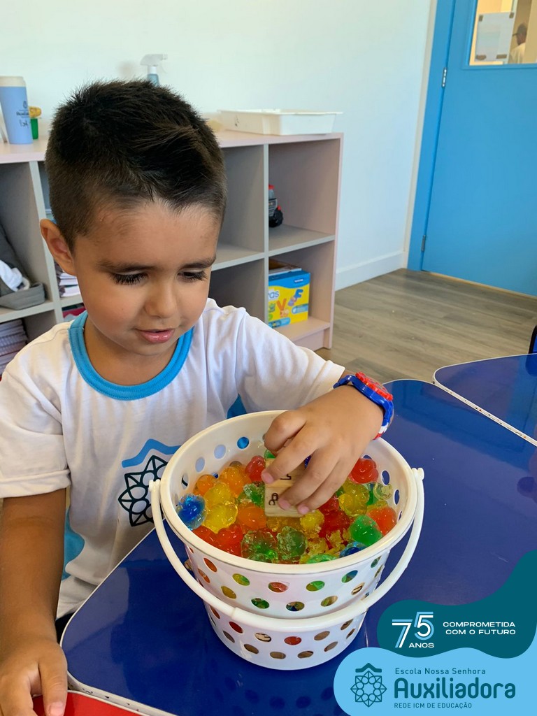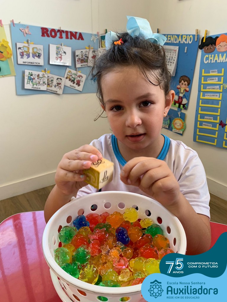 Durante esta semana a turma do Pré 1C trabalhou as letrinhas que formam o nome de cada um. A atividade teve como principal função a exploração das letras, através da investigação. Além de enfatizar o reconhecimento das letras, foi realizada uma experiência sensorial utilizando bolinhas de gel que oportunizaram a descoberta das sensações, consistência e temperatura.