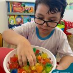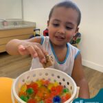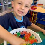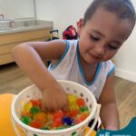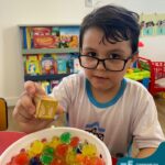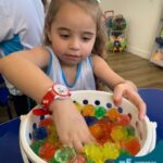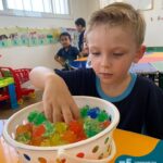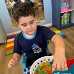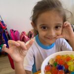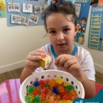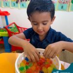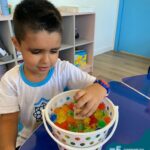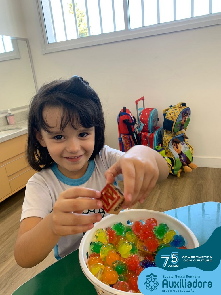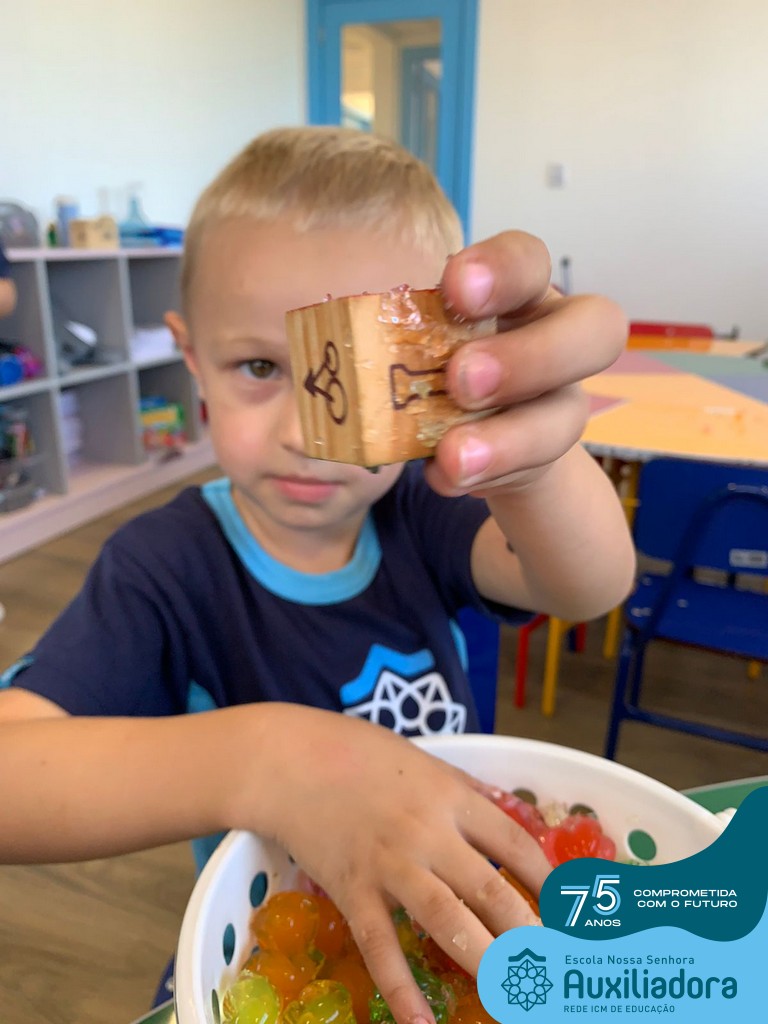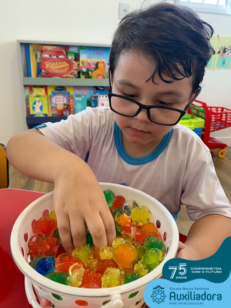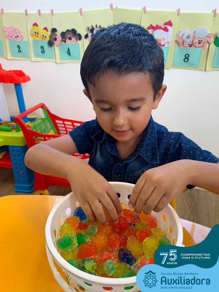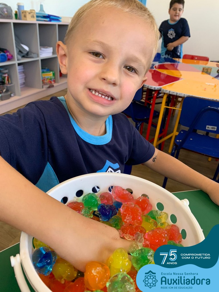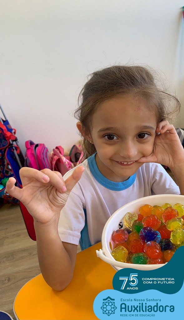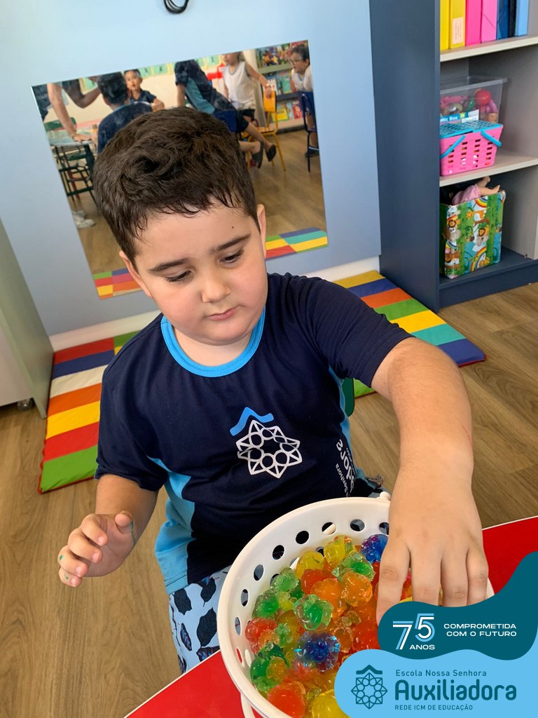 Durante esta semana a turma do Pré 1C trabalhou as letrinhas que formam o nome de cada um. A atividade teve como principal função a exploração das letras, através da investigação. Além de enfatizar o reconhecimento das letras, foi realizada uma experiência sensorial utilizando bolinhas de gel que oportunizaram a descoberta das sensações, consistência e temperatura.
