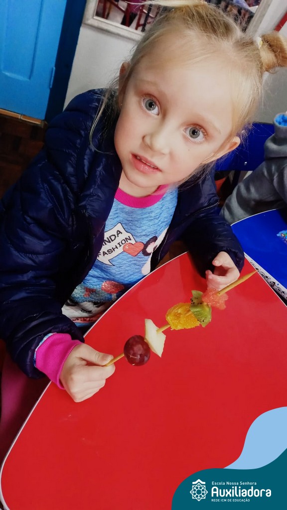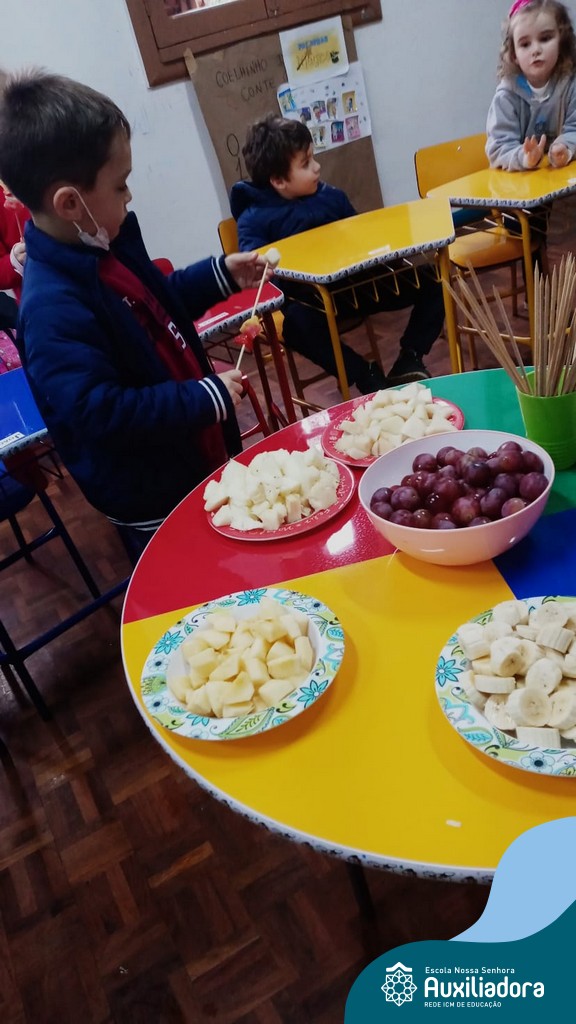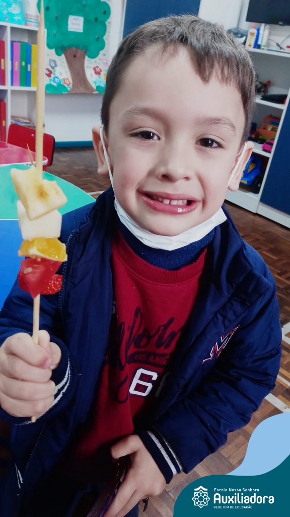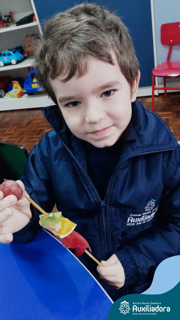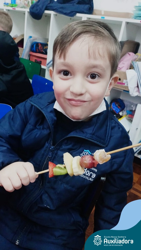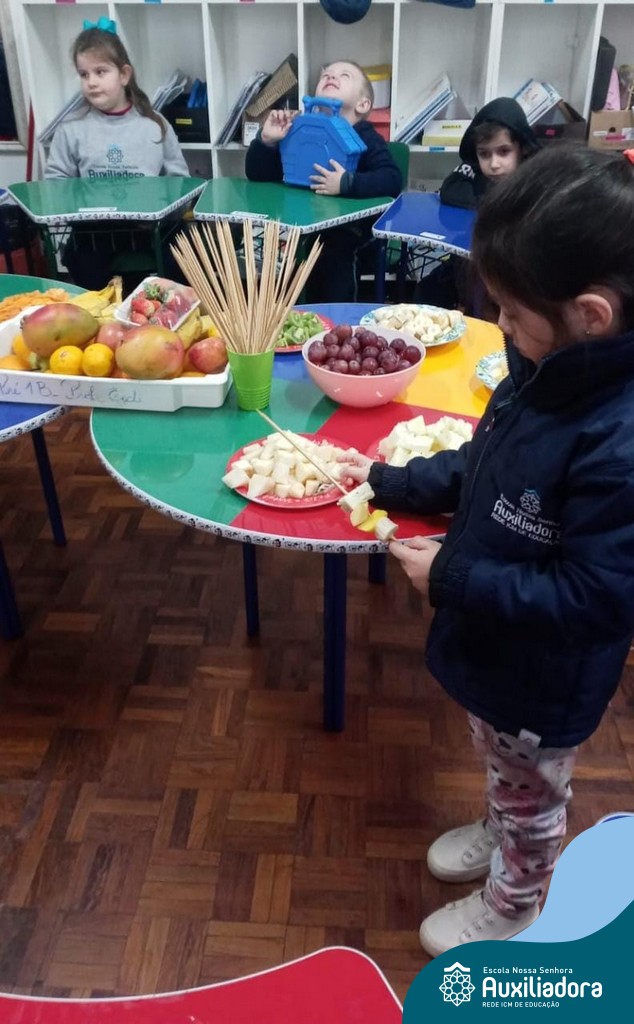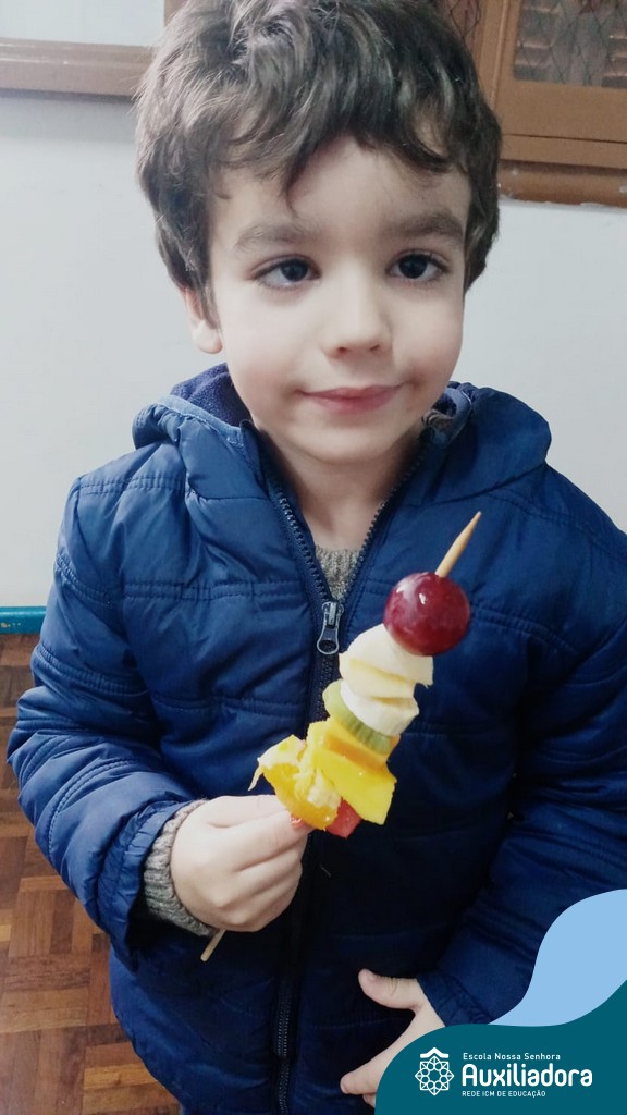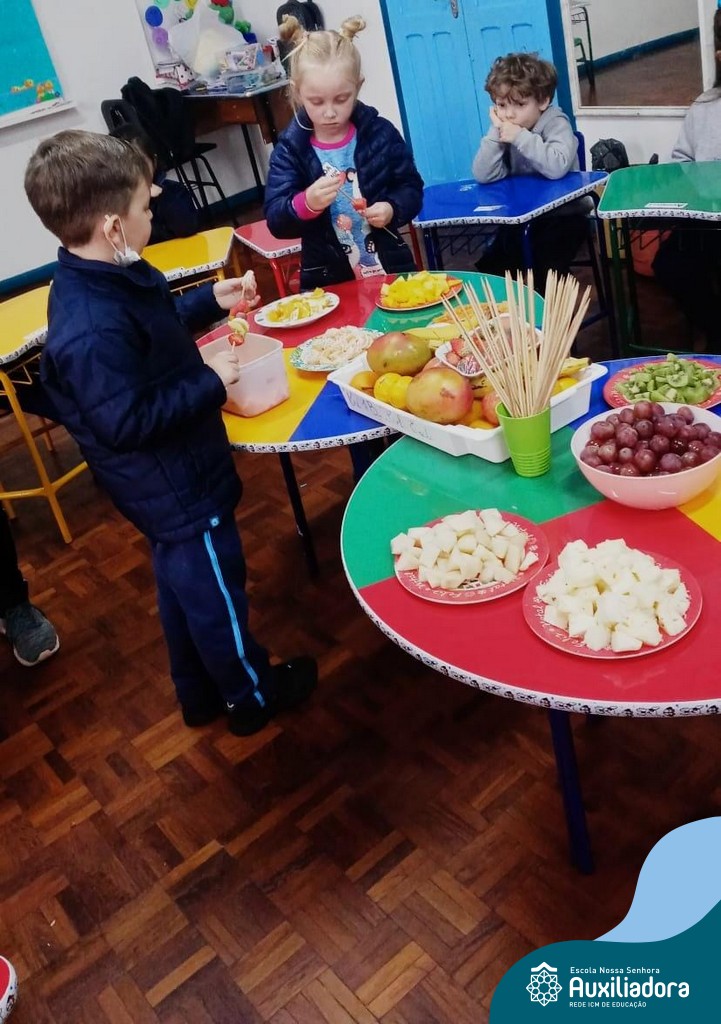 Espetinho de frutas do pré 1B! Nesta atividade os alunos puderam experimentar as frutas, explorando seus sabores, cores, formas e texturas, montando seu espetinho com suas frutas preferidas.