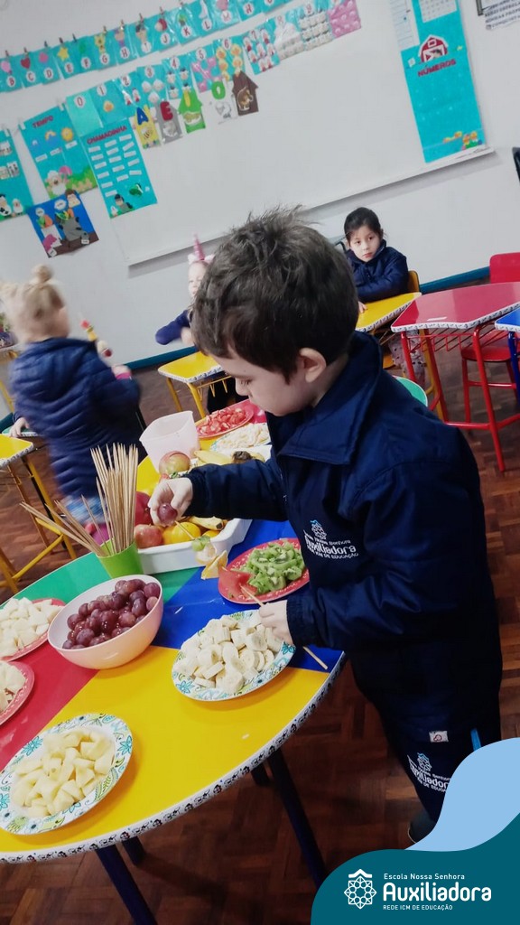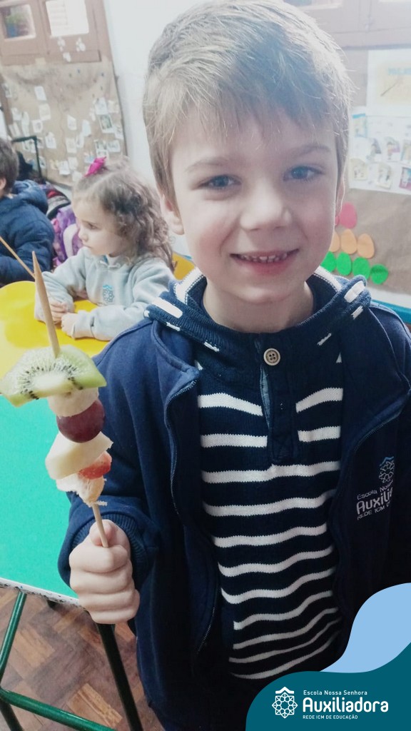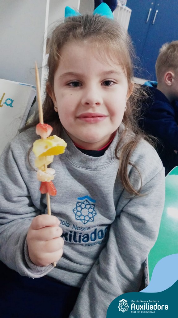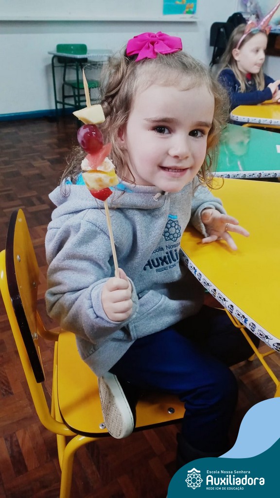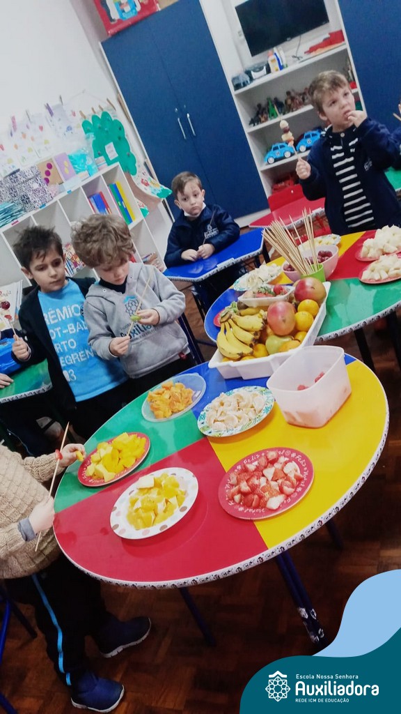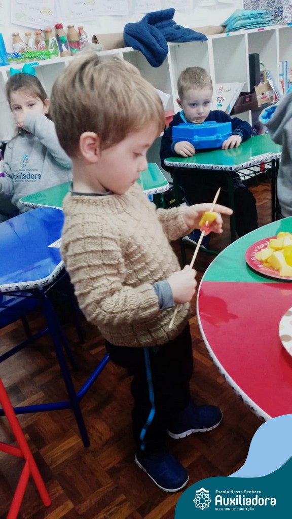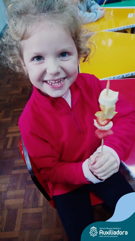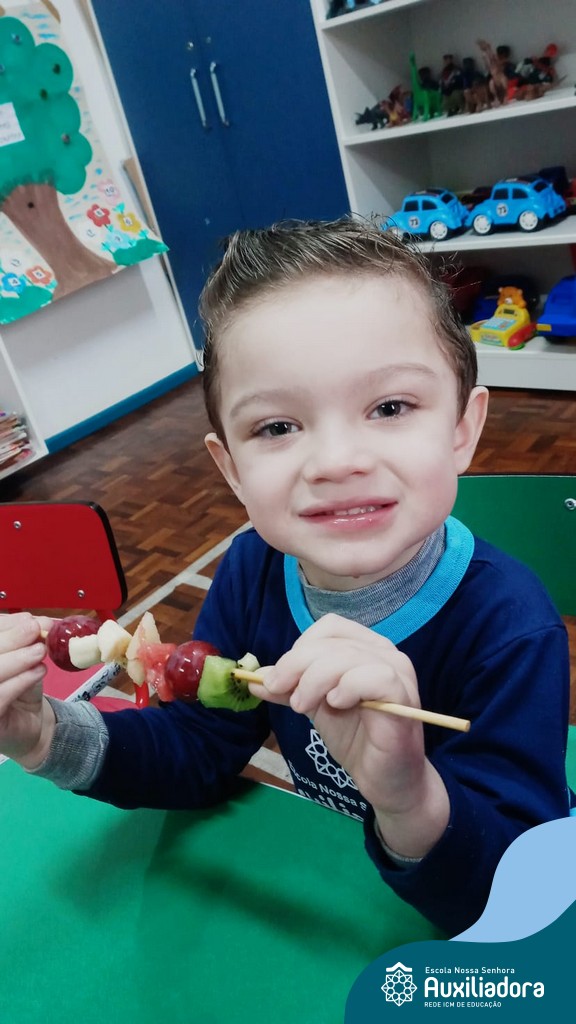 Espetinho de frutas do pré 1B! Nesta atividade os alunos puderam experimentar as frutas, explorando seus sabores, cores, formas e texturas, montando seu espetinho com suas frutas preferidas.