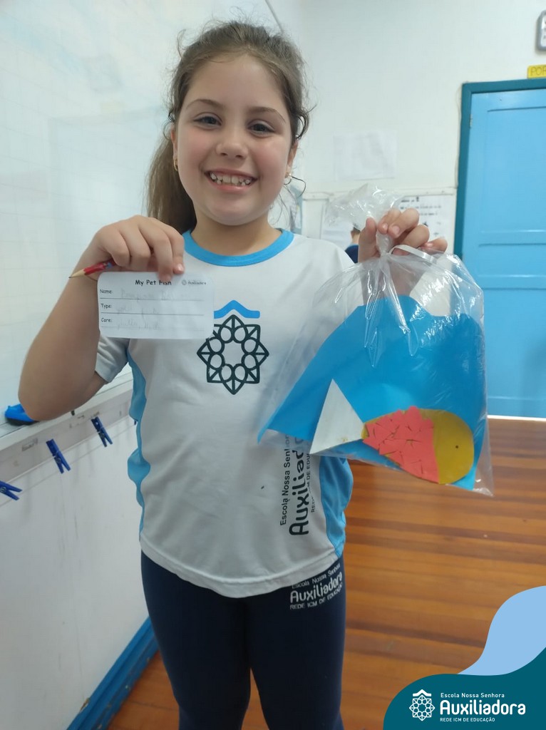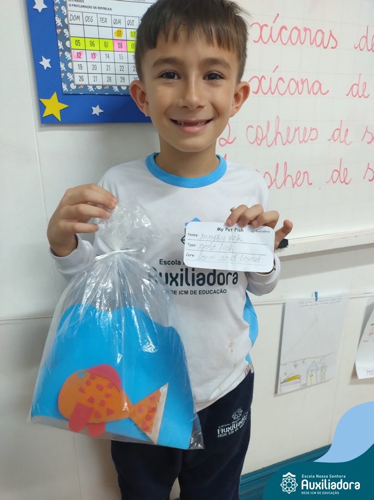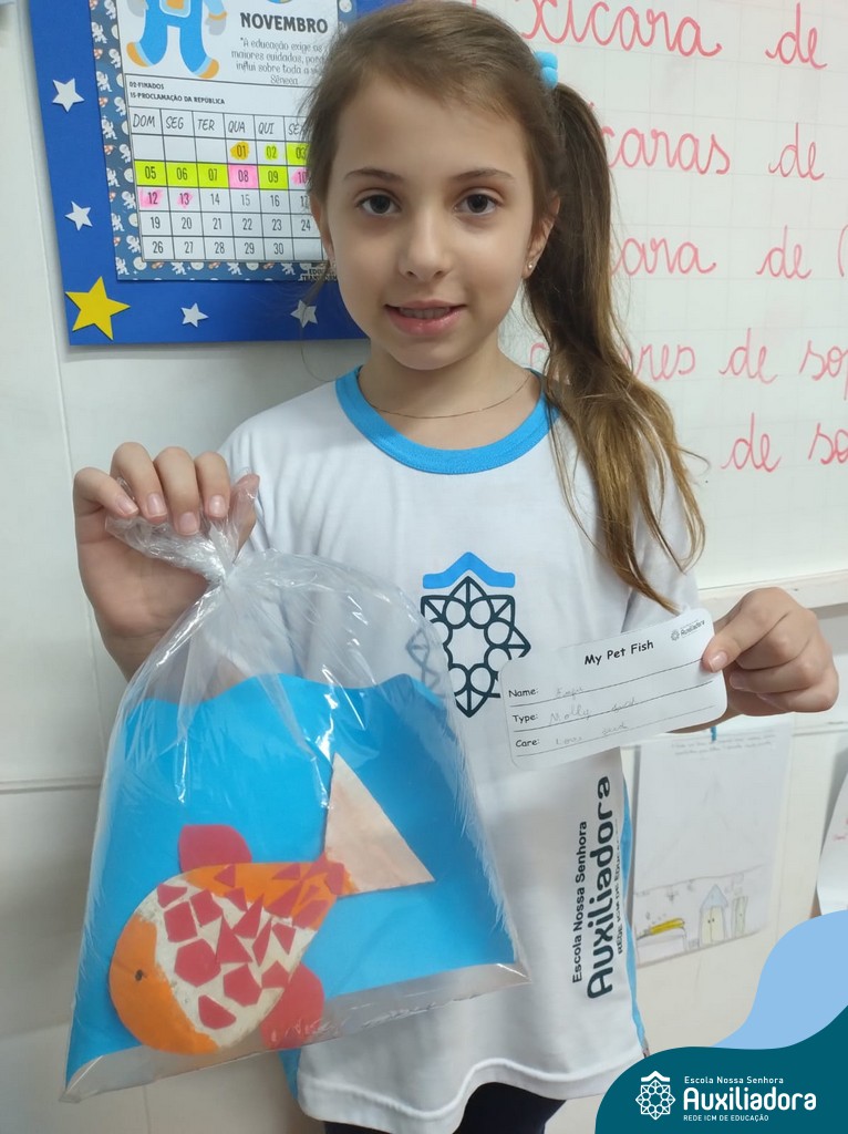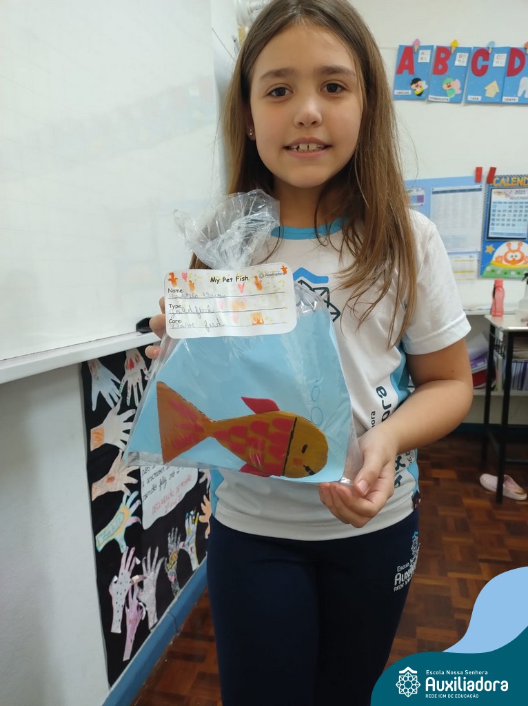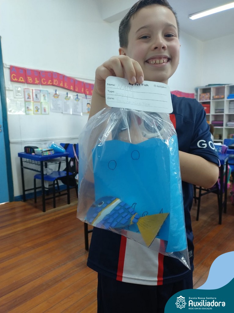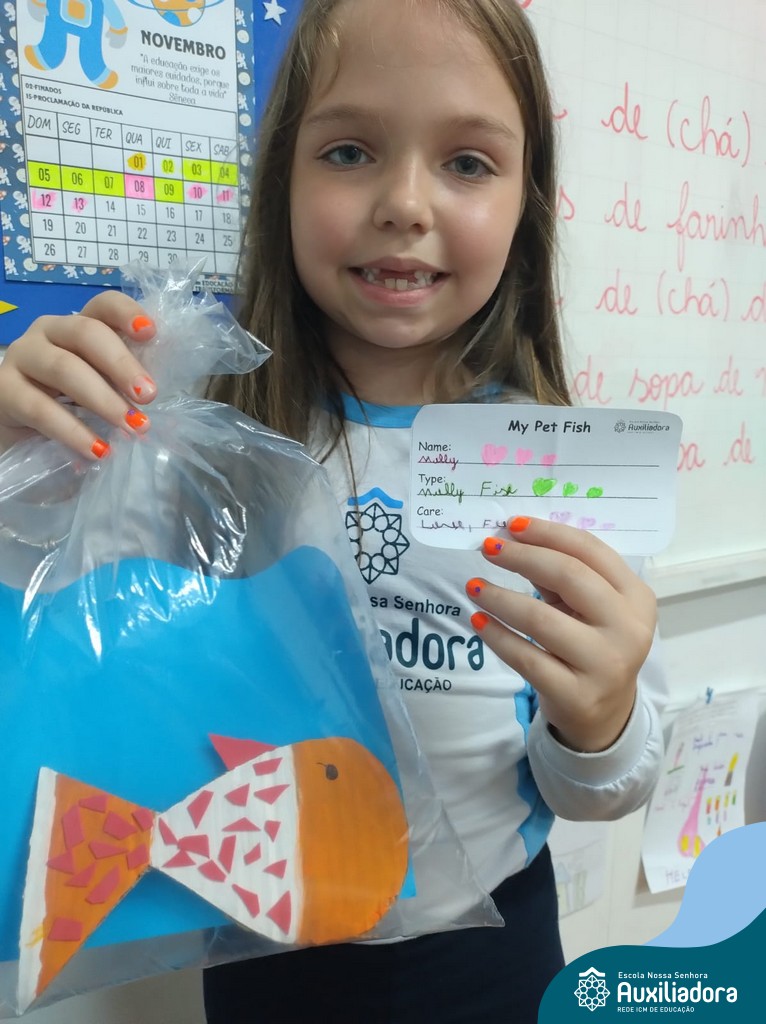 As turmas do 2° ano 21, 22 e 23 desenvolveram o projeto My Pet Fish, aprendendo sobre os diferentes tipos de peixe de estimação. Também, no decorrer das aulas, aprenderam as partes do corpo dos peixes, onde vivem, quais devem ser os cuidados e como respiram embaixo d’água. Como resultado, cada aluno montou seu Pet Fish, assim como a ficha com nome, espécie e cuidados.