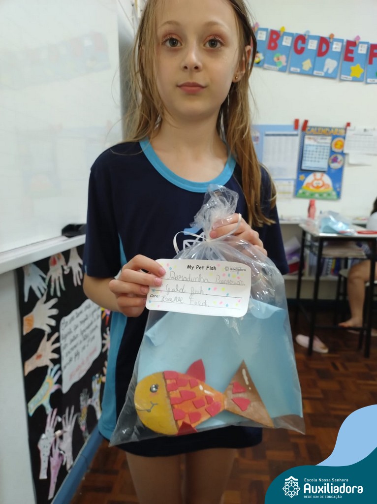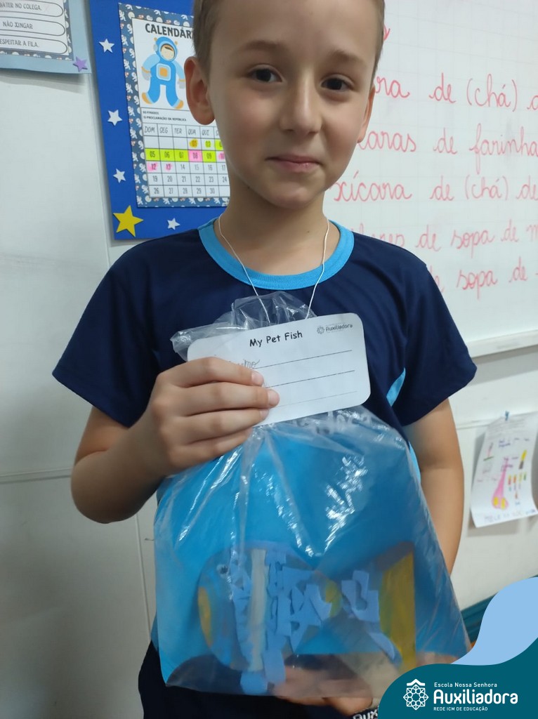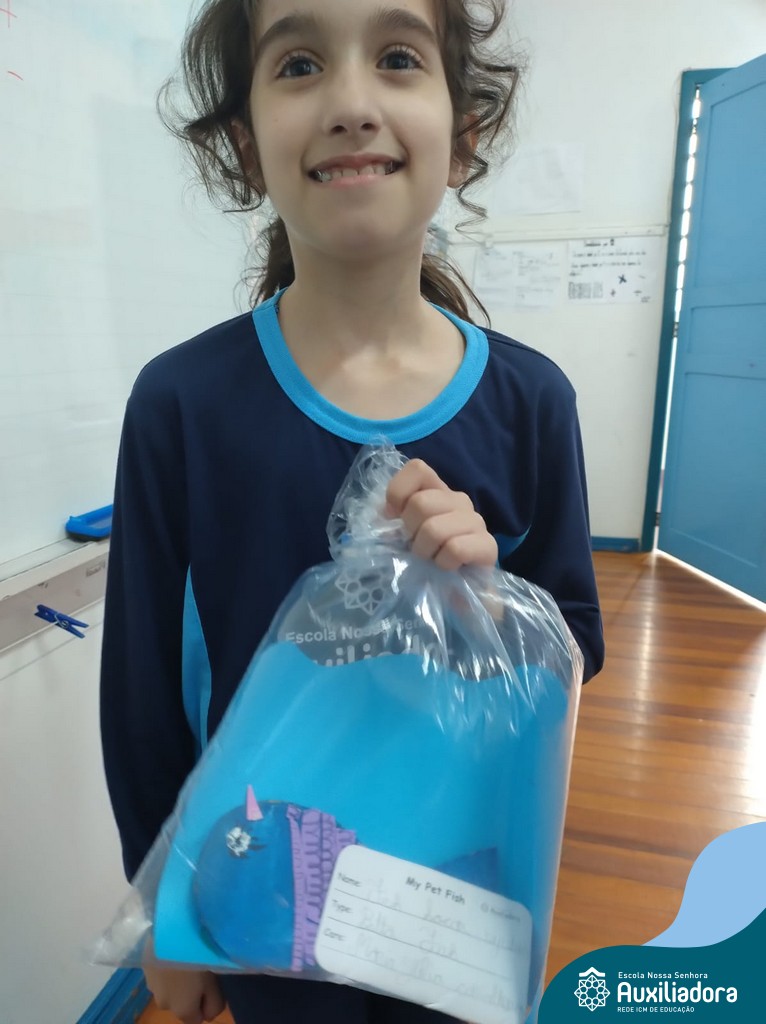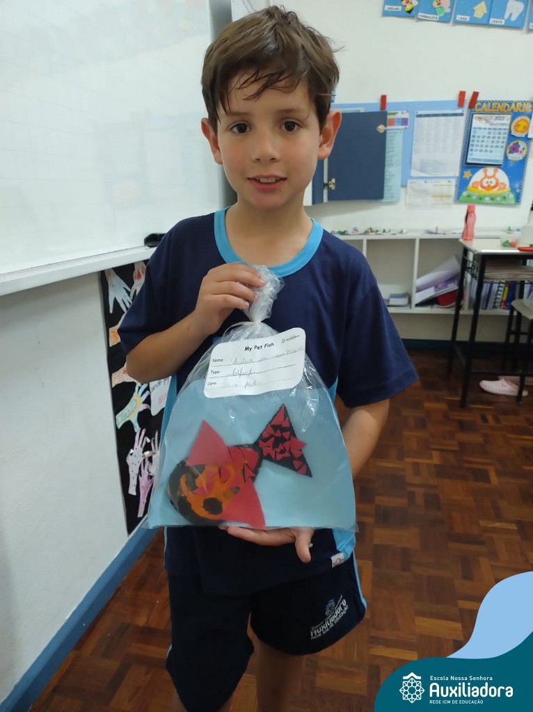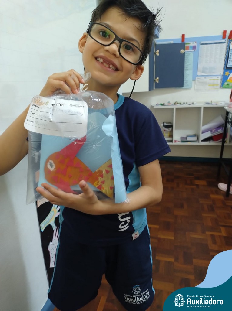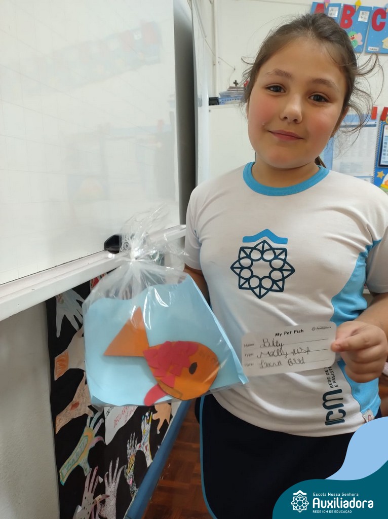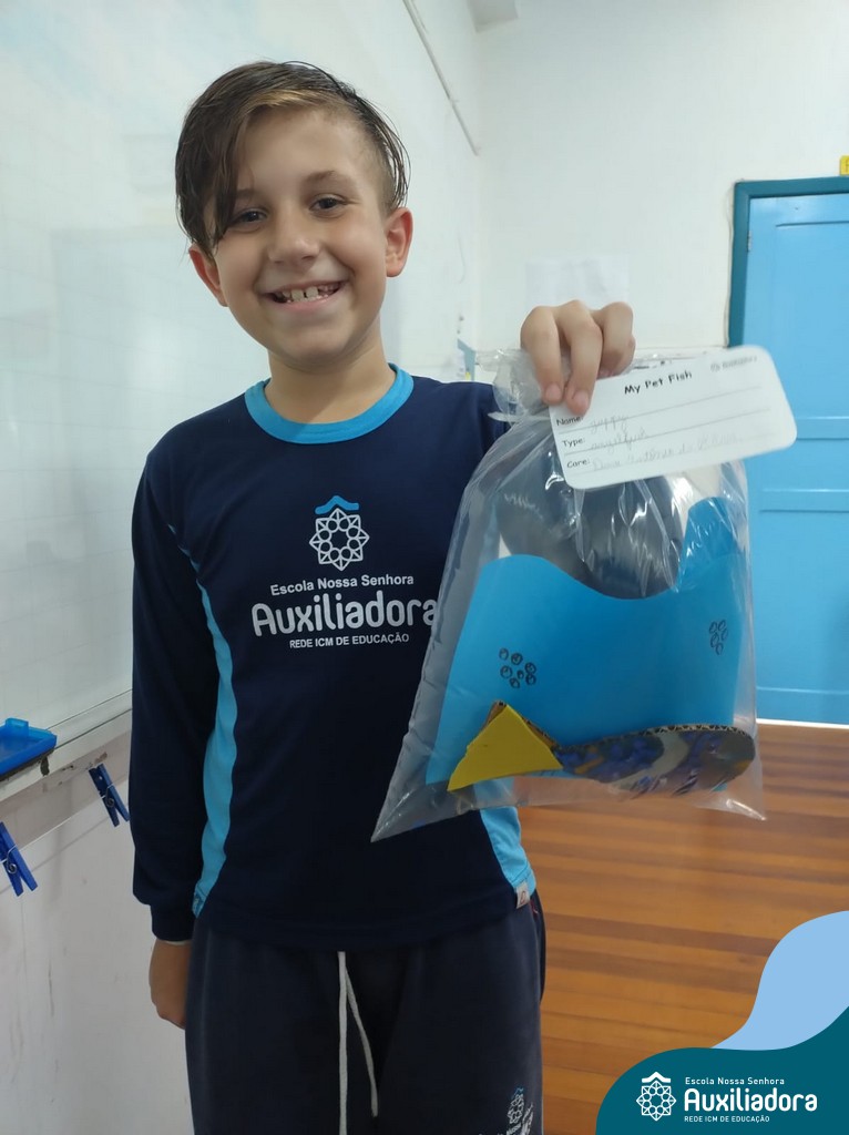 As turmas do 2° ano 21, 22 e 23 desenvolveram o projeto My Pet Fish, aprendendo sobre os diferentes tipos de peixe de estimação. Também, no decorrer das aulas, aprenderam as partes do corpo dos peixes, onde vivem, quais devem ser os cuidados e como respiram embaixo d’água. Como resultado, cada aluno montou seu Pet Fish, assim como a ficha com nome, espécie e cuidados.