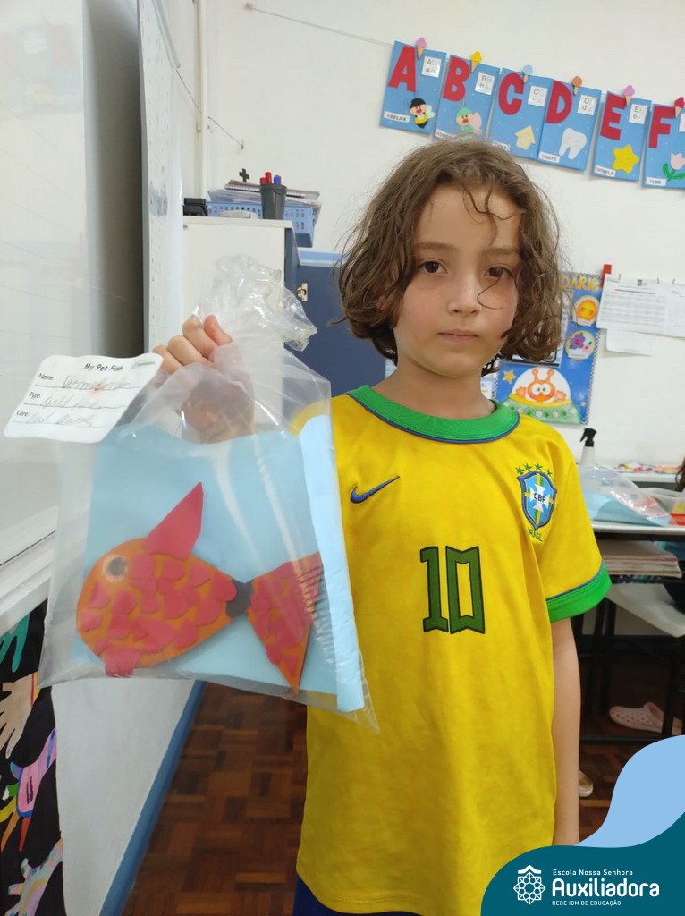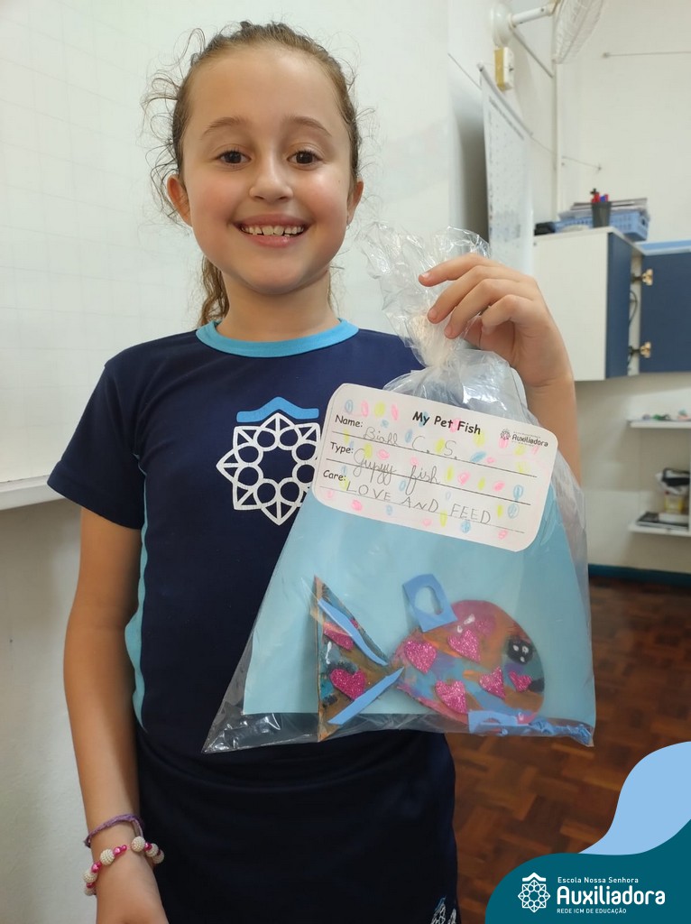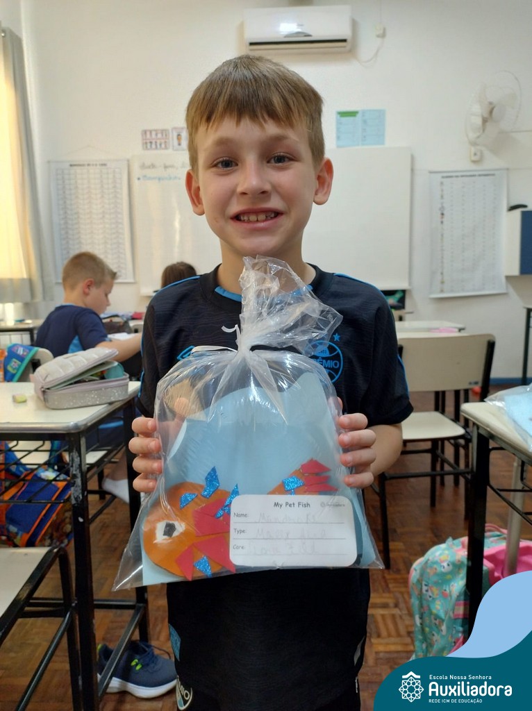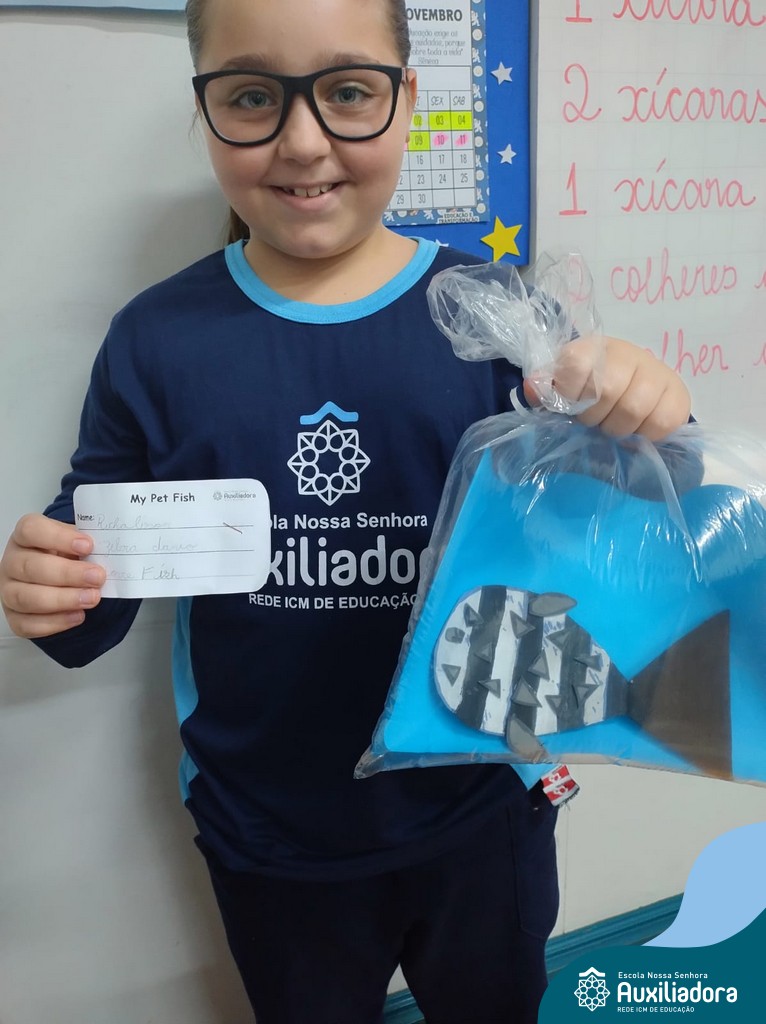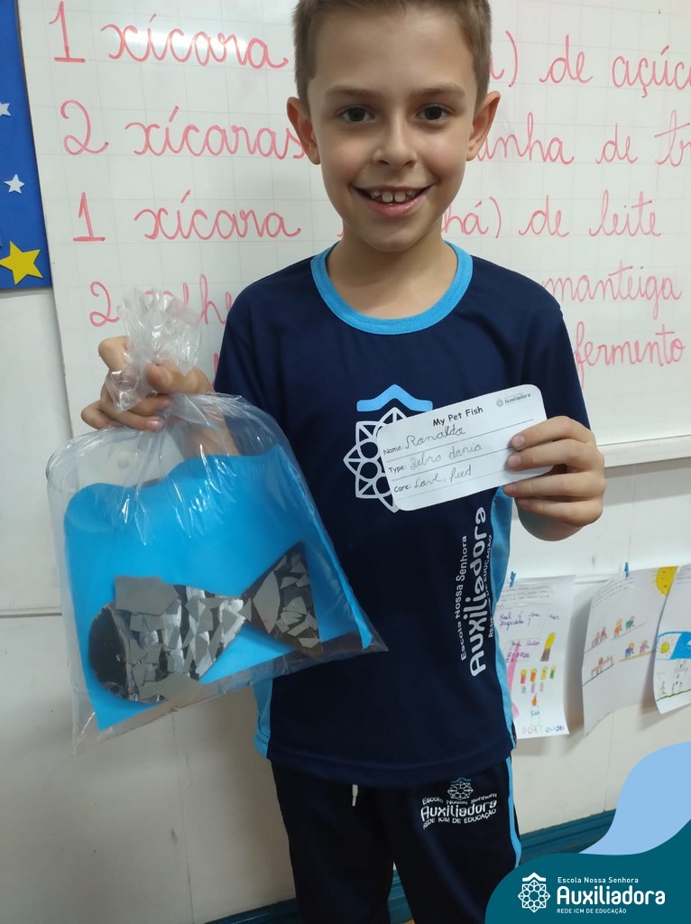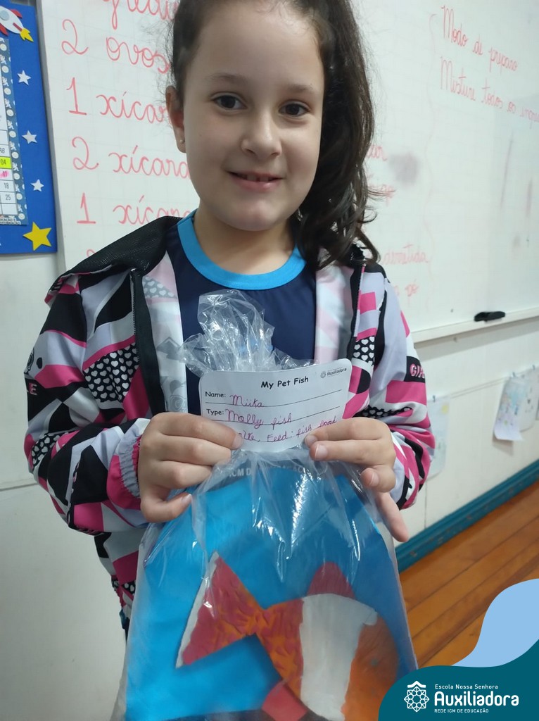 As turmas do 2° ano 21, 22 e 23 desenvolveram o projeto My Pet Fish, aprendendo sobre os diferentes tipos de peixe de estimação. Também, no decorrer das aulas, aprenderam as partes do corpo dos peixes, onde vivem, quais devem ser os cuidados e como respiram embaixo d’água. Como resultado, cada aluno montou seu Pet Fish, assim como a ficha com nome, espécie e cuidados.