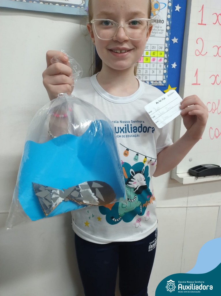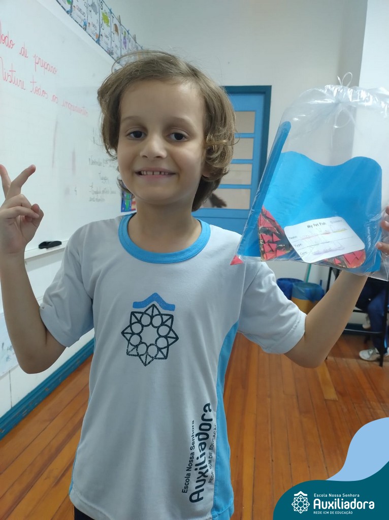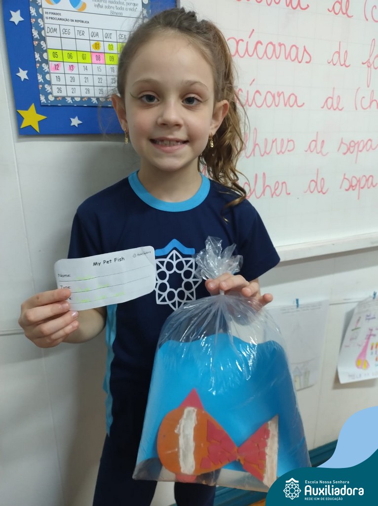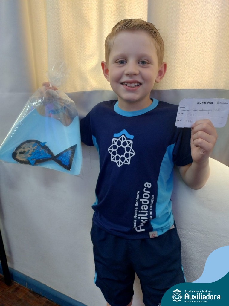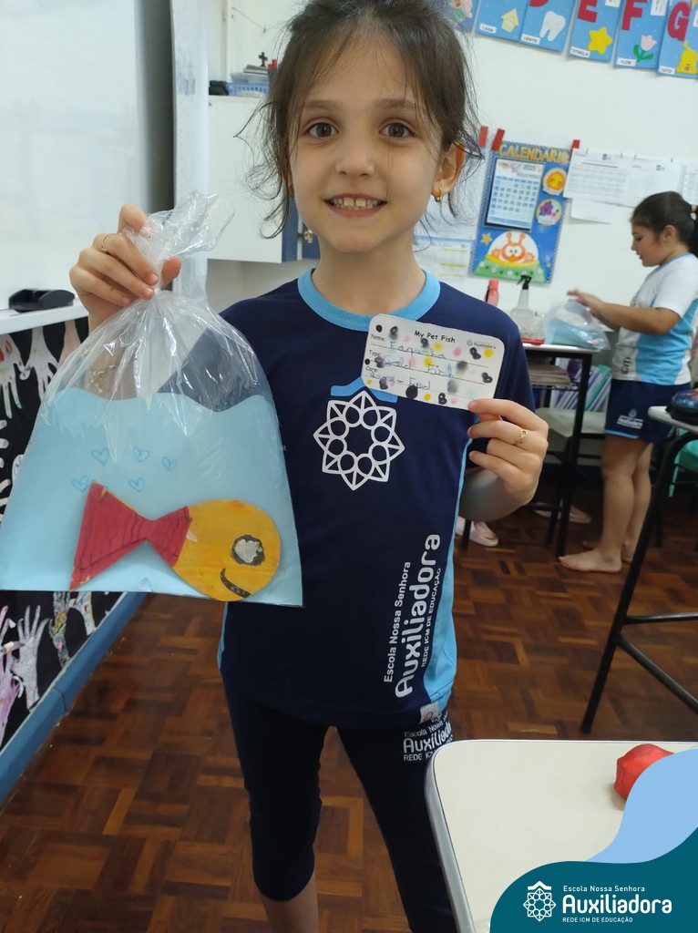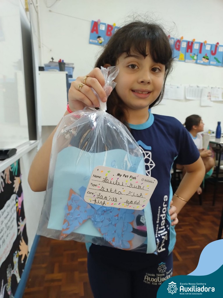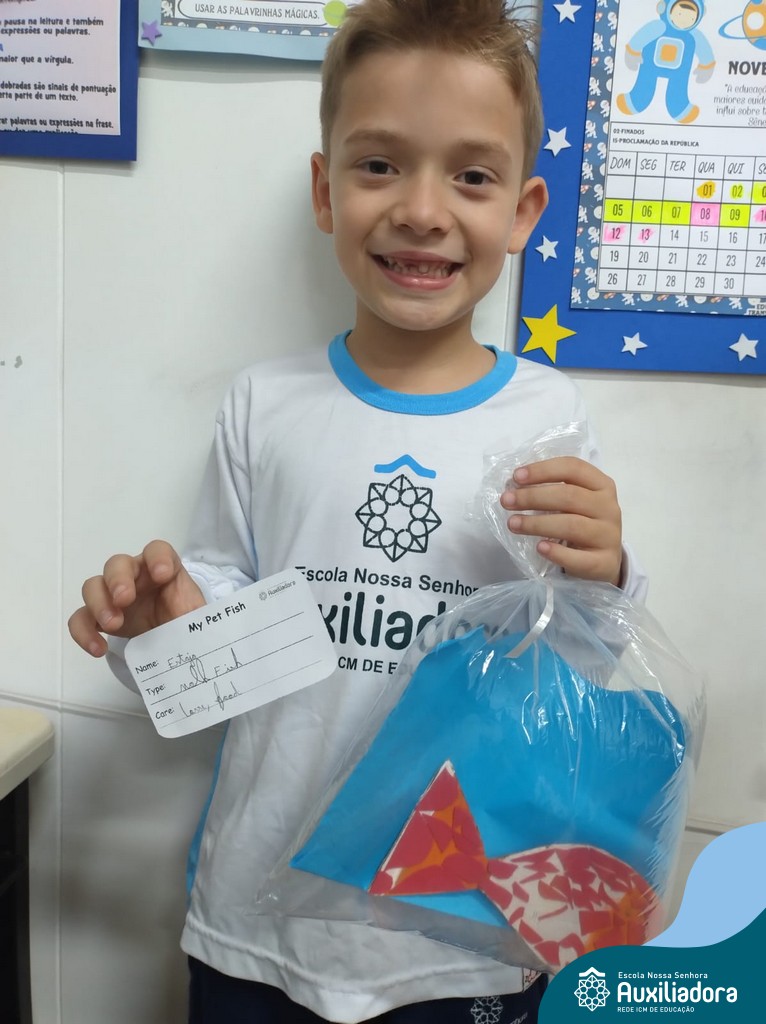As turmas do 2° ano 21, 22 e 23 desenvolveram o projeto My Pet Fish, aprendendo sobre os diferentes tipos de peixe de estimação. Também, no decorrer das aulas, aprenderam as partes do corpo dos peixes, onde vivem, quais devem ser os cuidados e como respiram embaixo d’água. Como resultado, cada aluno montou seu Pet Fish, assim como a ficha com nome, espécie e cuidados.