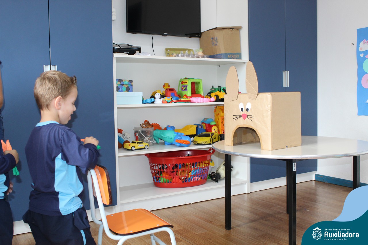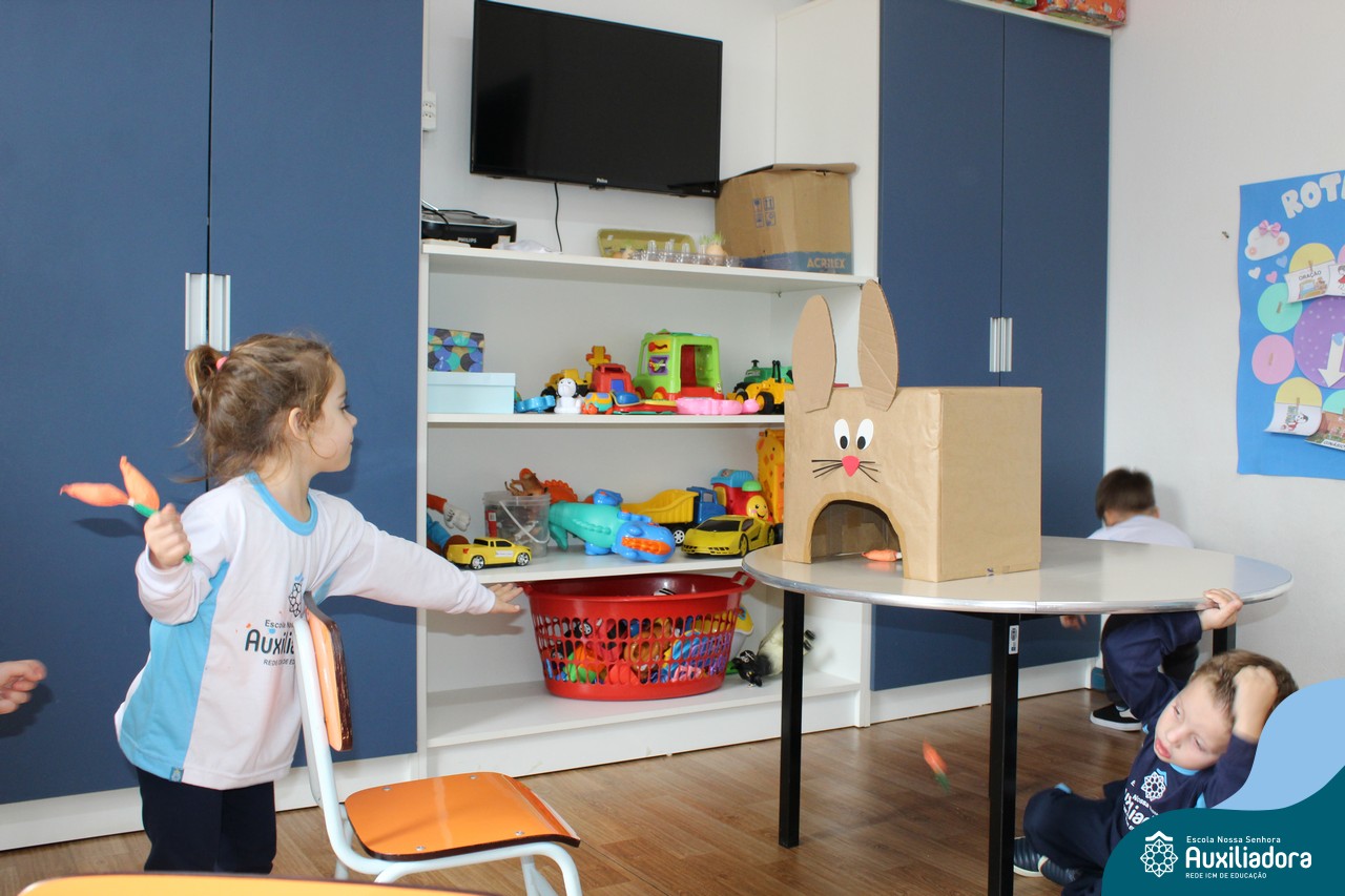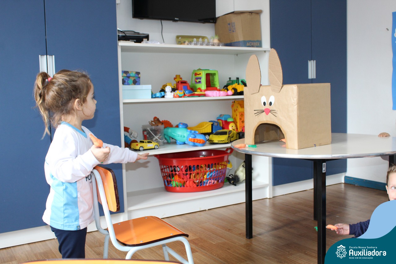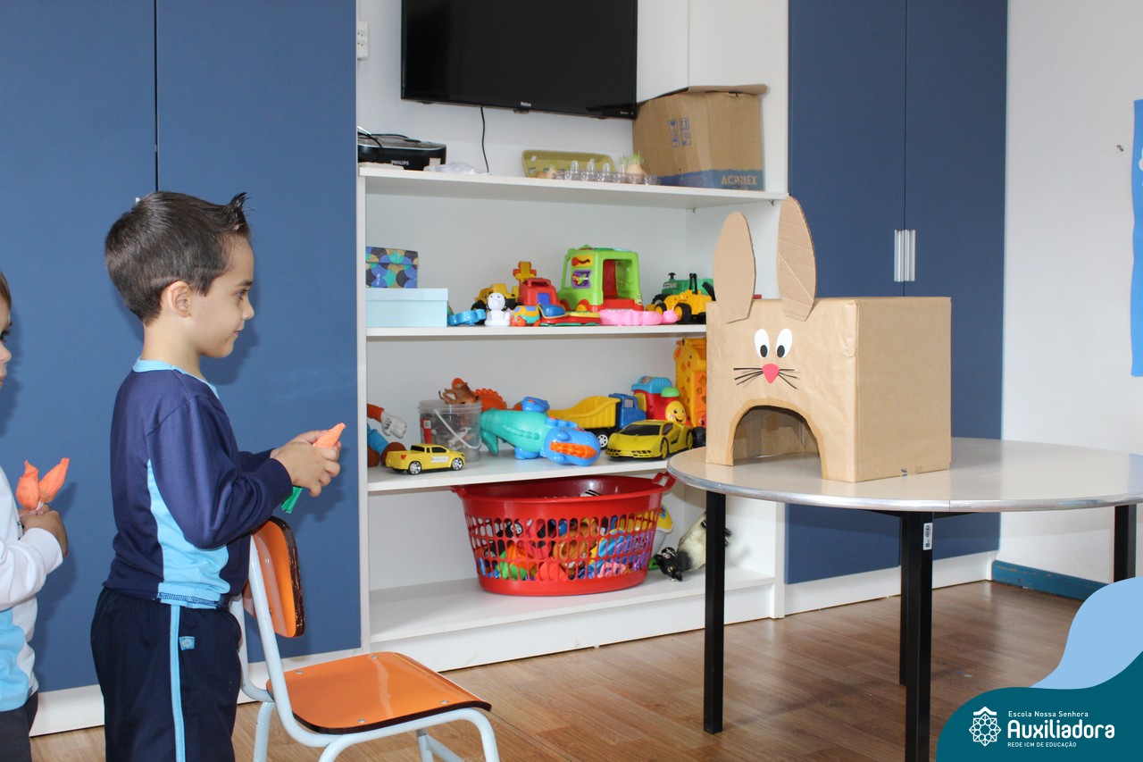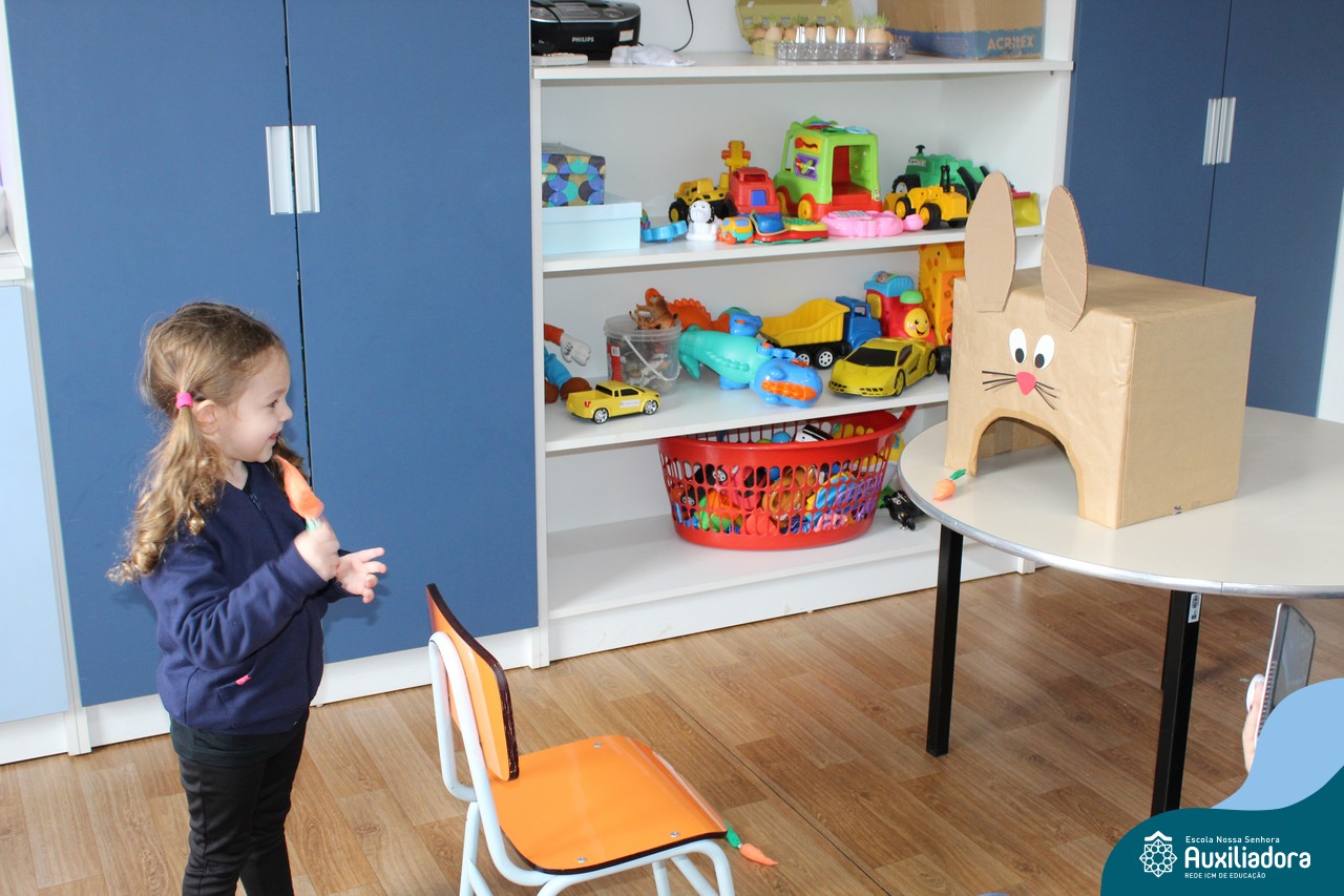 Através da Brincadeira O Coelhinho Guloso, a turma do Maternal II B se divertiu muito alimentando o Coelho com cenouras.