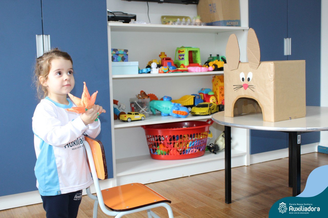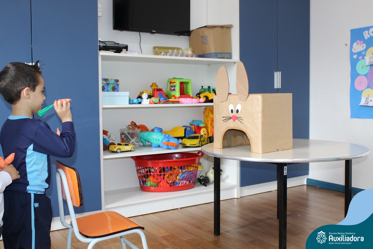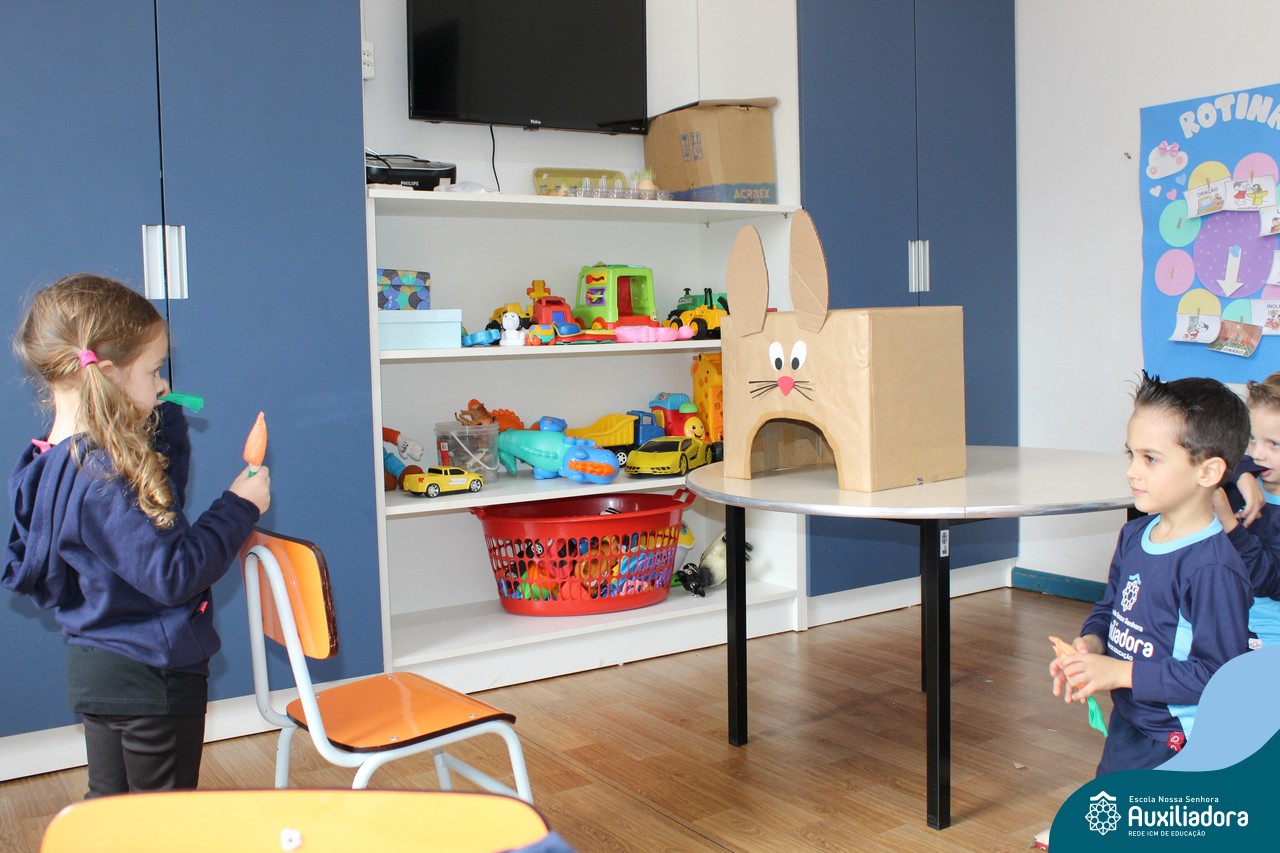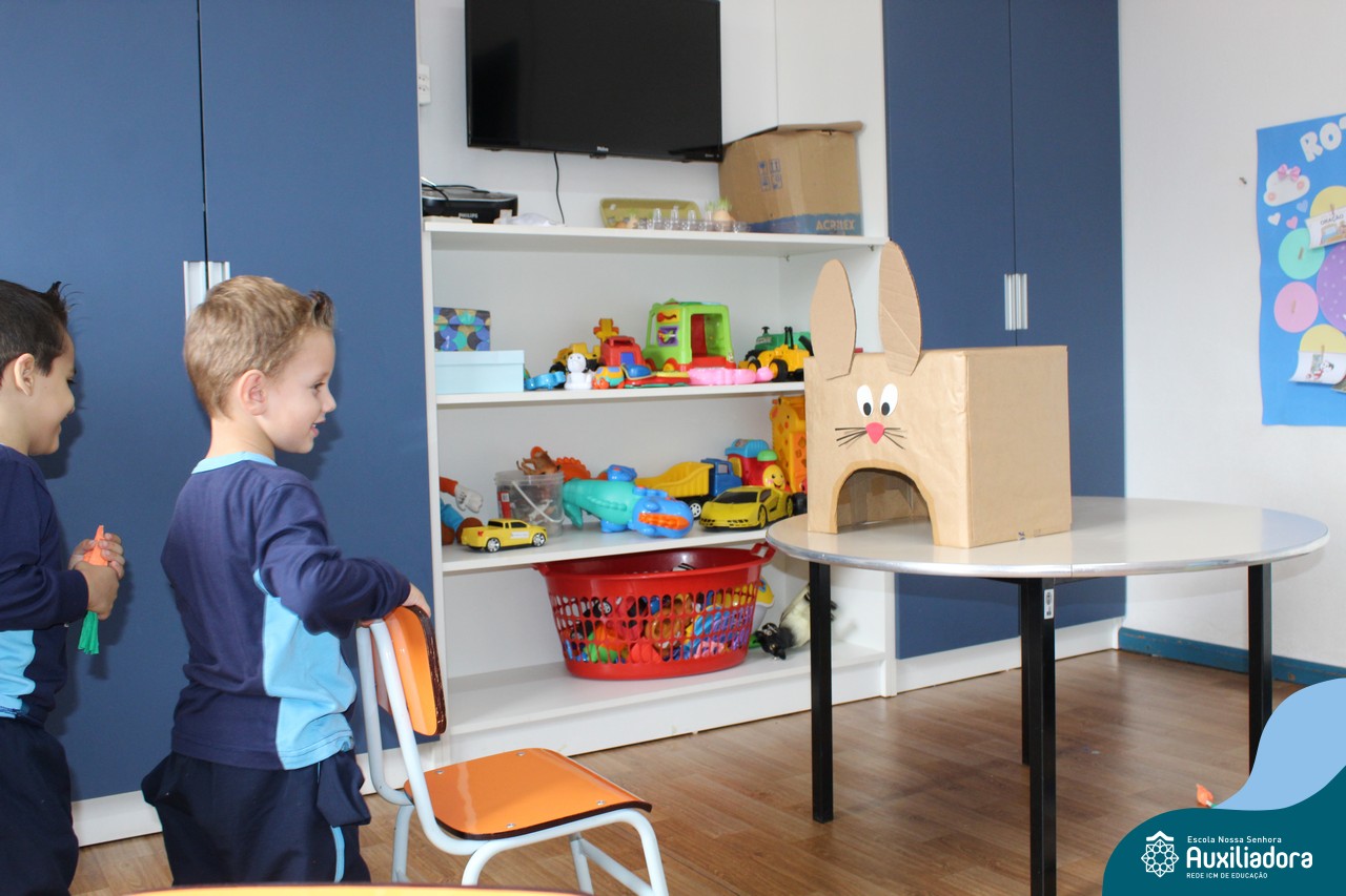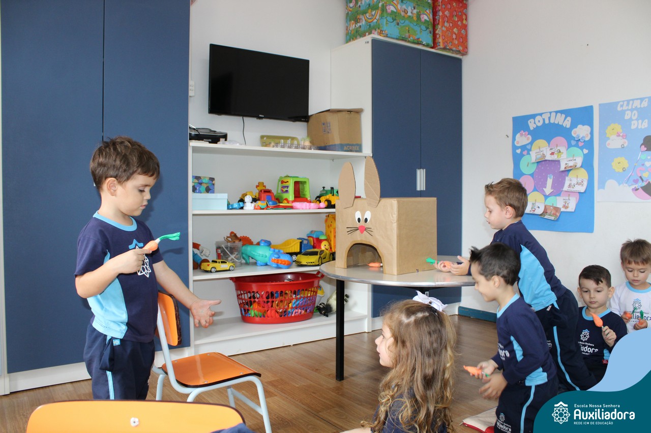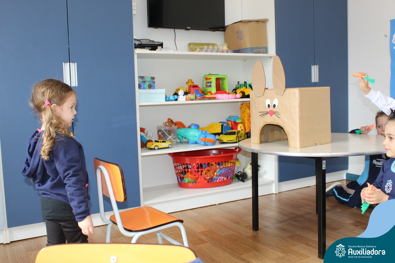 Através da Brincadeira O Coelhinho Guloso, a turma do Maternal II B se divertiu muito alimentando o Coelho com cenouras.