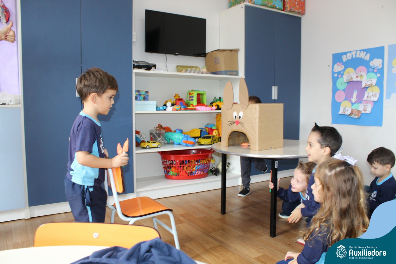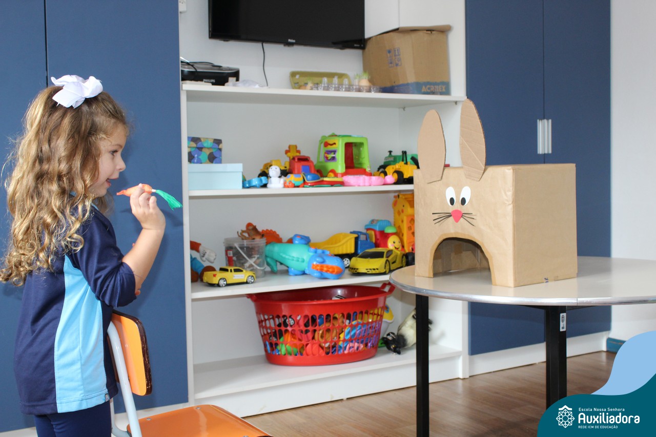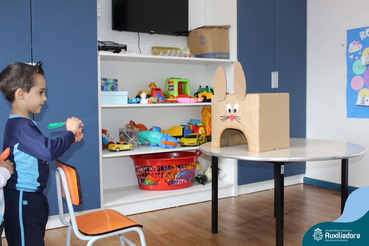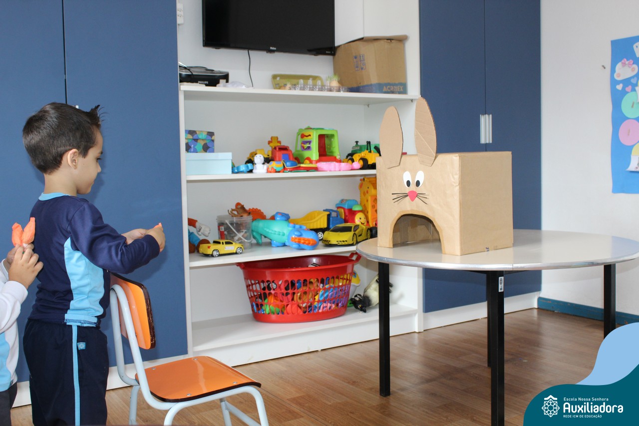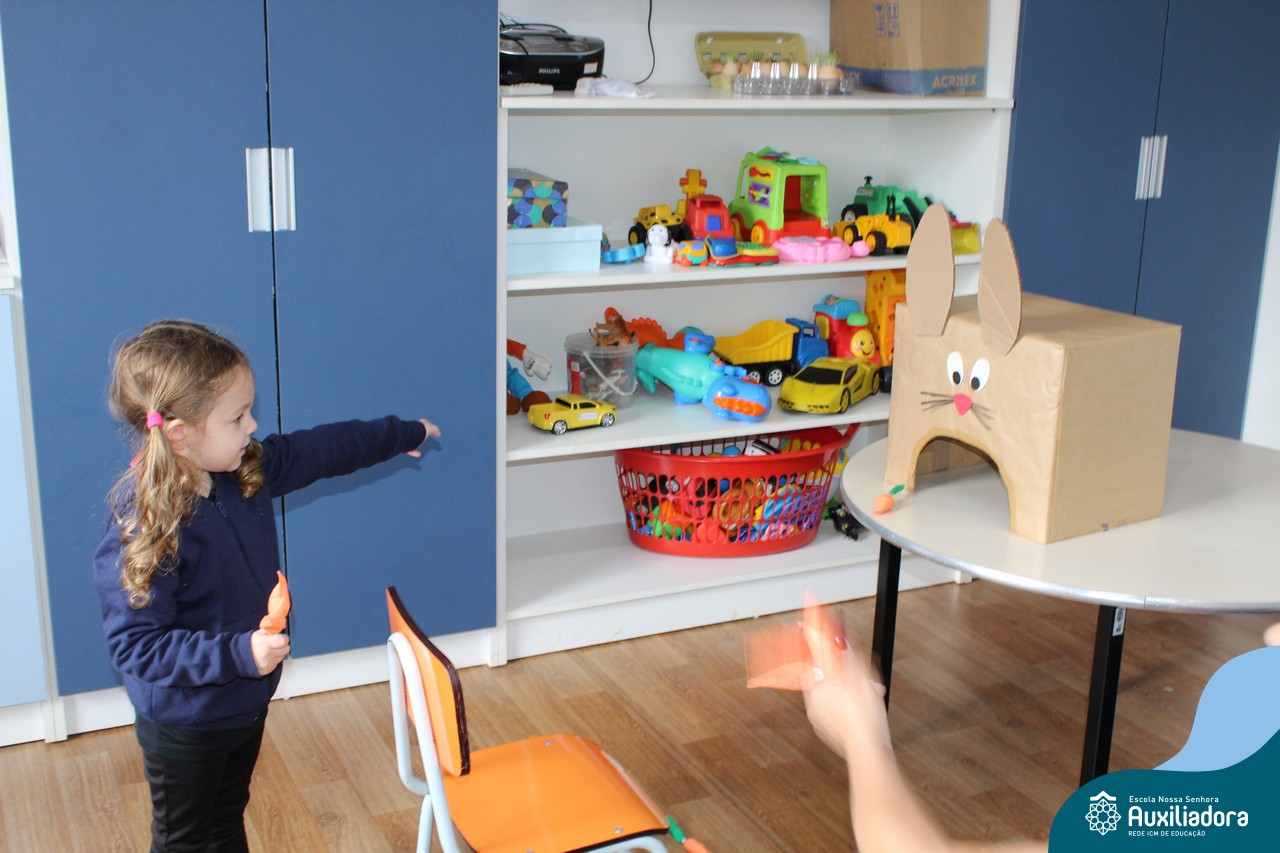 Através da Brincadeira O Coelhinho Guloso, a turma do Maternal II B se divertiu muito alimentando o Coelho com cenouras.