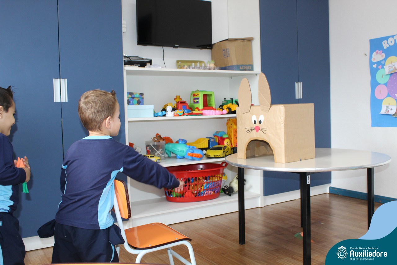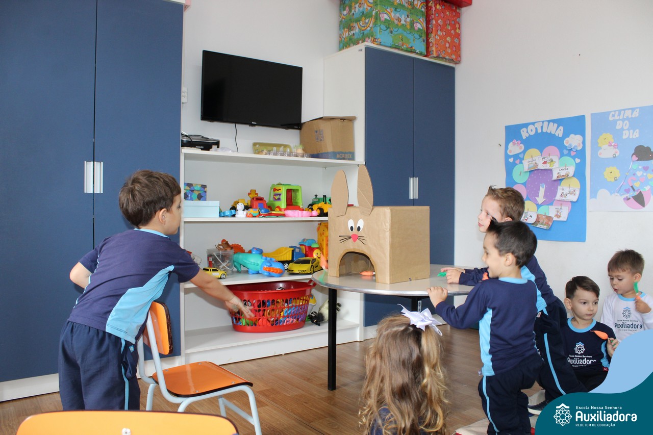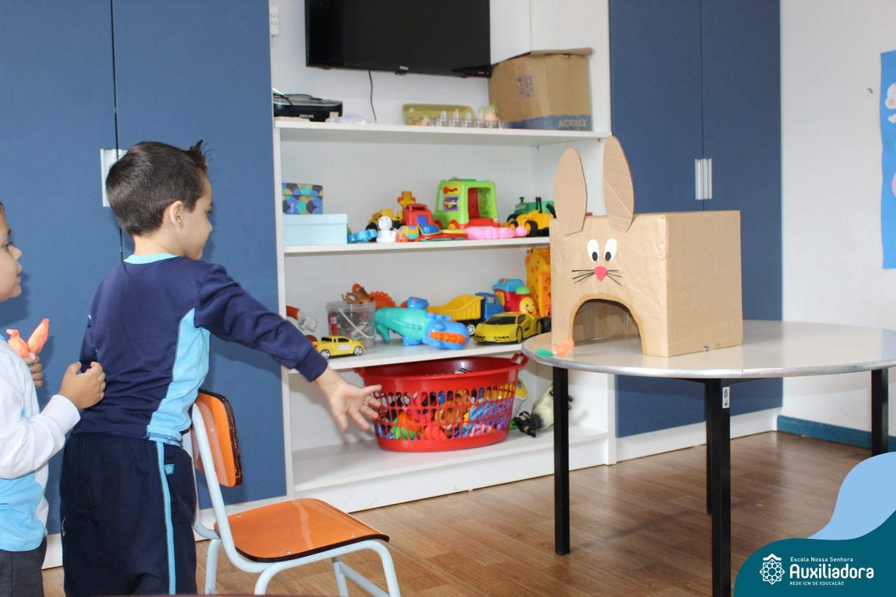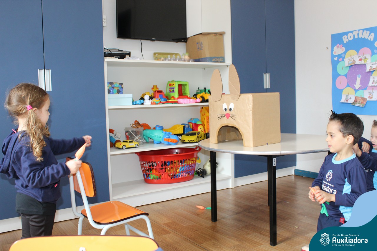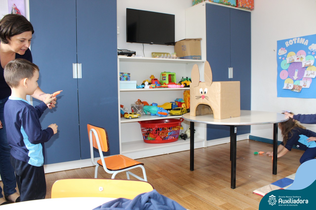 Através da Brincadeira O Coelhinho Guloso, a turma do Maternal II B se divertiu muito alimentando o Coelho com cenouras.