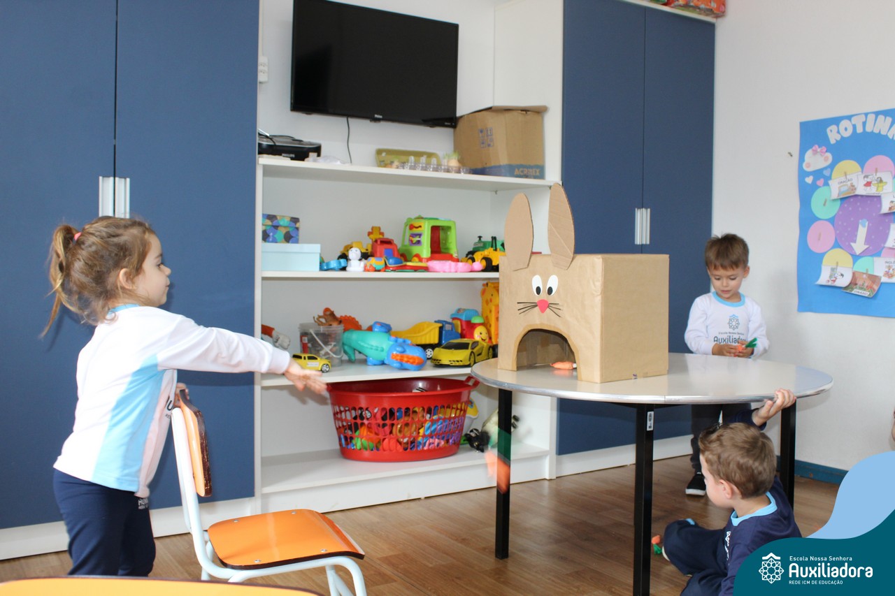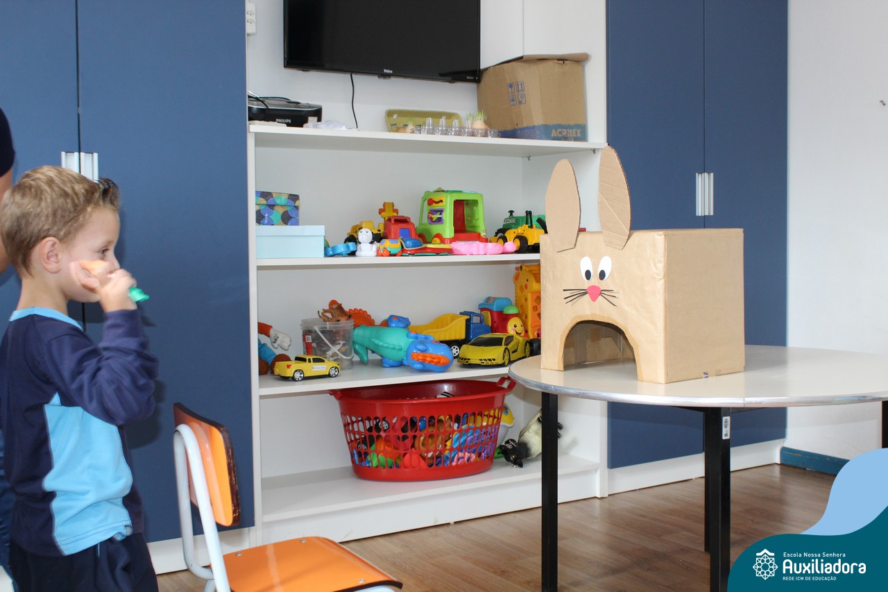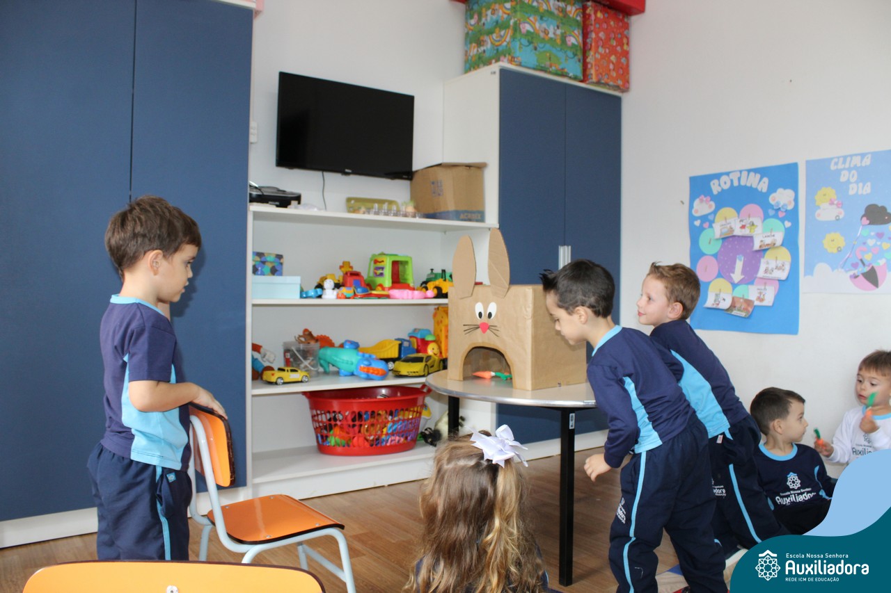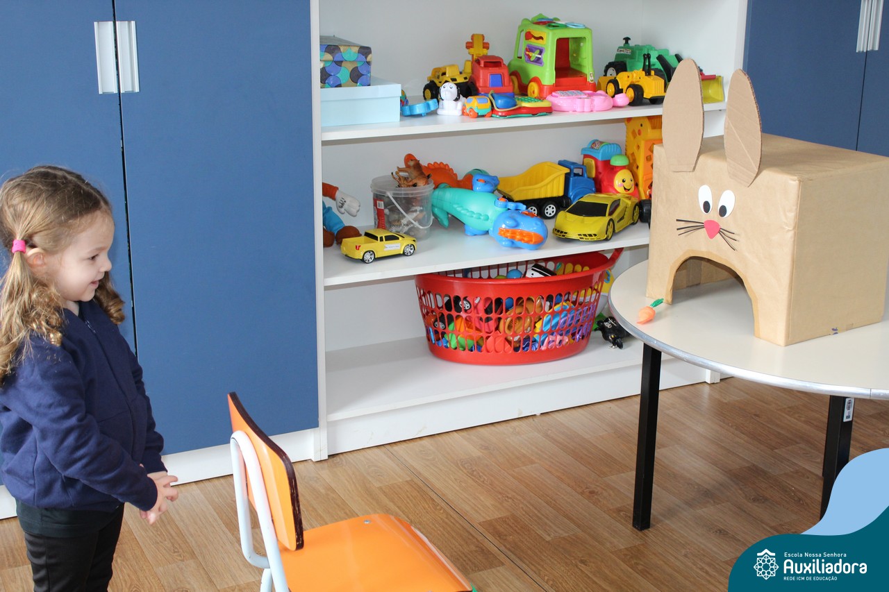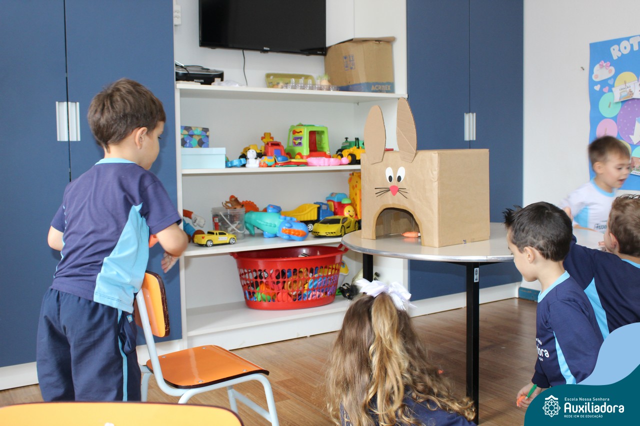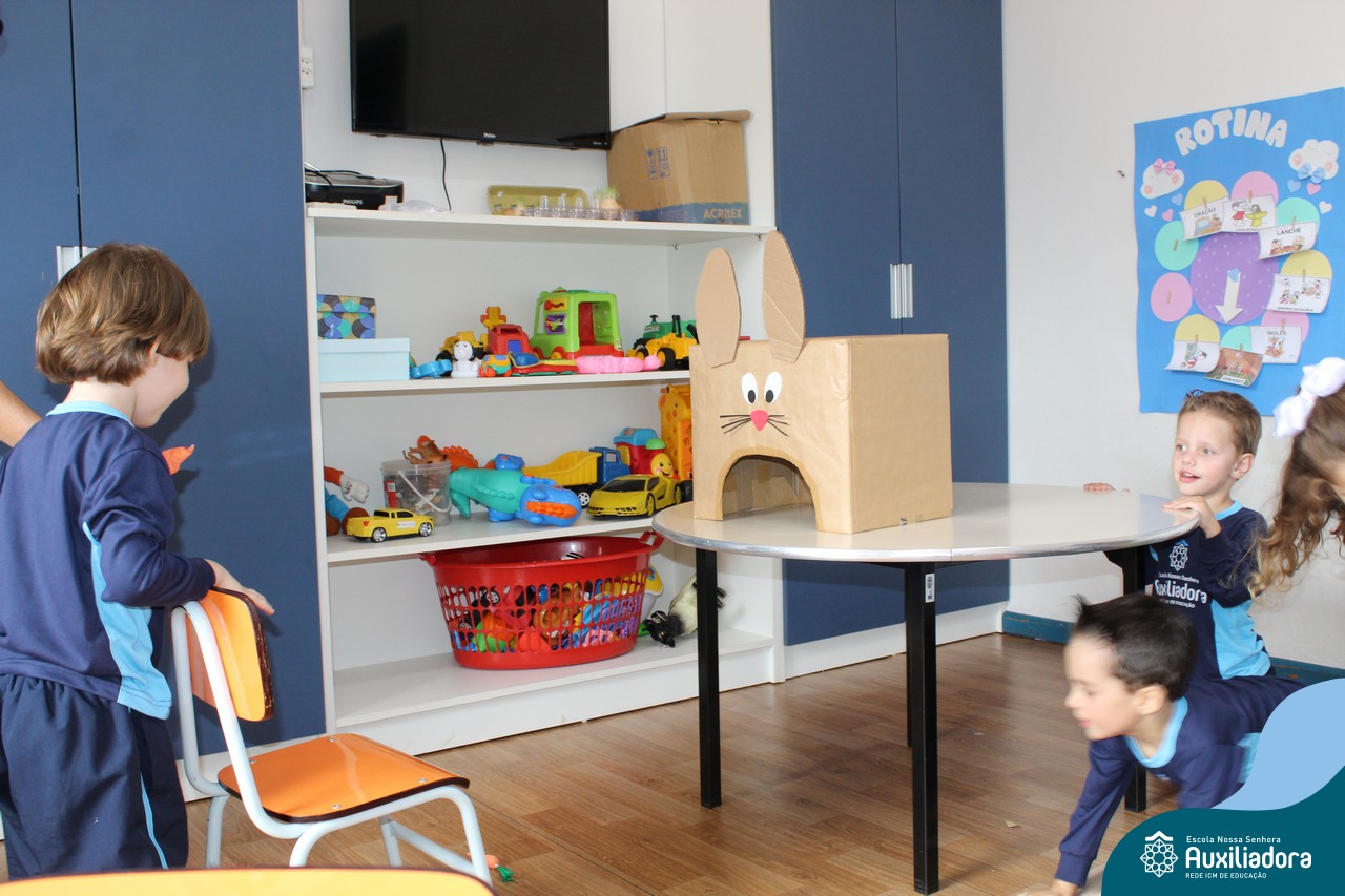 Através da Brincadeira O Coelhinho Guloso, a turma do Maternal II B se divertiu muito alimentando o Coelho com cenouras.