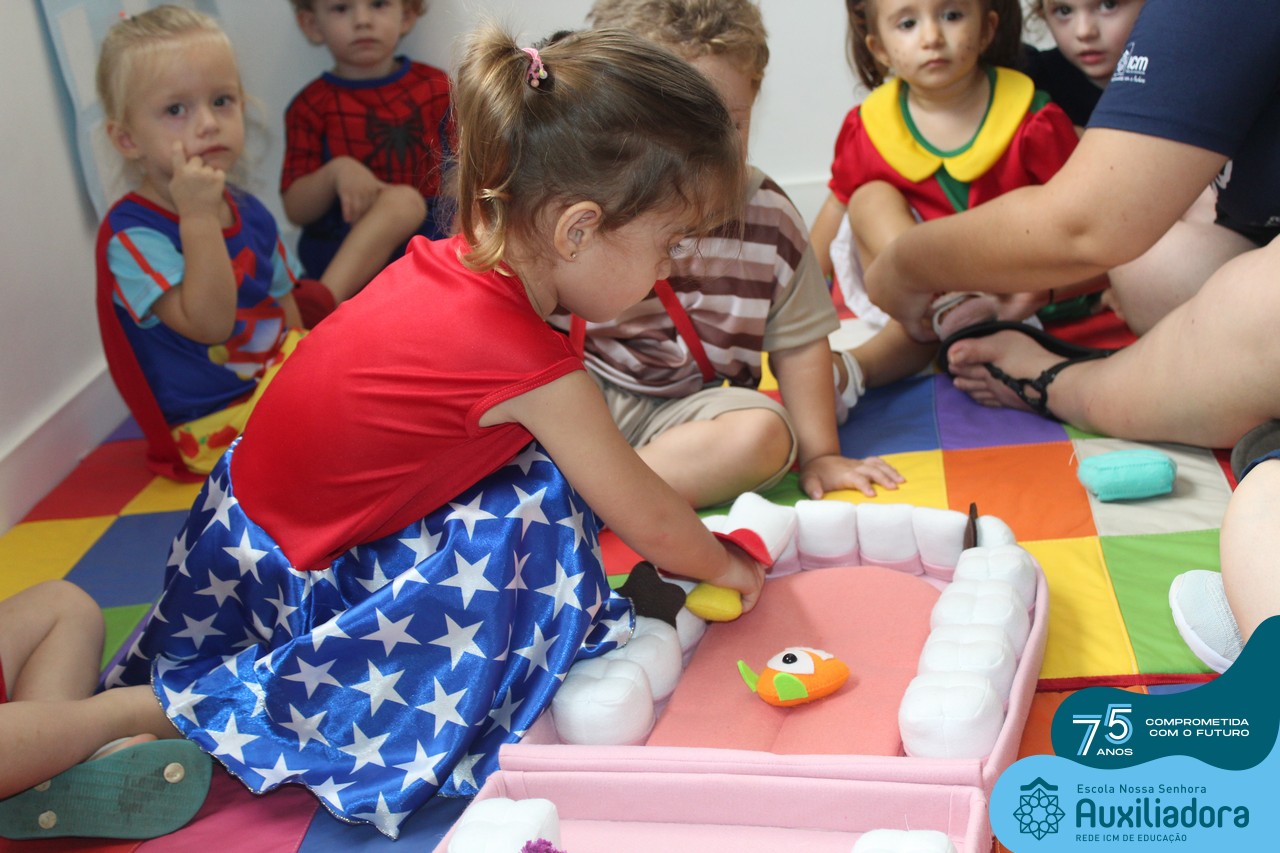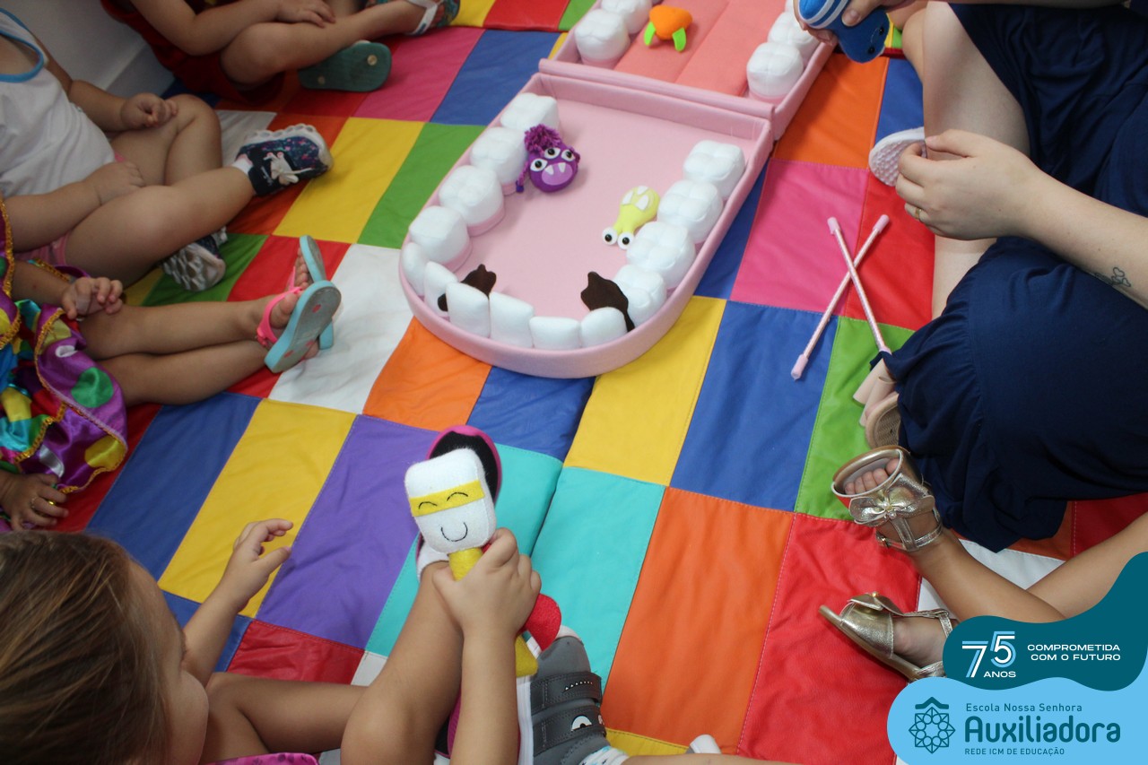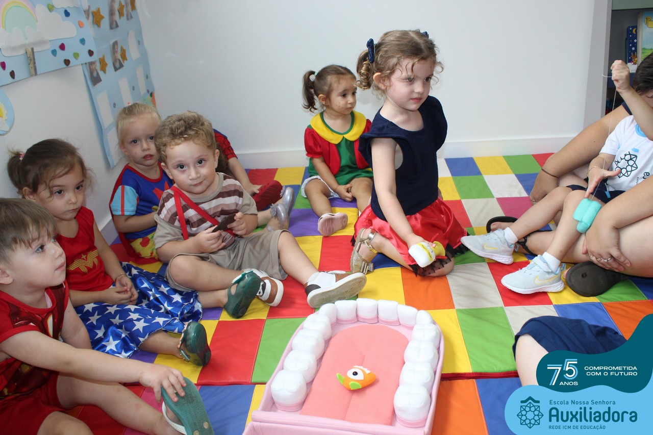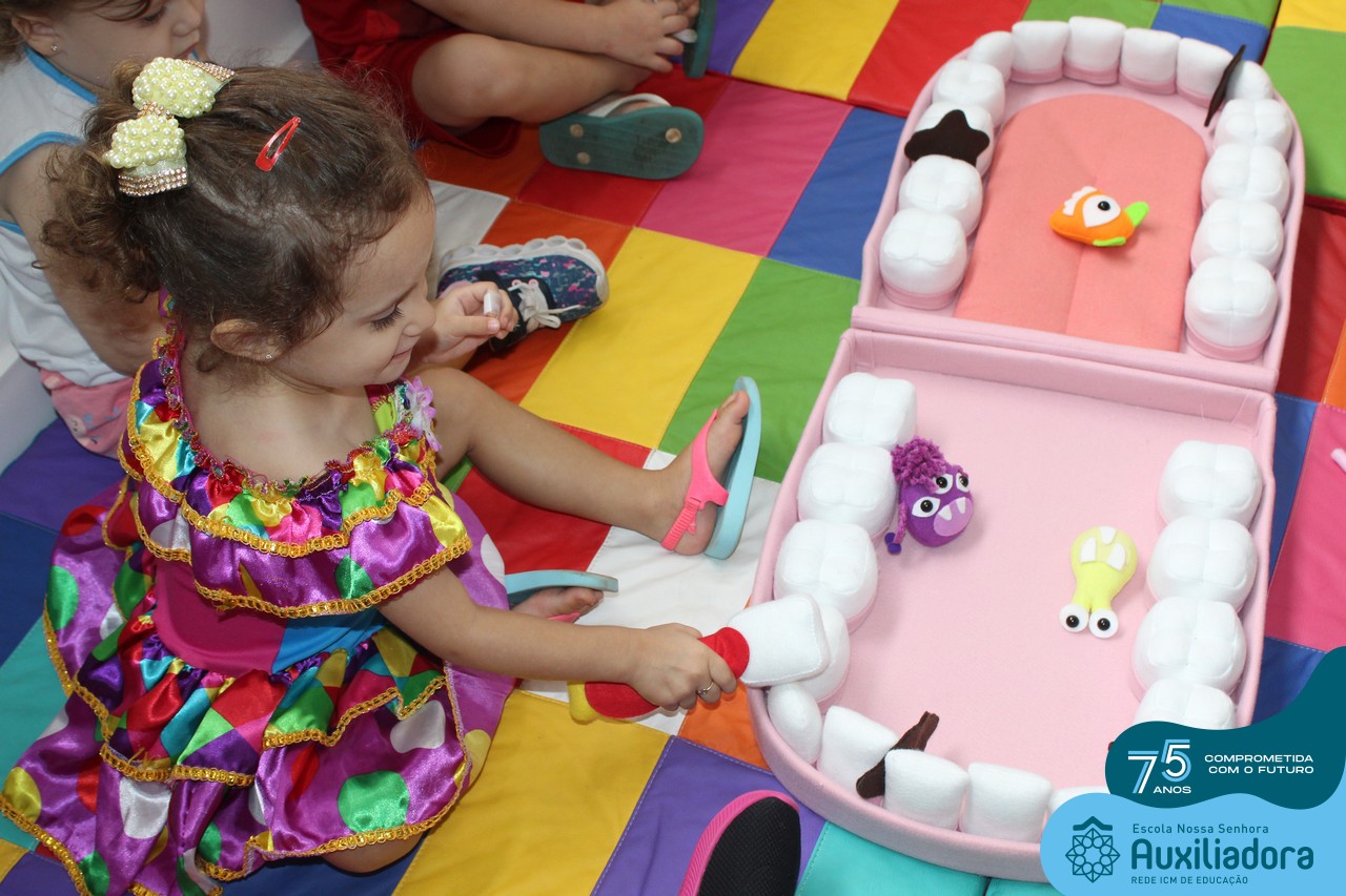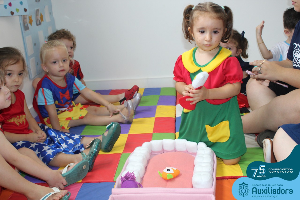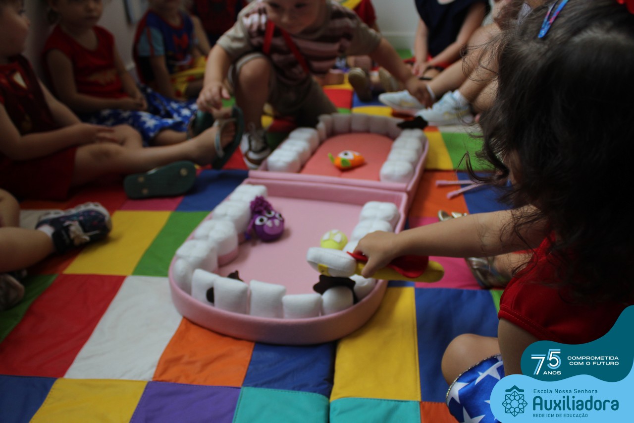 A partir de uma história muito divertida foi possĆvel conhecer e refletir sobre hĆ”bitos importantes que devemos ter com nossa higiene bucal, enfatizando sobre a importĆ¢ncia da escovação dos dentes.