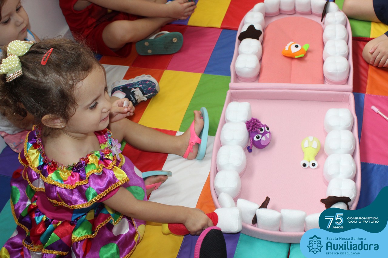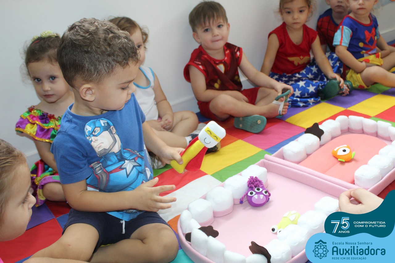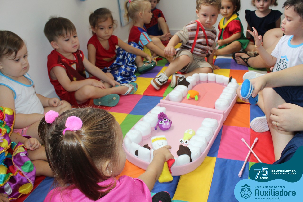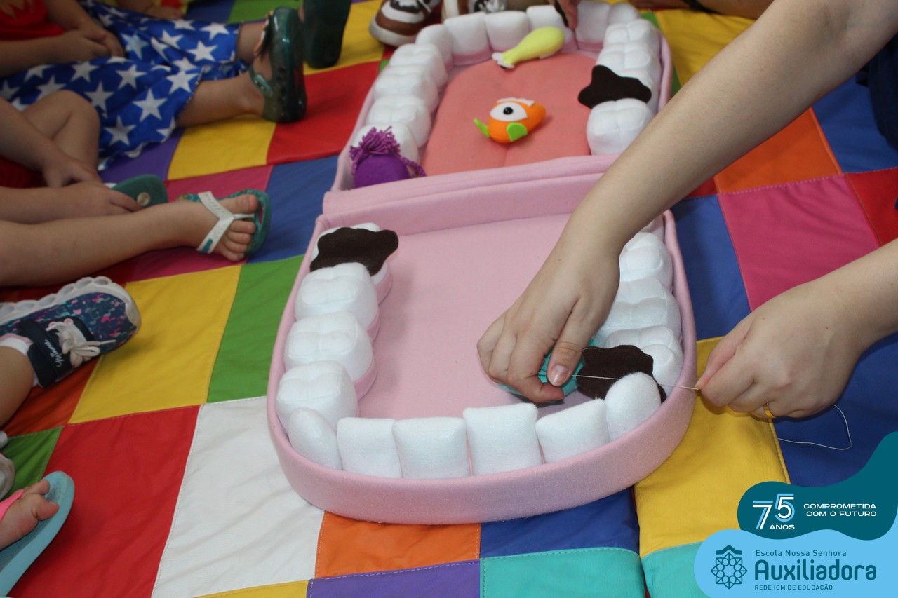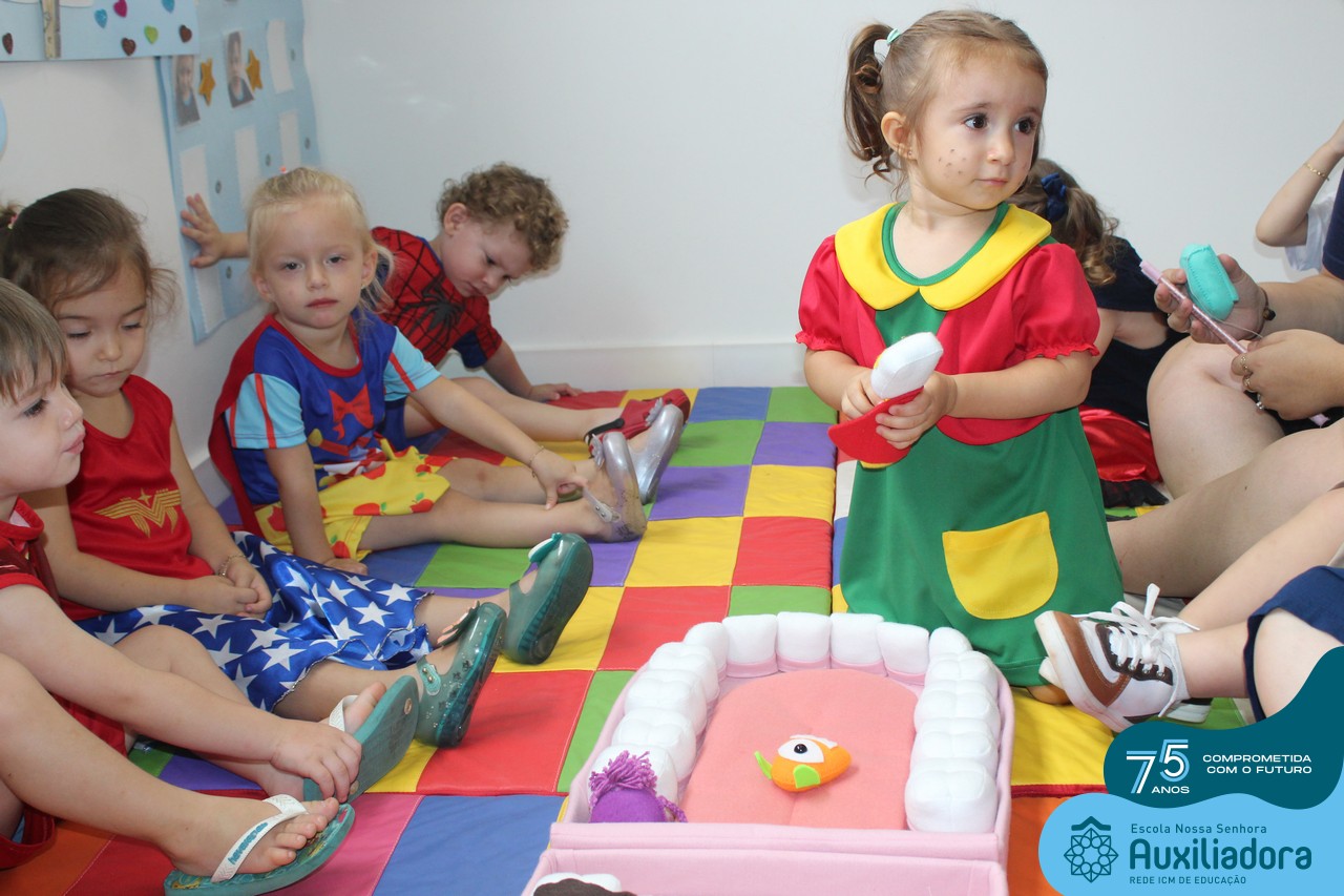 A partir de uma história muito divertida foi possĆvel conhecer e refletir sobre hĆ”bitos importantes que devemos ter com nossa higiene bucal, enfatizando sobre a importĆ¢ncia da escovação dos dentes.