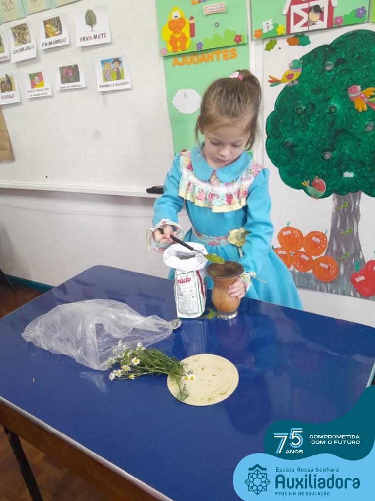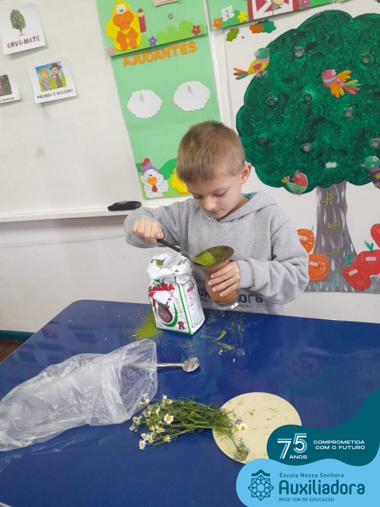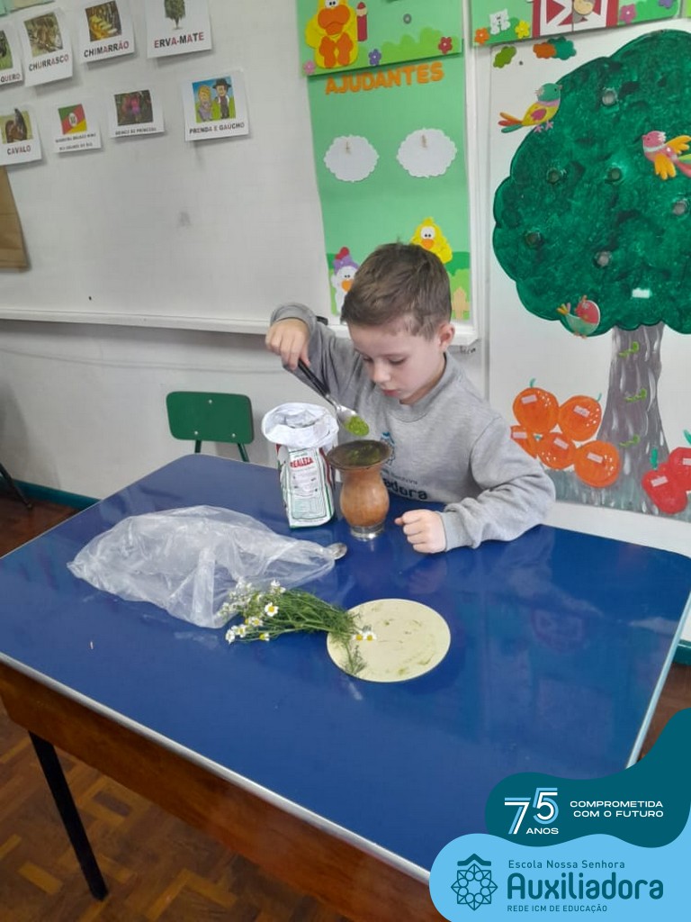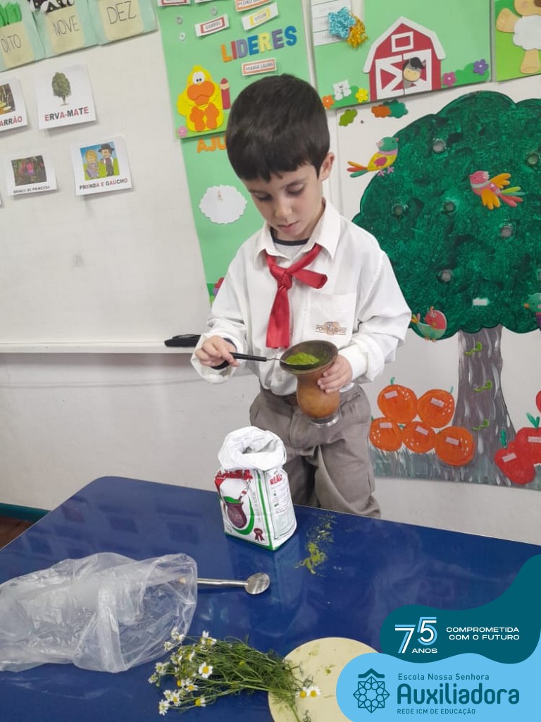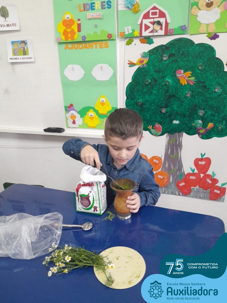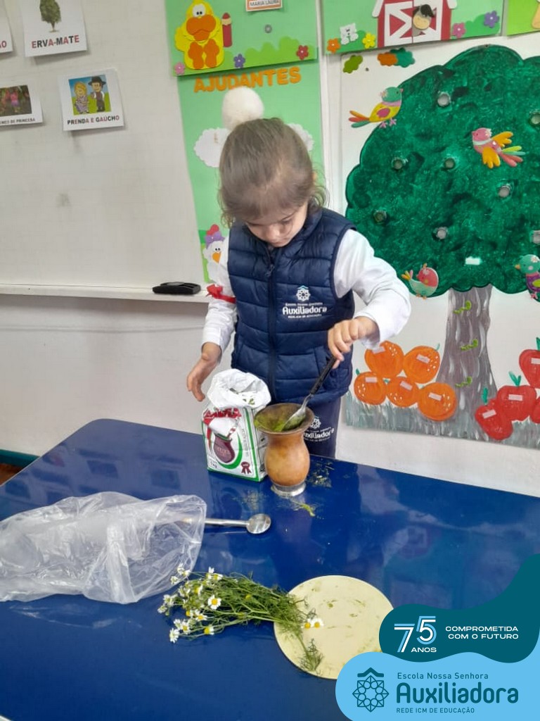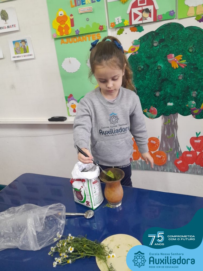 Oficina de chimarrão. Esta atividade teve por objetivo vivenciar concretamente o símbolo mais usado pelo gaúcho, o chimarrão! As crianças puderam experienciar o jeito gaúcho de cevar o mate, ter contato com a erva-mate, o passo-a-passo e por fim a alegria de saboreá-lo. As crianças se sentiram realizadas com o momento e atentas com os detalhes do preparo do chimarrão.