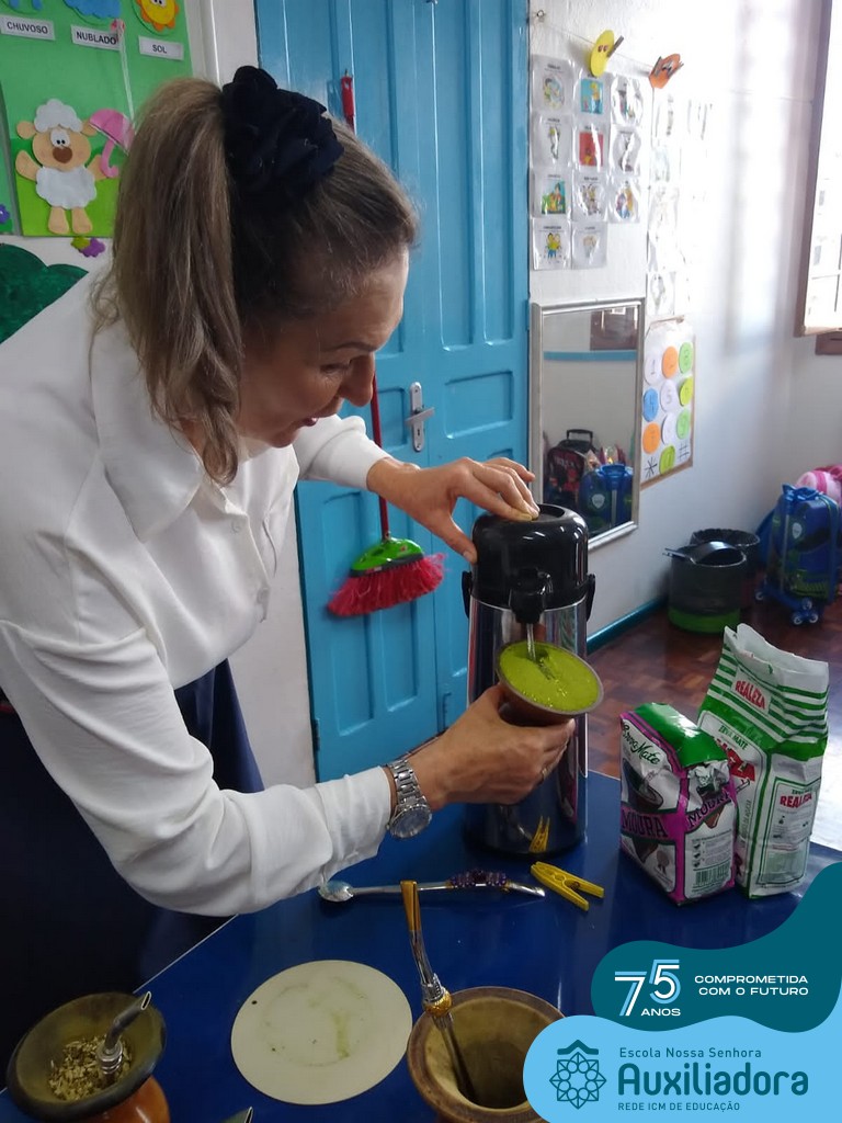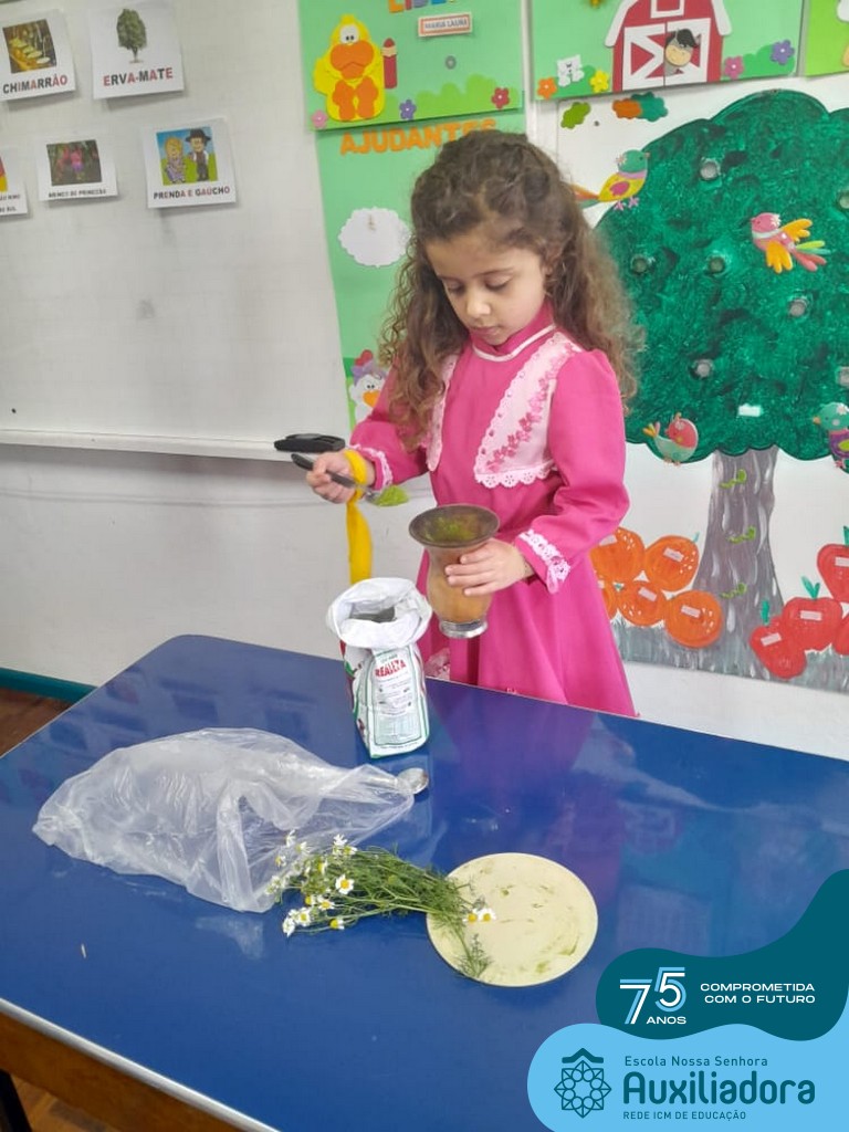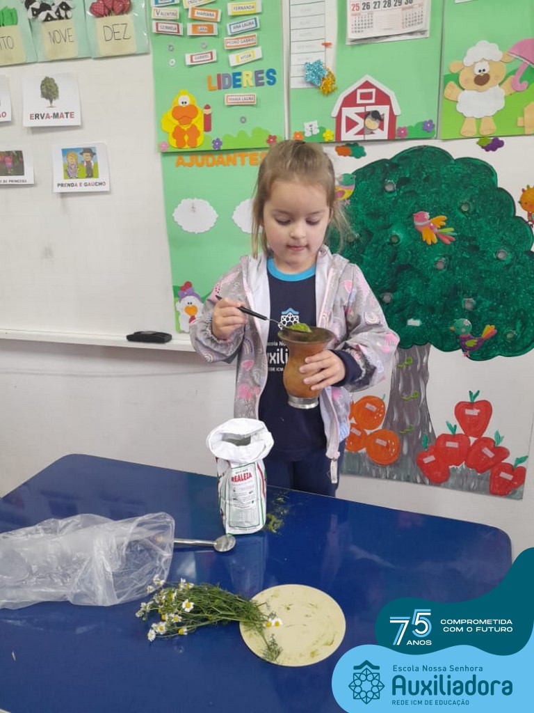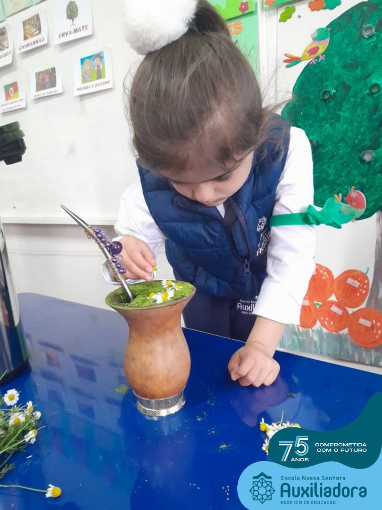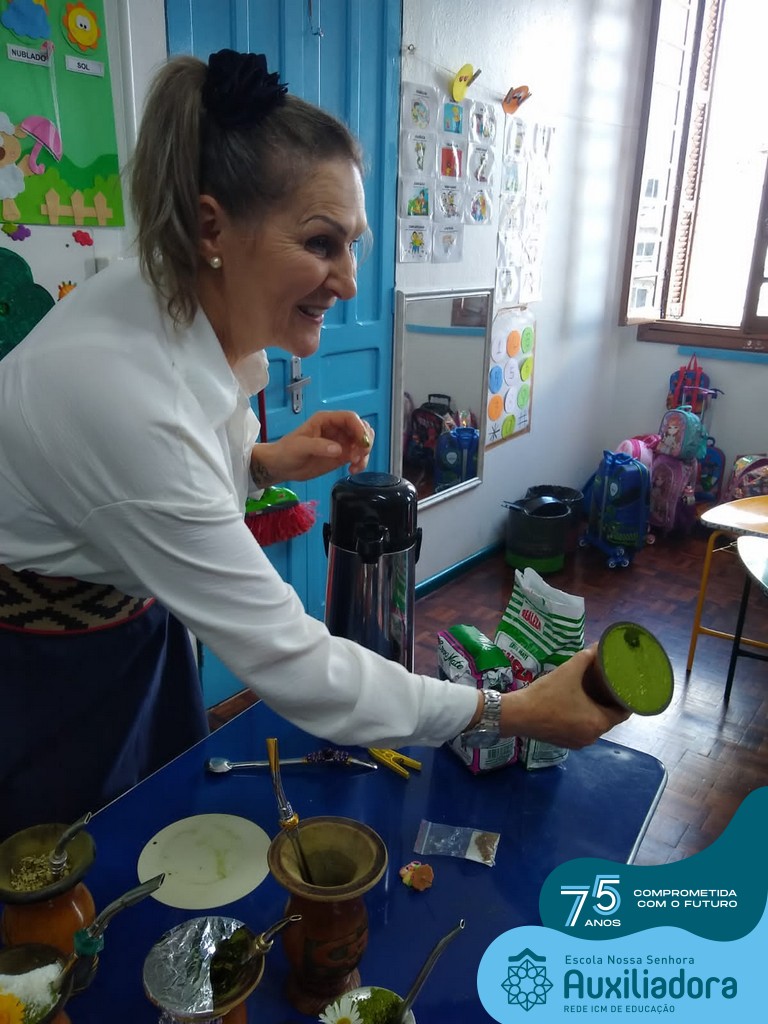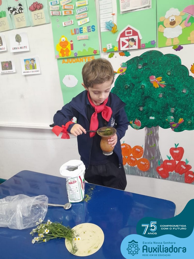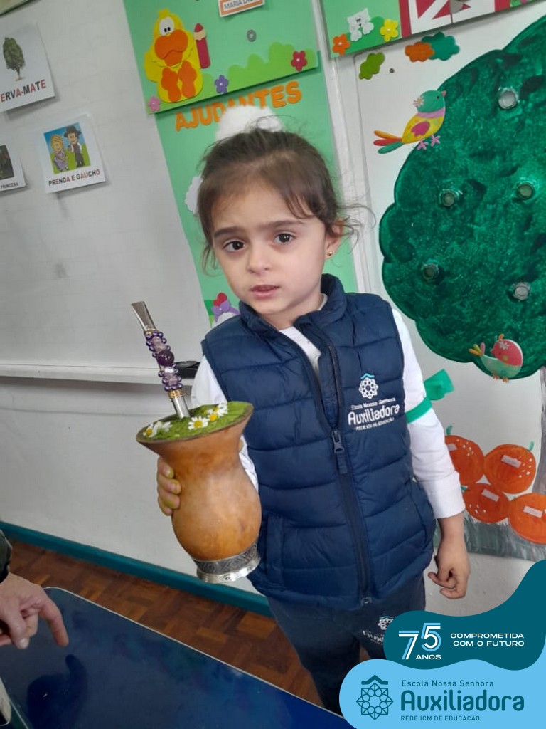 Oficina de chimarrão. Esta atividade teve por objetivo vivenciar concretamente o símbolo mais usado pelo gaúcho, o chimarrão! As crianças puderam experienciar o jeito gaúcho de cevar o mate, ter contato com a erva-mate, o passo-a-passo e por fim a alegria de saboreá-lo. As crianças se sentiram realizadas com o momento e atentas com os detalhes do preparo do chimarrão.