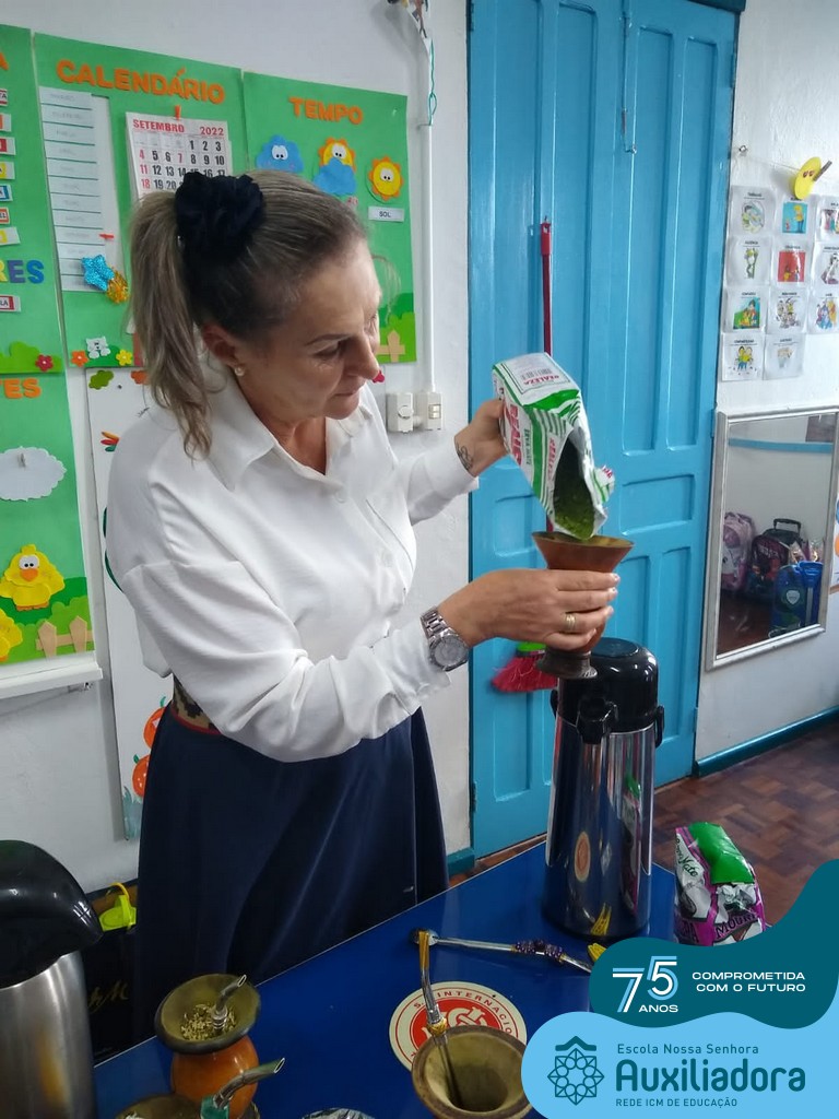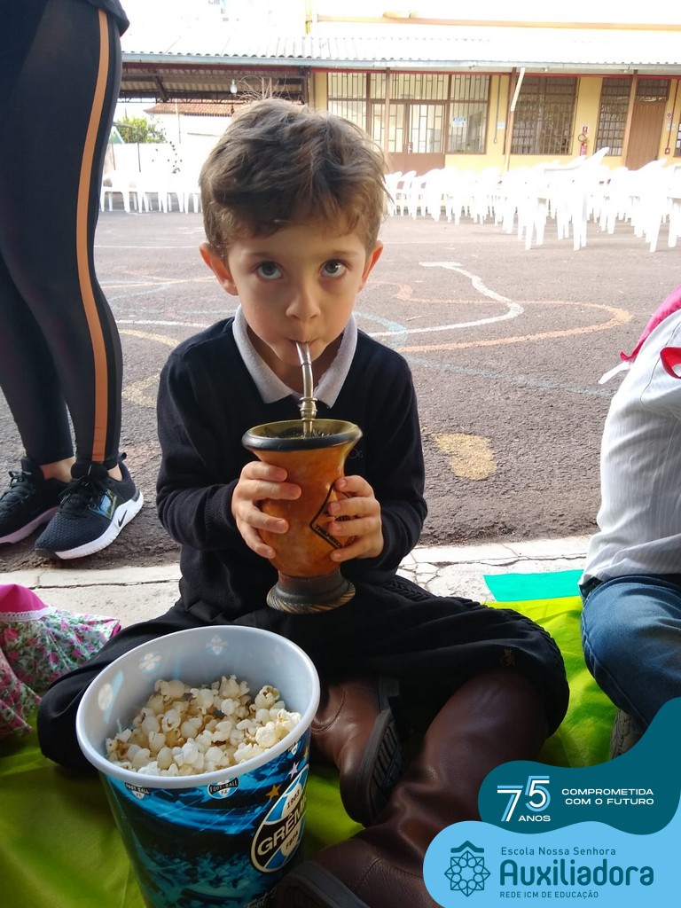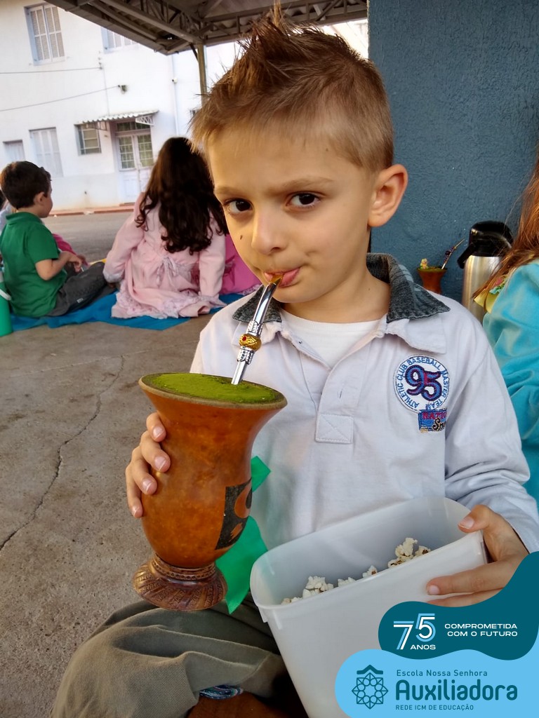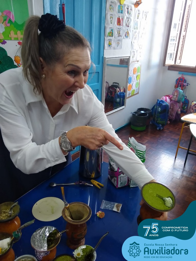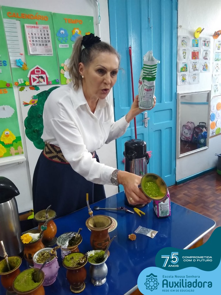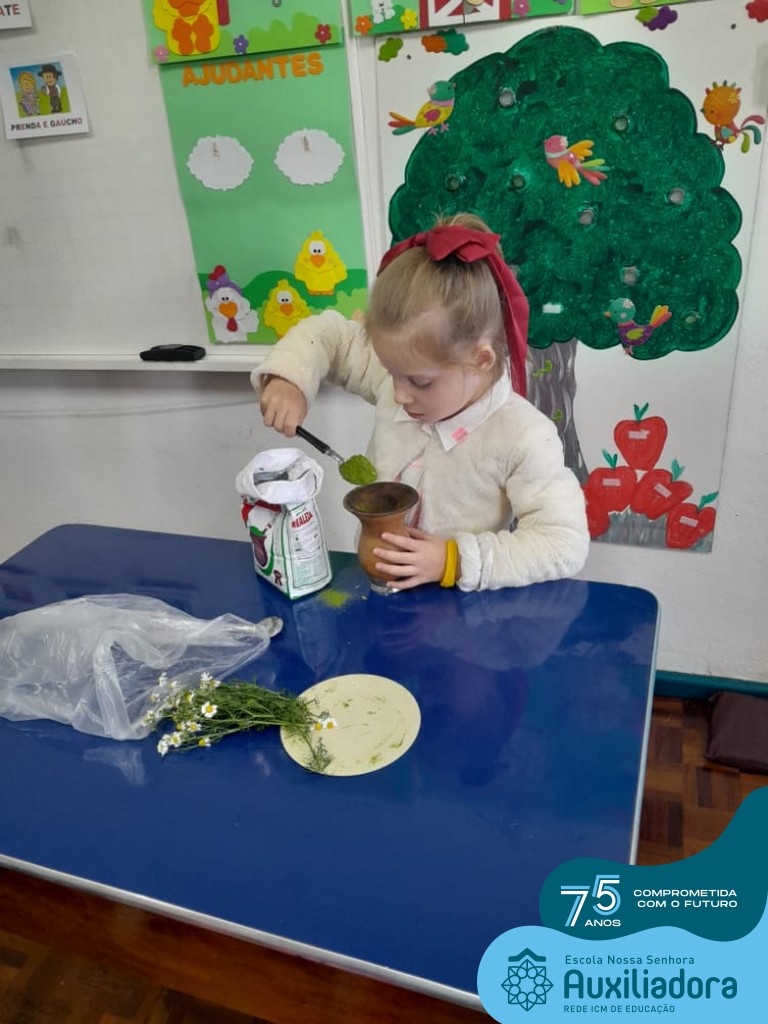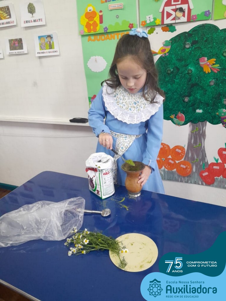 Oficina de chimarrão. Esta atividade teve por objetivo vivenciar concretamente o símbolo mais usado pelo gaúcho, o chimarrão! As crianças puderam experienciar o jeito gaúcho de cevar o mate, ter contato com a erva-mate, o passo-a-passo e por fim a alegria de saboreá-lo. As crianças se sentiram realizadas com o momento e atentas com os detalhes do preparo do chimarrão.