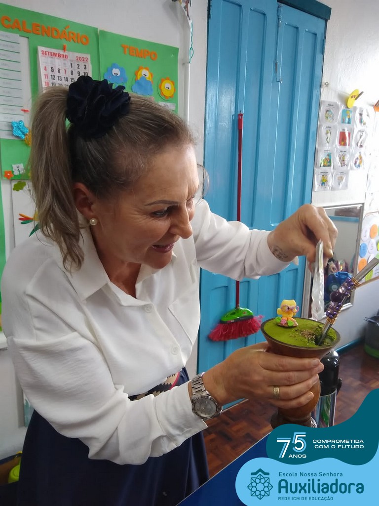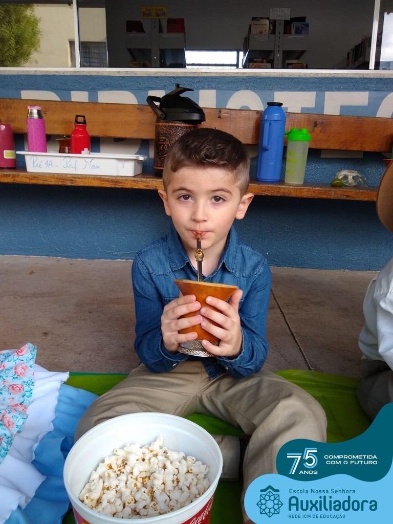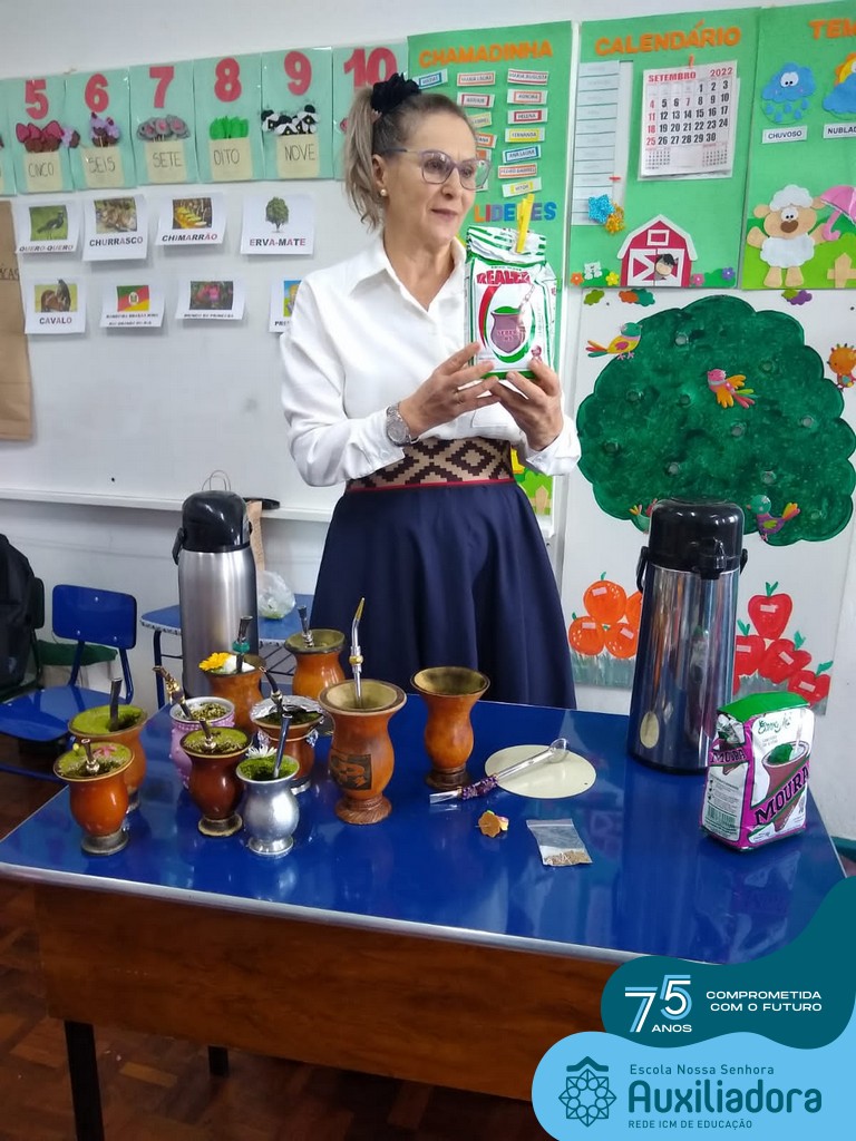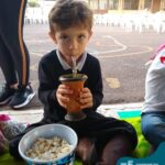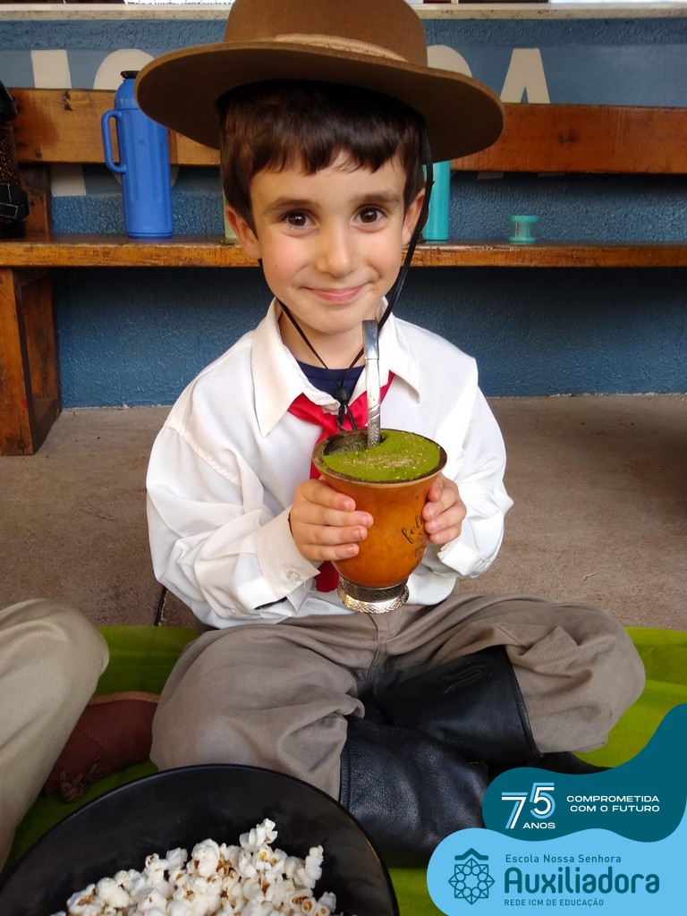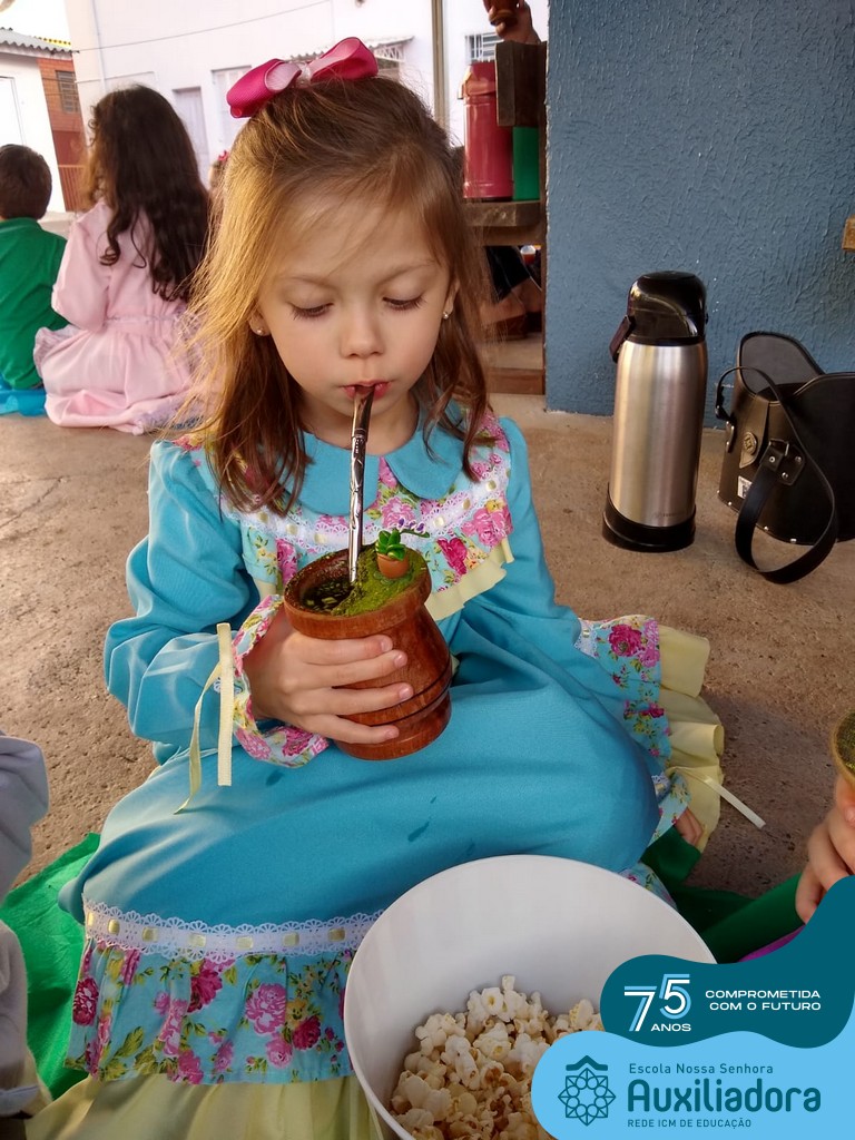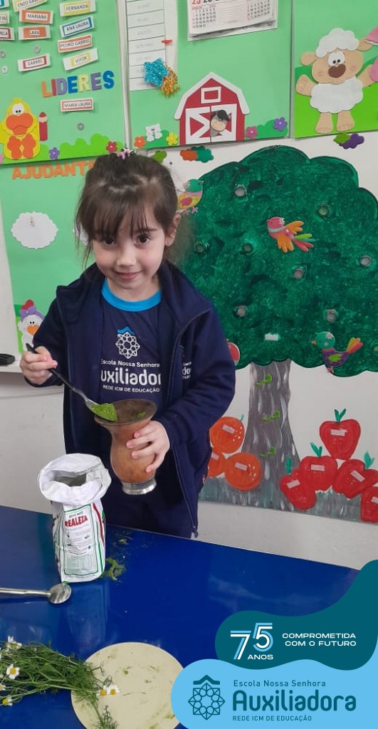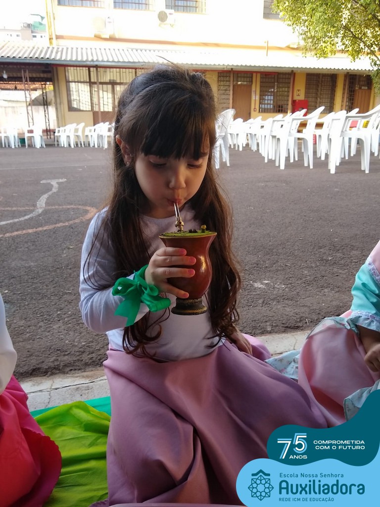 Oficina de chimarrão. Esta atividade teve por objetivo vivenciar concretamente o símbolo mais usado pelo gaúcho, o chimarrão! As crianças puderam experienciar o jeito gaúcho de cevar o mate, ter contato com a erva-mate, o passo-a-passo e por fim a alegria de saboreá-lo. As crianças se sentiram realizadas com o momento e atentas com os detalhes do preparo do chimarrão.