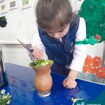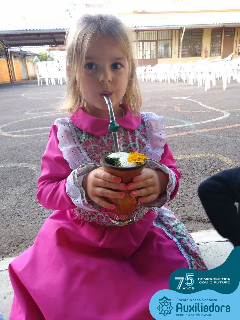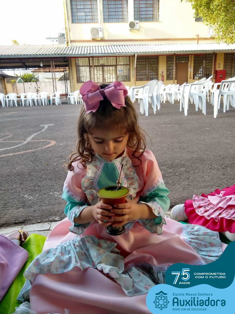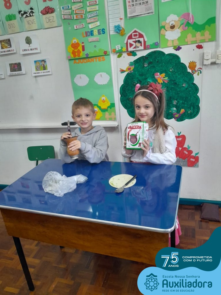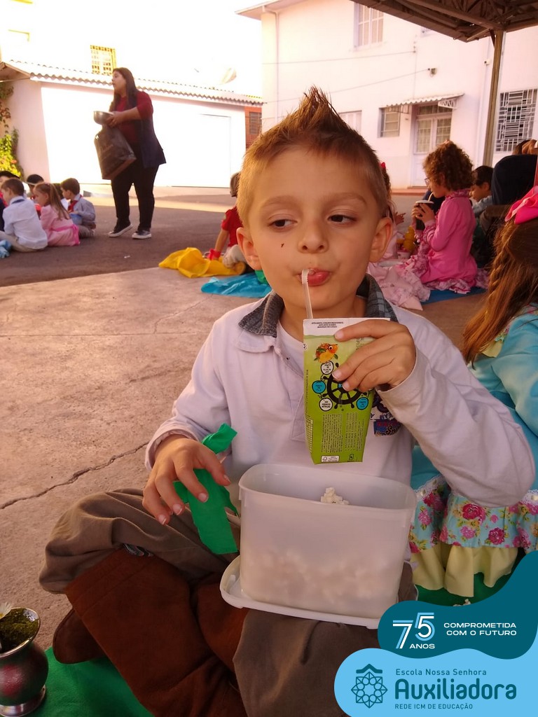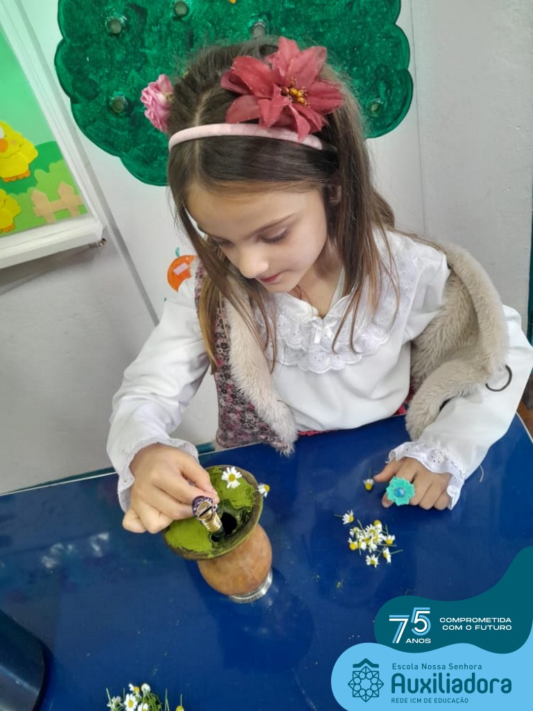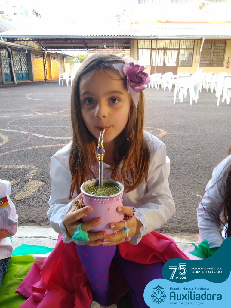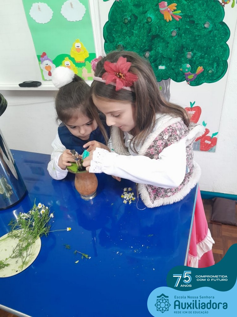 Oficina de chimarrão. Esta atividade teve por objetivo vivenciar concretamente o símbolo mais usado pelo gaúcho, o chimarrão! As crianças puderam experienciar o jeito gaúcho de cevar o mate, ter contato com a erva-mate, o passo-a-passo e por fim a alegria de saboreá-lo. As crianças se sentiram realizadas com o momento e atentas com os detalhes do preparo do chimarrão.