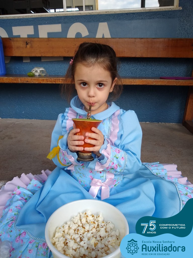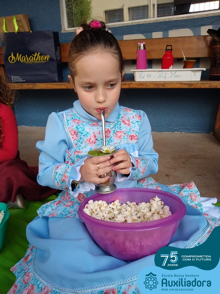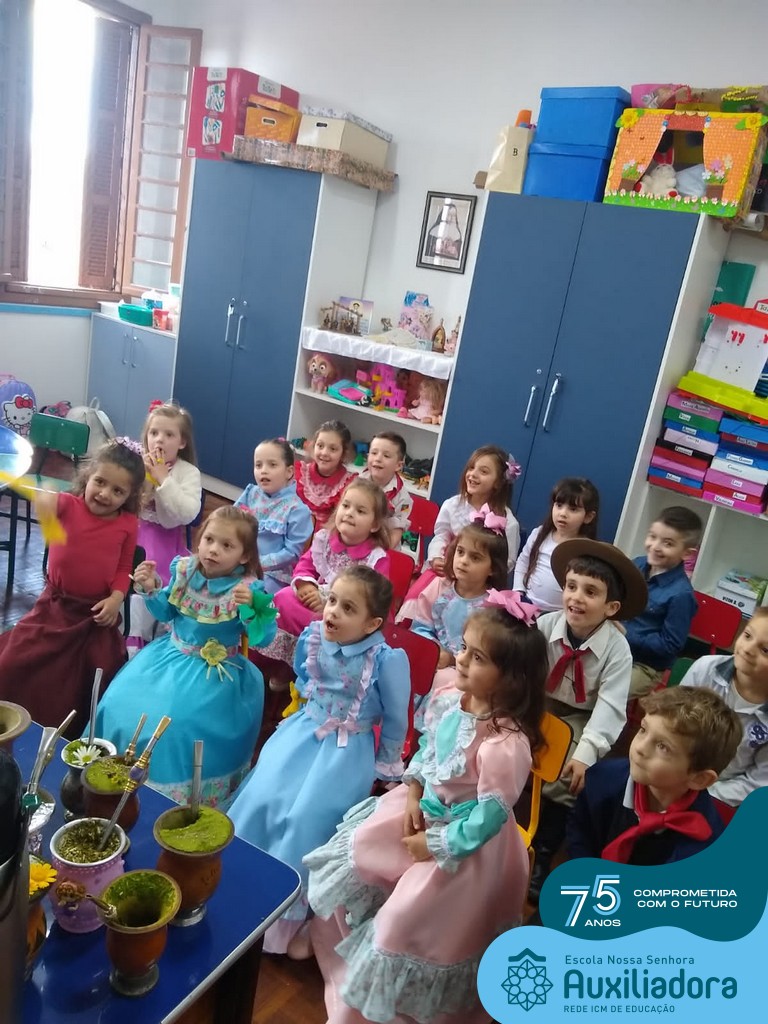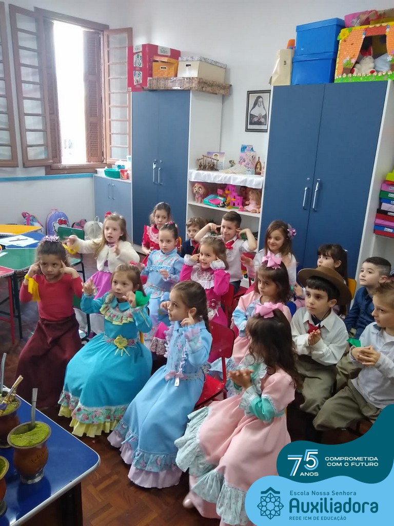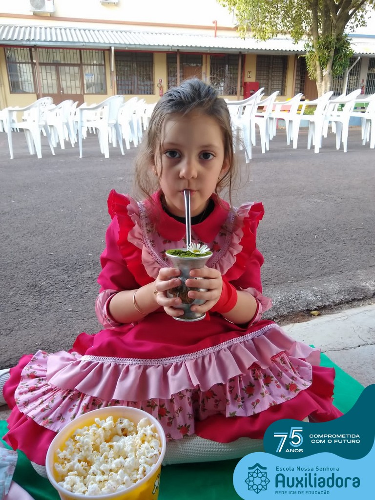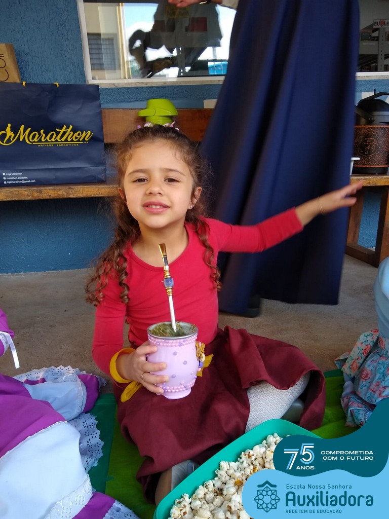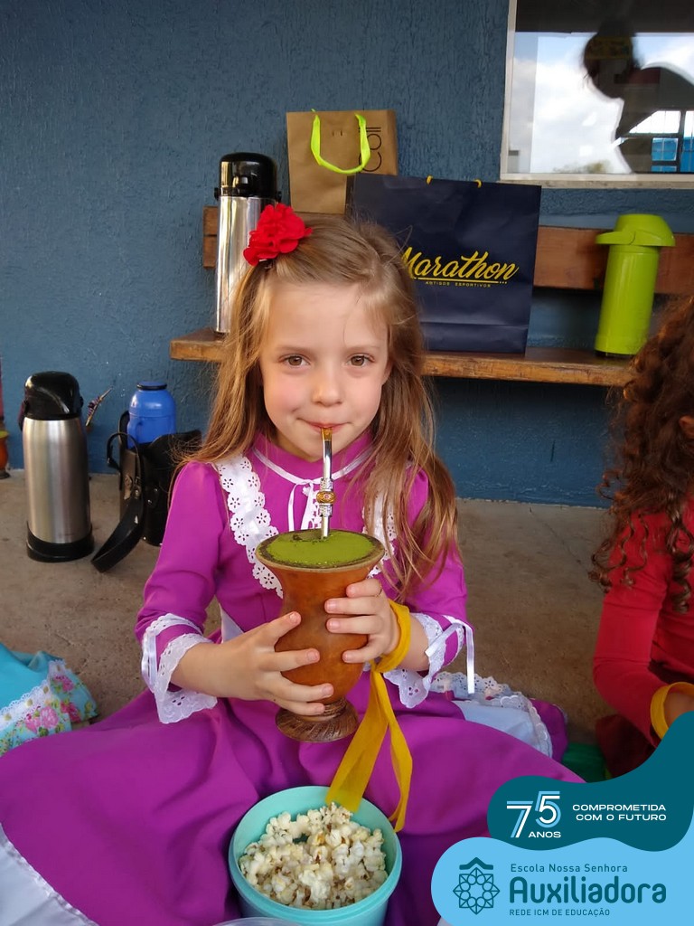 Oficina de chimarrão. Esta atividade teve por objetivo vivenciar concretamente o símbolo mais usado pelo gaúcho, o chimarrão! As crianças puderam experienciar o jeito gaúcho de cevar o mate, ter contato com a erva-mate, o passo-a-passo e por fim a alegria de saboreá-lo. As crianças se sentiram realizadas com o momento e atentas com os detalhes do preparo do chimarrão.