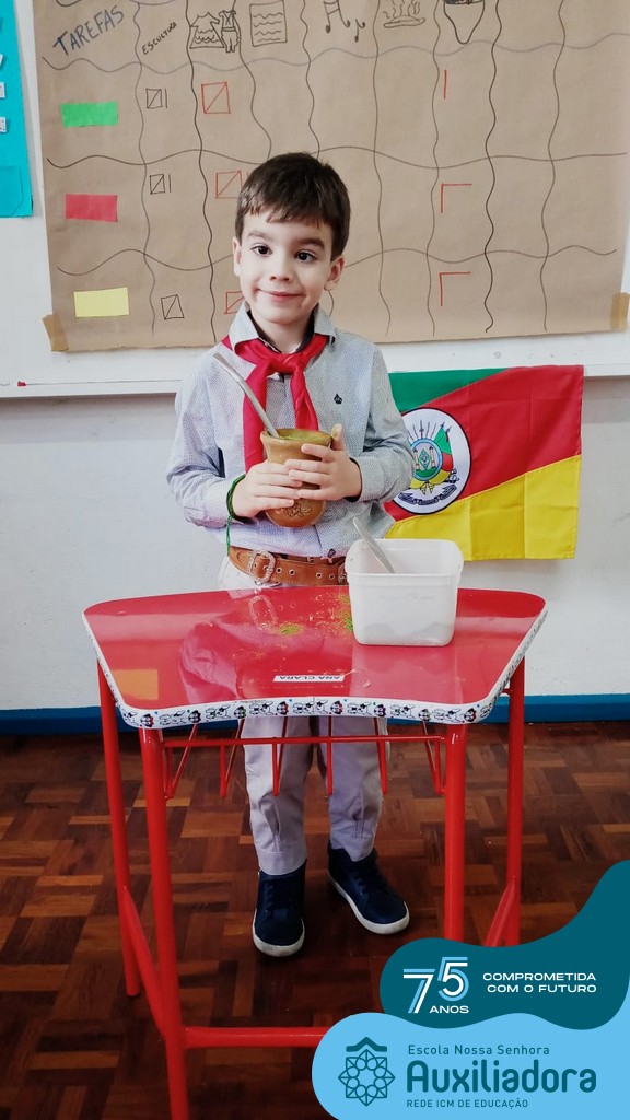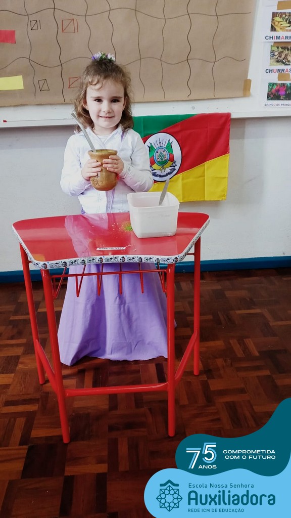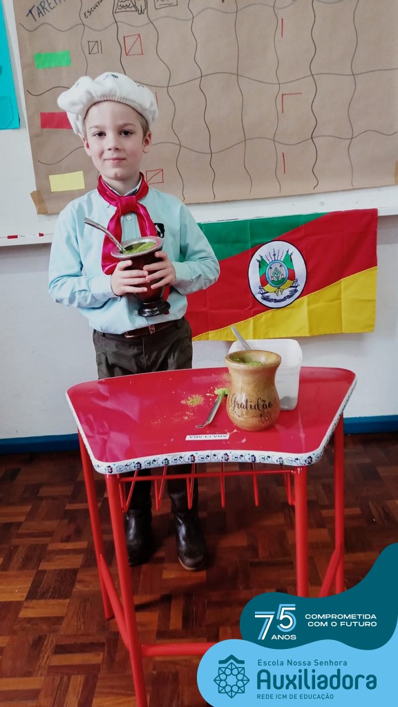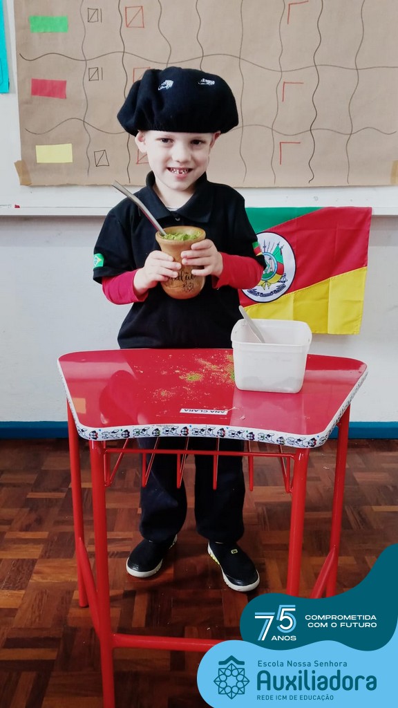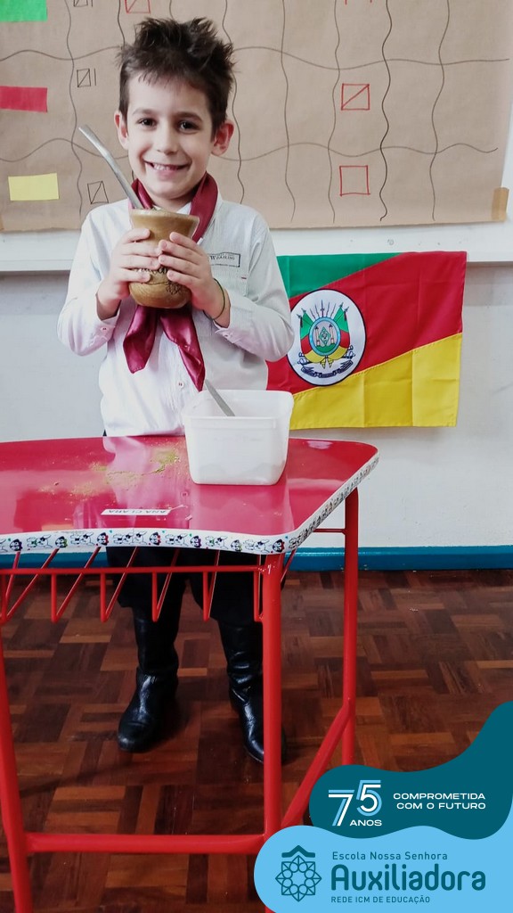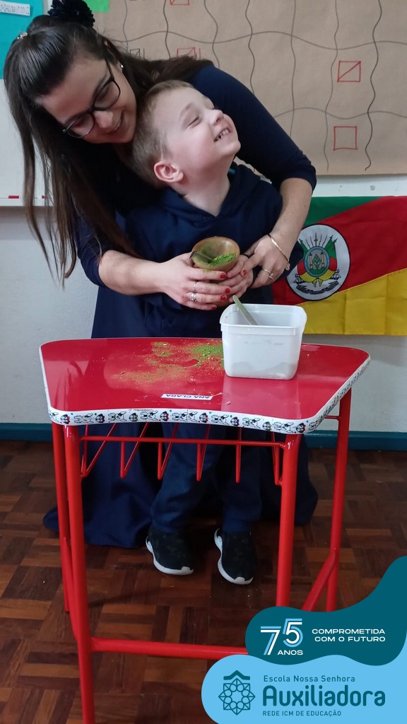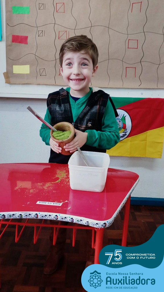 🎵 Oficina de chimarrão. Esta atividade teve por objetivo vivenciar concretamente o símbolo mais usado pelo gaúcho, o chimarrão! As crianças puderam experienciar o jeito gaúcho de cevar o mate, ter contato com a erva-mate, o passo-a-passo e por fim a alegria de saboreá-lo. As crianças se sentiram realizadas com o momento e atentas com os detalhes do preparo do chimarrão.