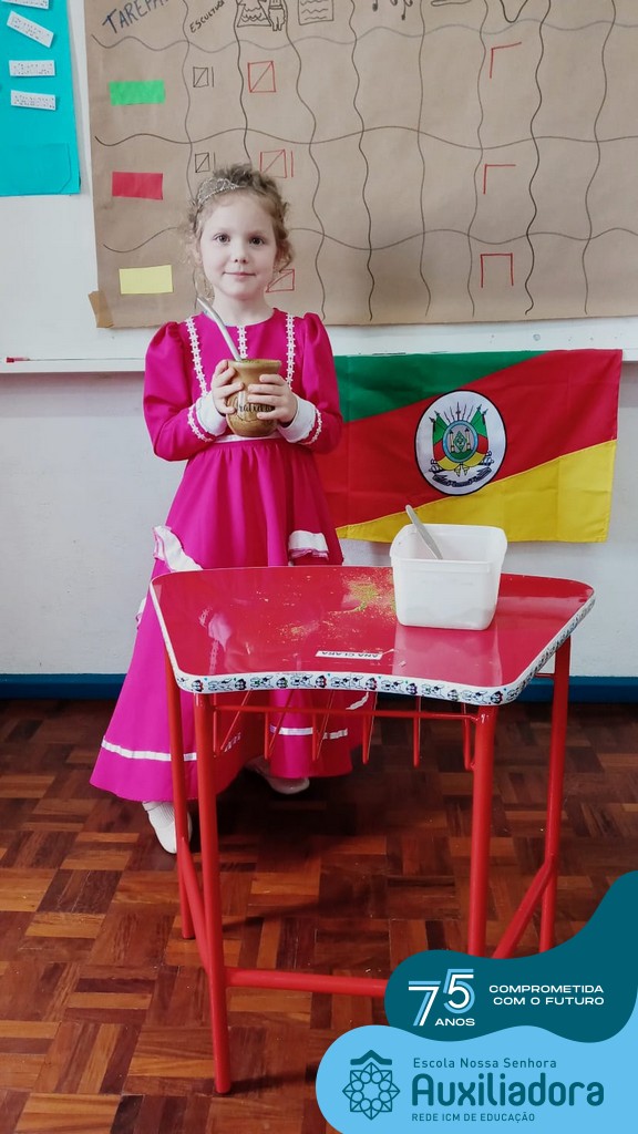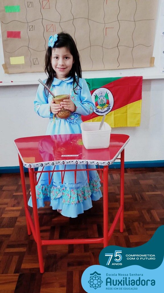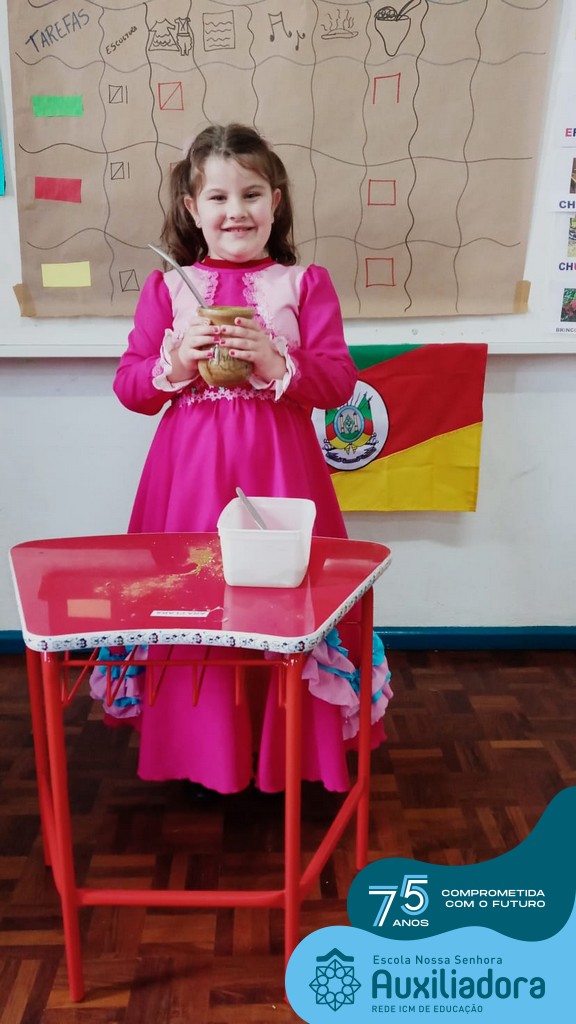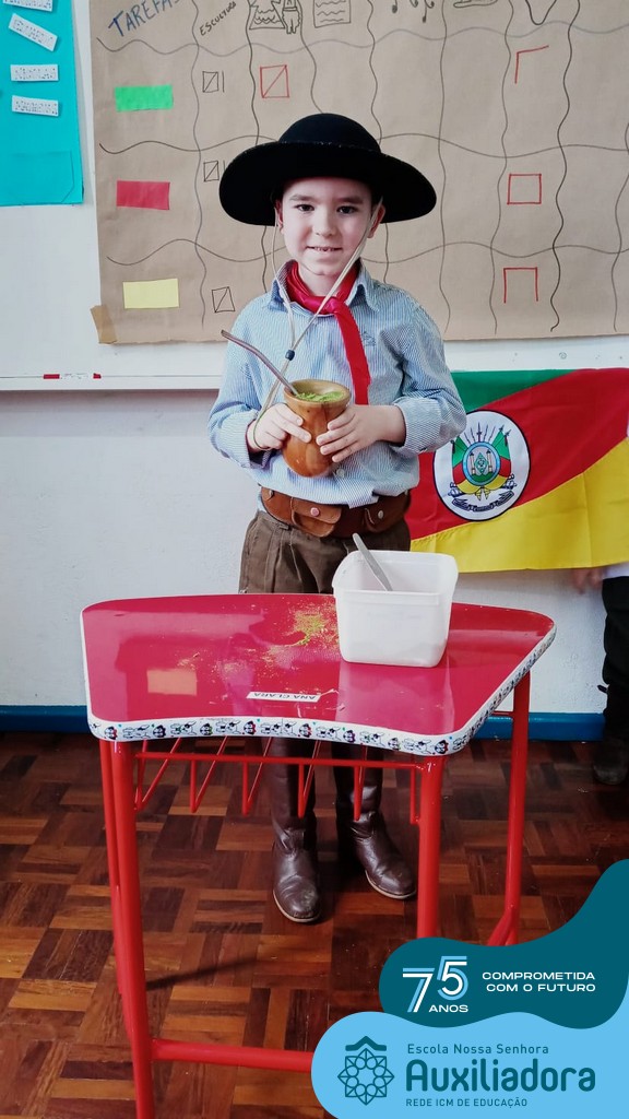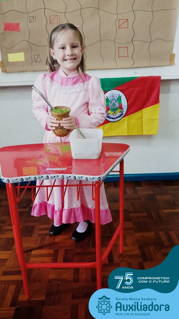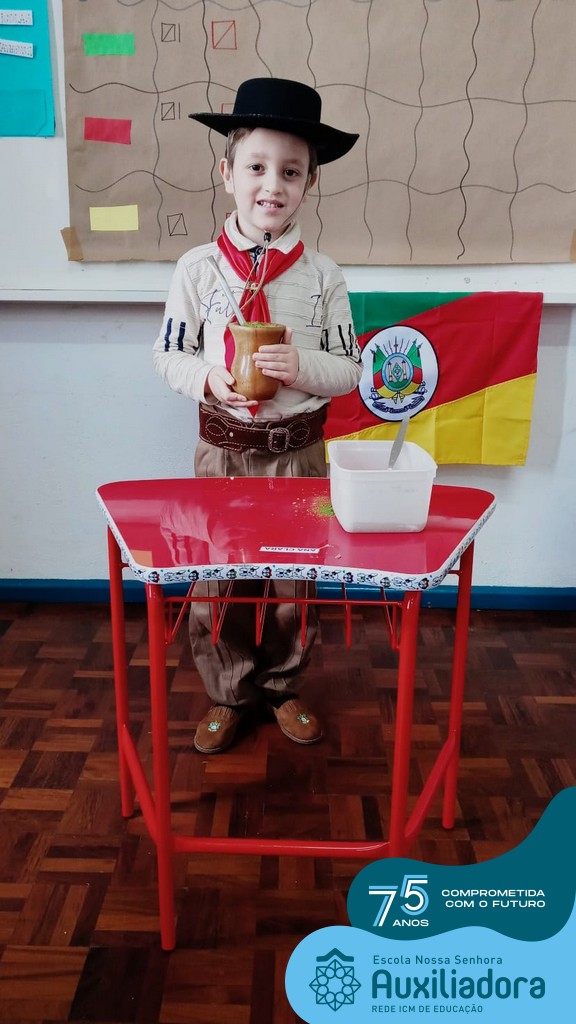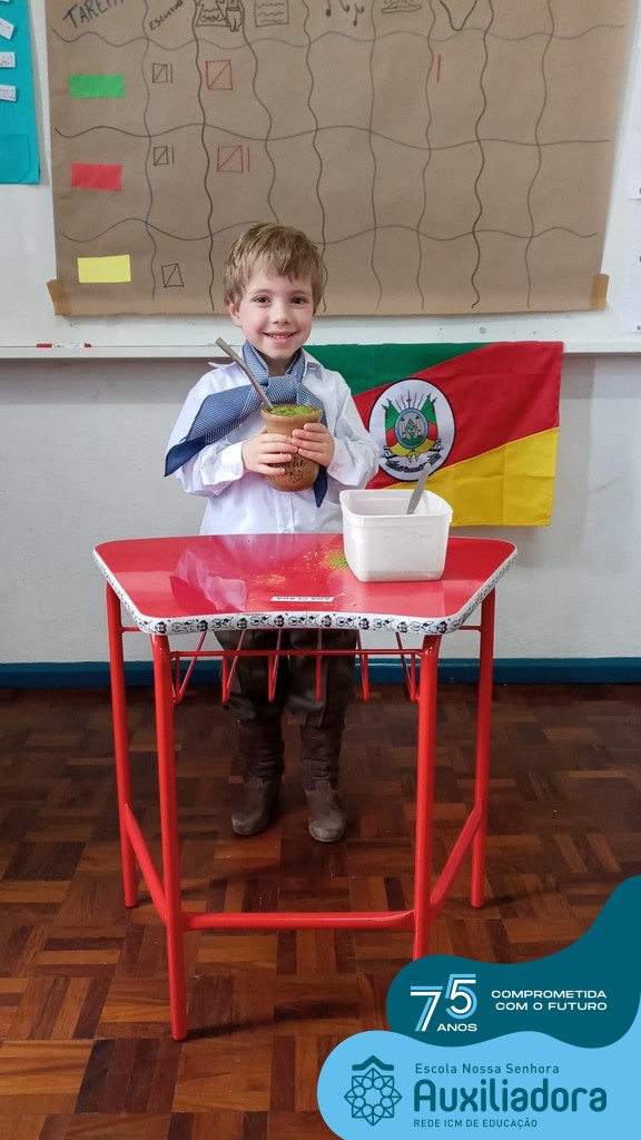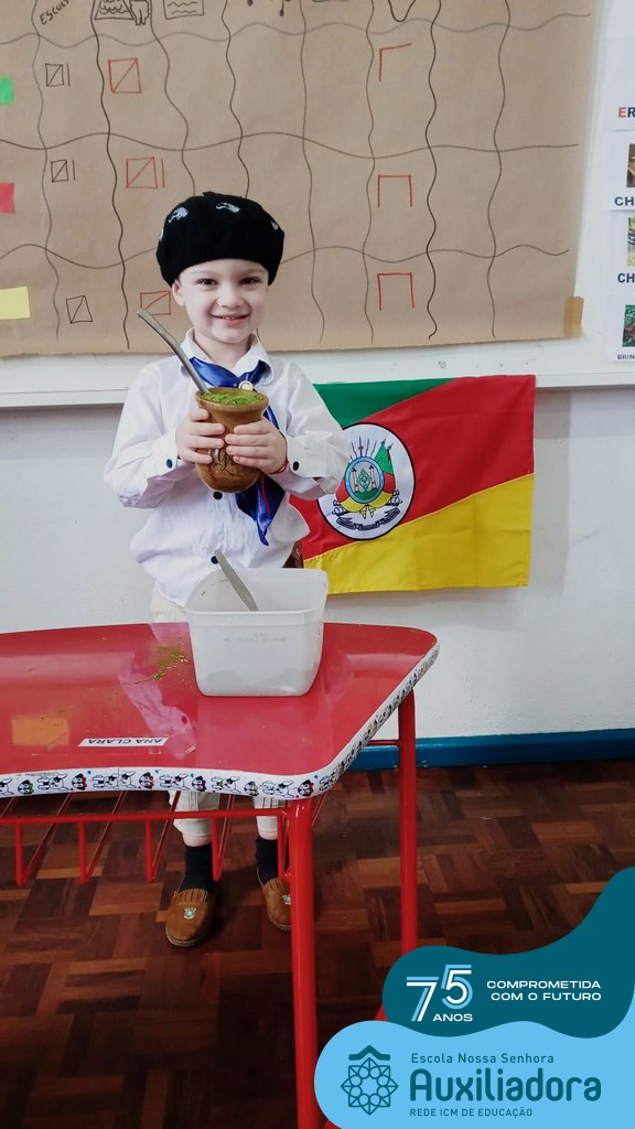 🎵 Oficina de chimarrão. Esta atividade teve por objetivo vivenciar concretamente o símbolo mais usado pelo gaúcho, o chimarrão! As crianças puderam experienciar o jeito gaúcho de cevar o mate, ter contato com a erva-mate, o passo-a-passo e por fim a alegria de saboreá-lo. As crianças se sentiram realizadas com o momento e atentas com os detalhes do preparo do chimarrão.