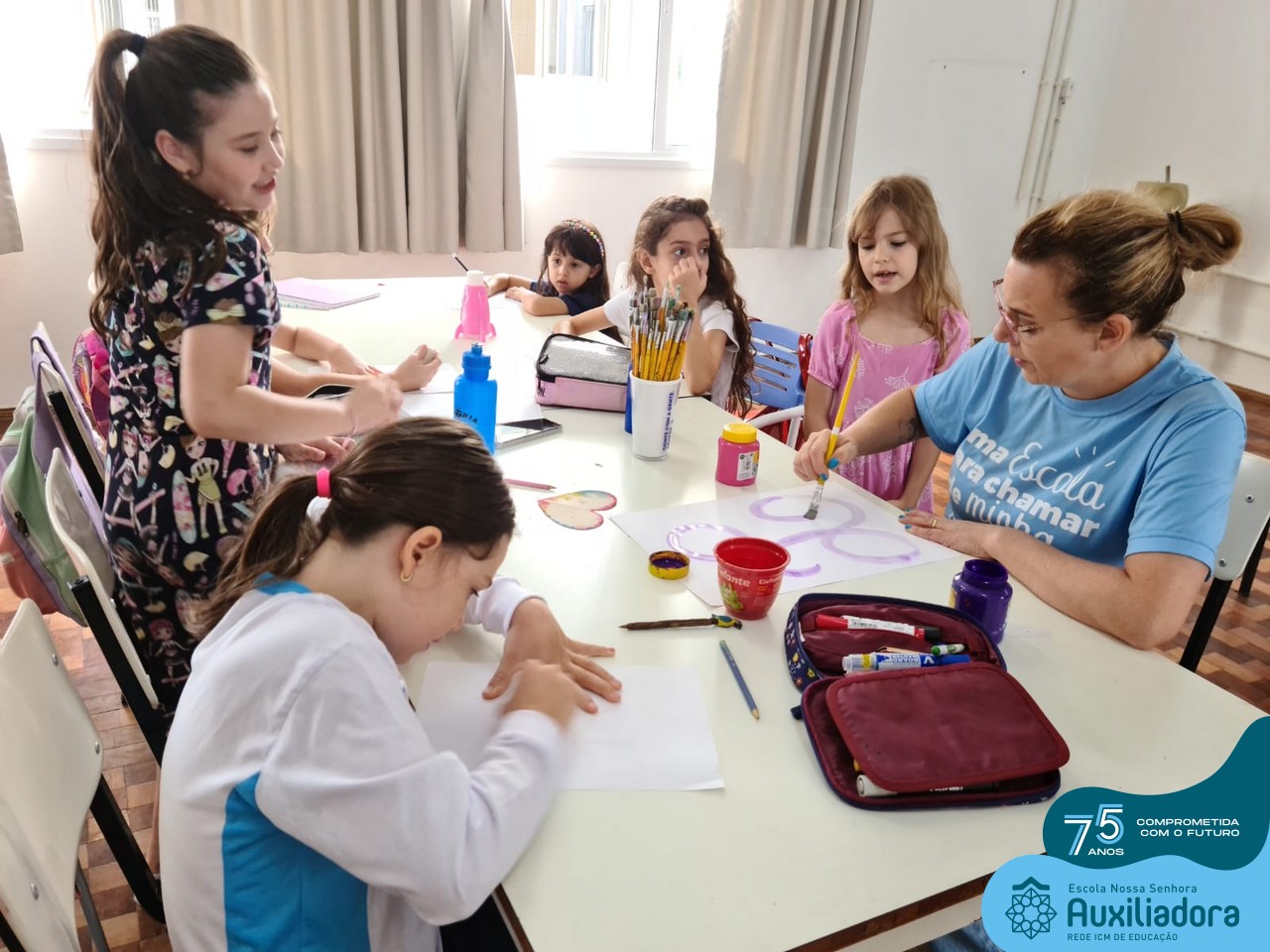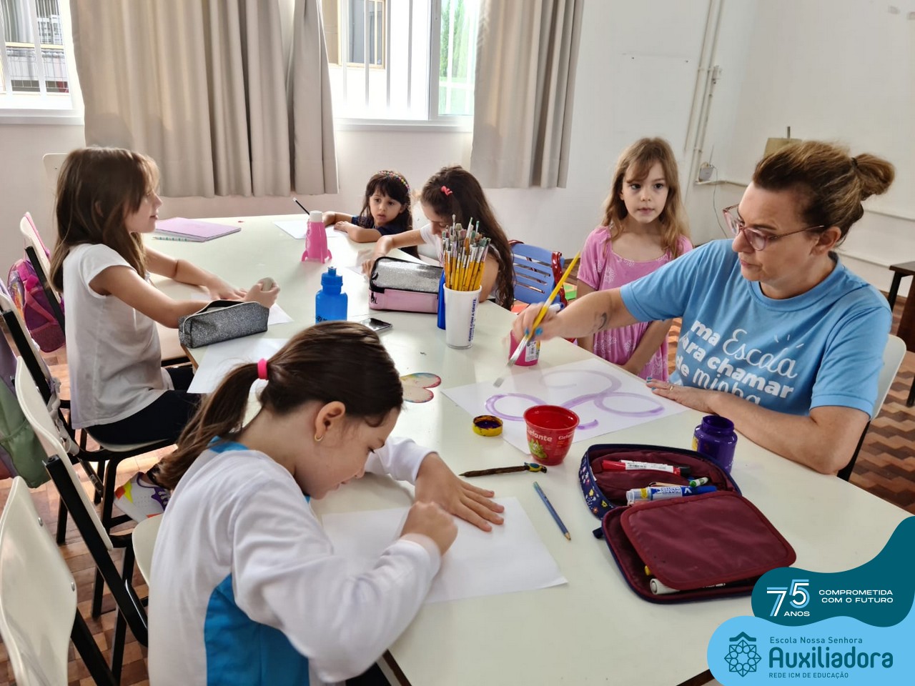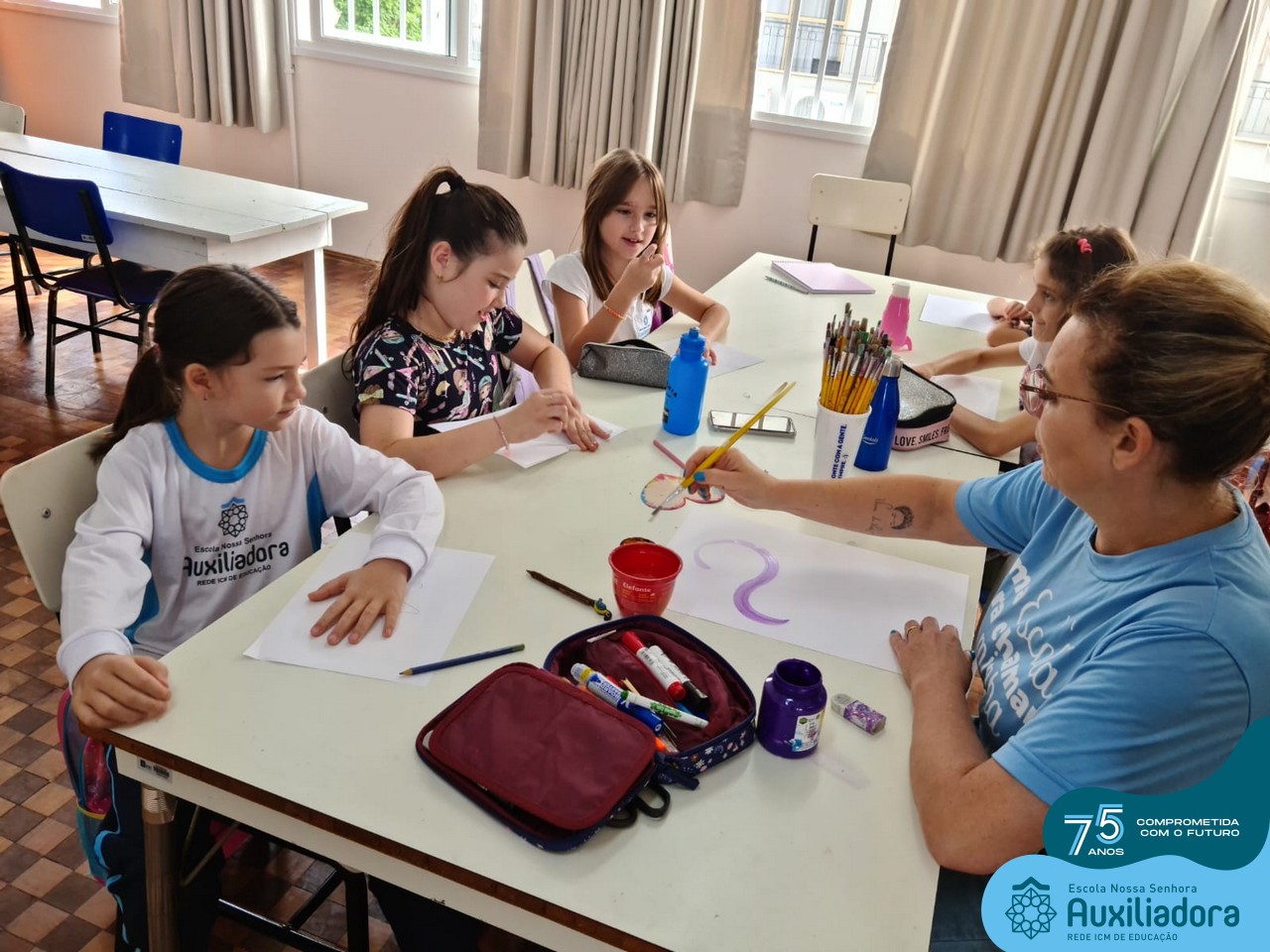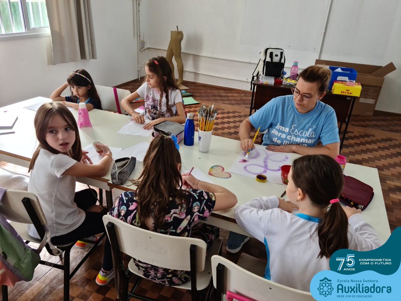 A oficina de pintura é ofertada aos alunos do 1º ao 9º ano no turno inverso.