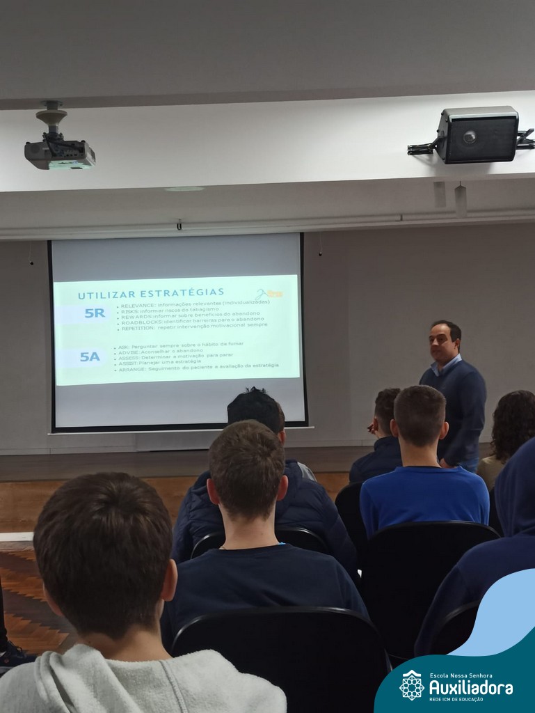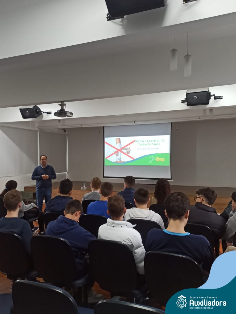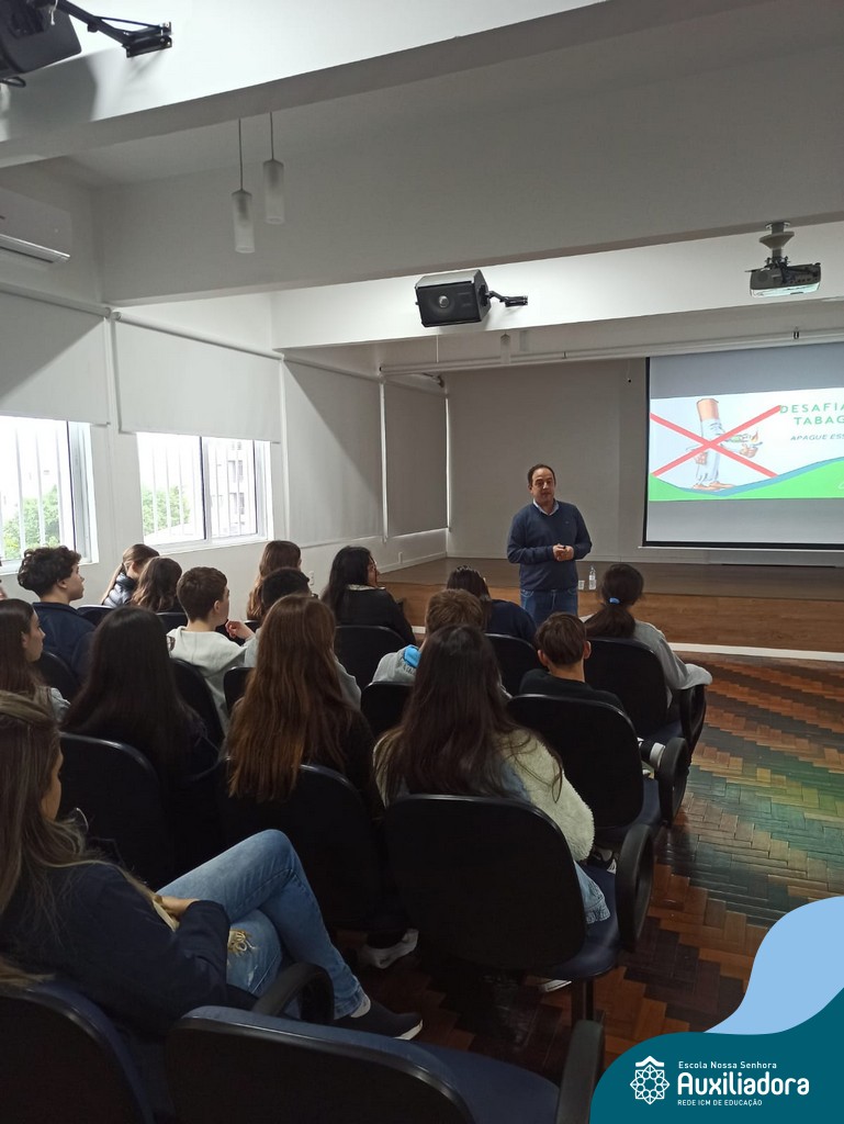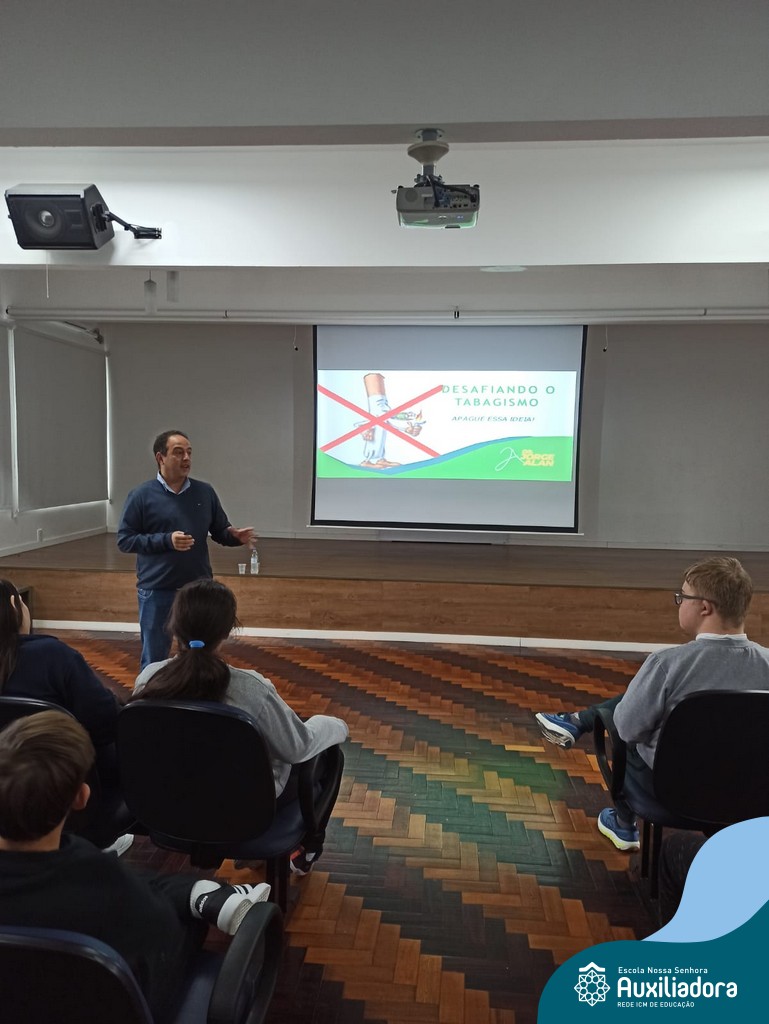 Durante a manhã desta segunda-feira, 27, os alunos das turmas de 8º e 9º ano participaram de uma palestra esclarecedora sobre o tabagismo. Com o objetivo de promover a sensibilização e os cuidados em relação a esse tema tão relevante, a palestra trouxe à tona informações essenciais sobre os riscos associados ao hábito de fumar e destacou a importância da prevenção para a promoção da saúde.