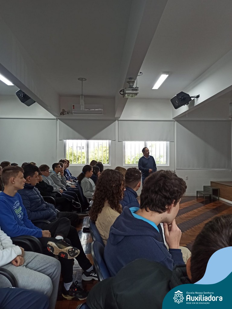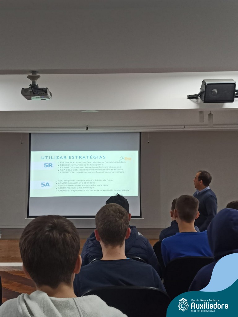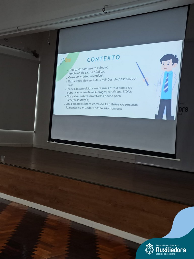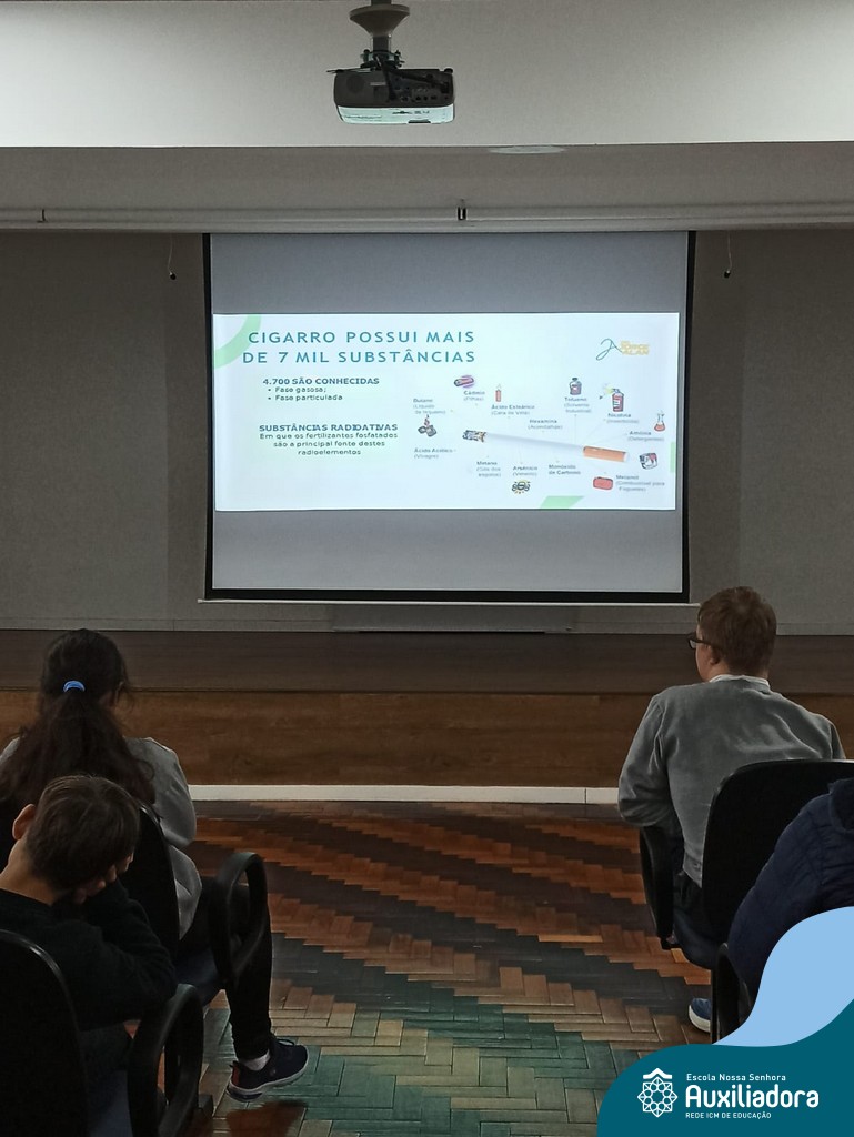Durante a manhã desta segunda-feira, 27, os alunos das turmas de 8º e 9º ano participaram de uma palestra esclarecedora sobre o tabagismo. Com o objetivo de promover a sensibilização e os cuidados em relação a esse tema tão relevante, a palestra trouxe à tona informações essenciais sobre os riscos associados ao hábito de fumar e destacou a importância da prevenção para a promoção da saúde.