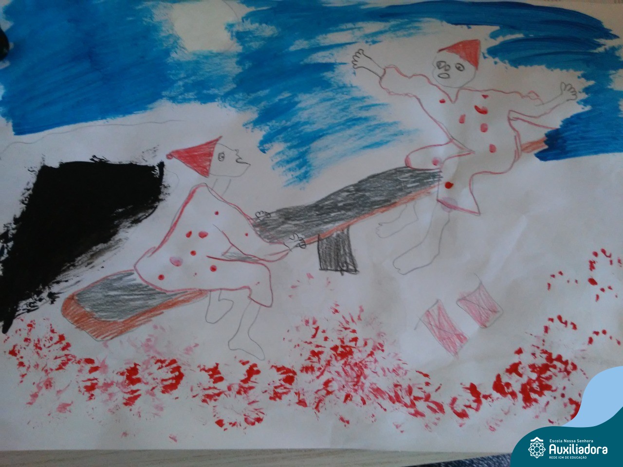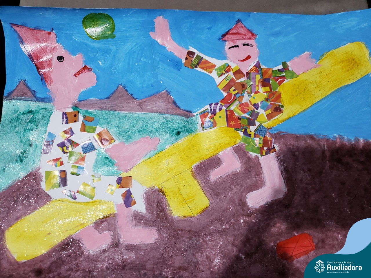 Cada criança usou a sua criatividade para fazer a releitura da obra “Palhacinhos na Gangorra” utilizando diferentes tipos de materiais.