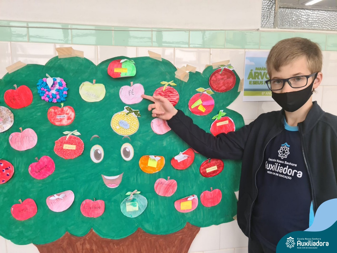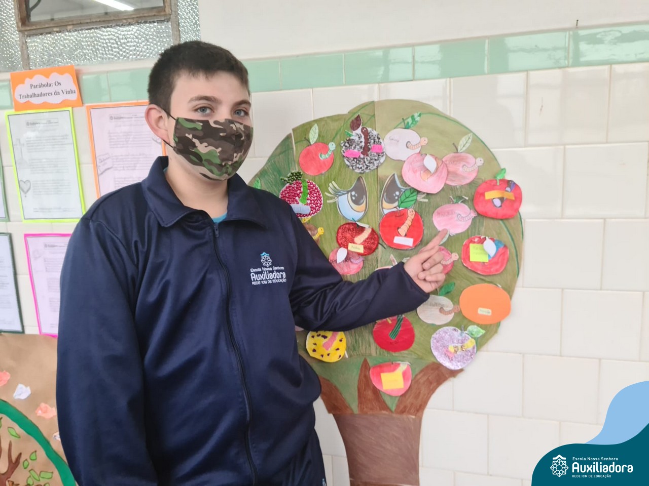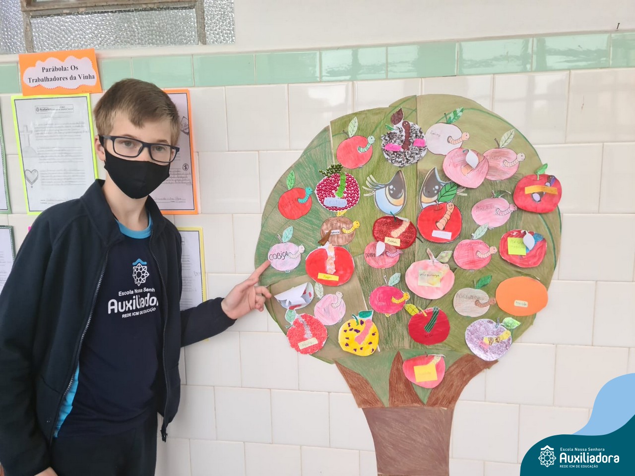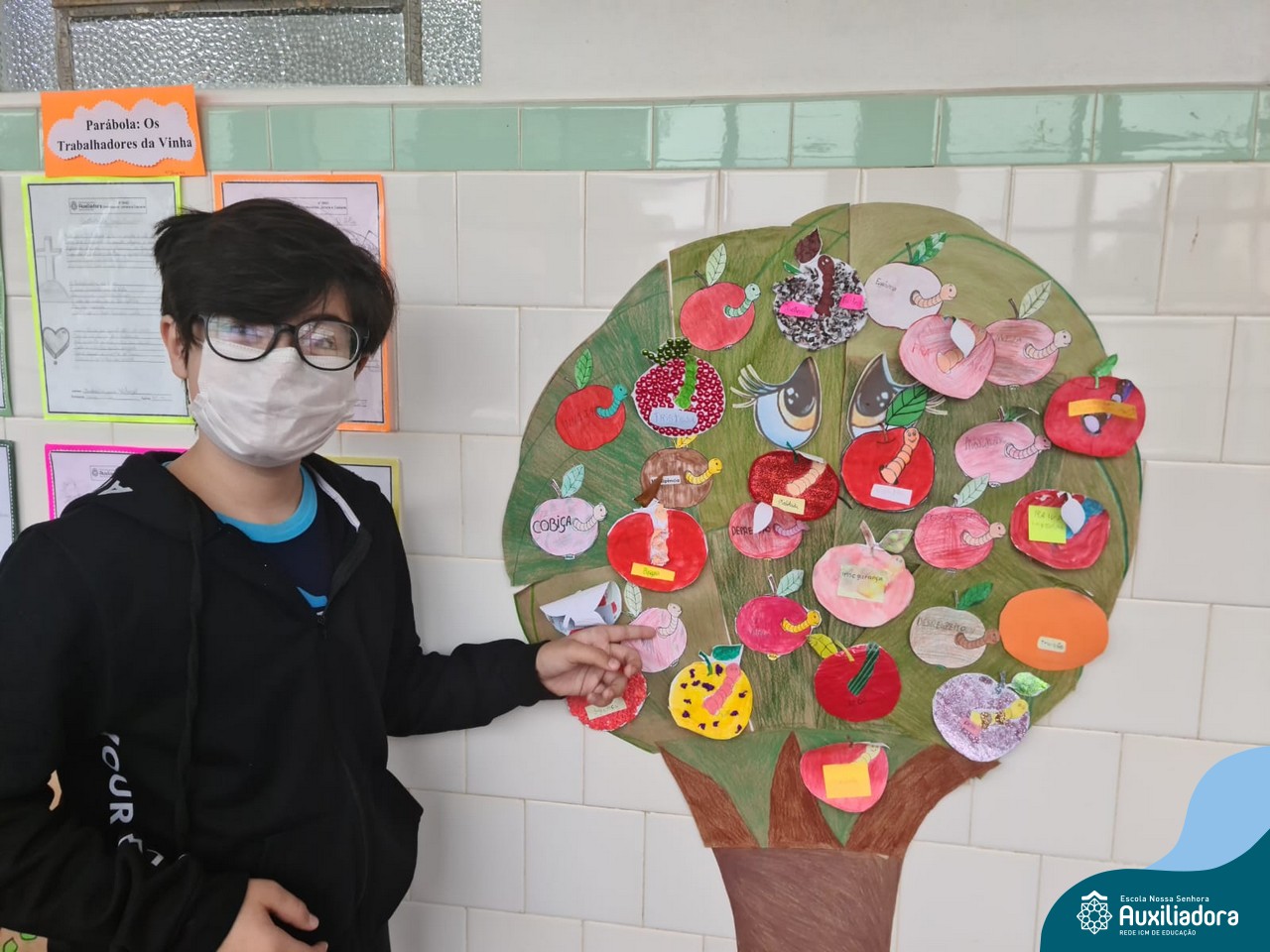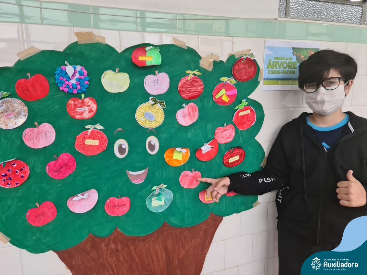 A turma do 6º ano 61 estudou e confeccionou trabalhos alusivos sobre a parábola: Árvore e seus frutos. Além disso, foram realizadas leituras bíblicas diariamente e visitas a Capela da Escola no decorrer do mês.