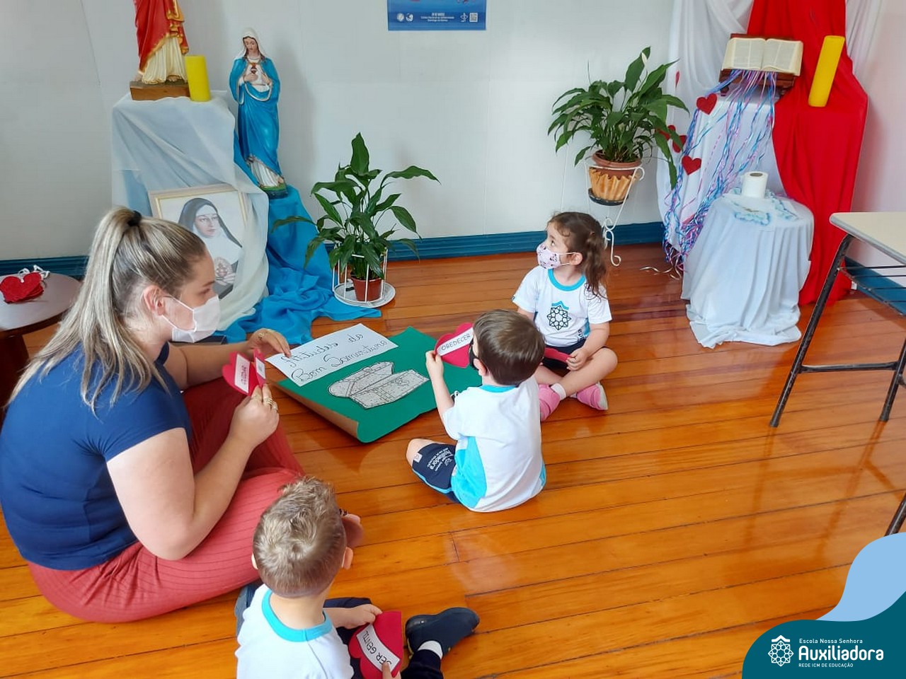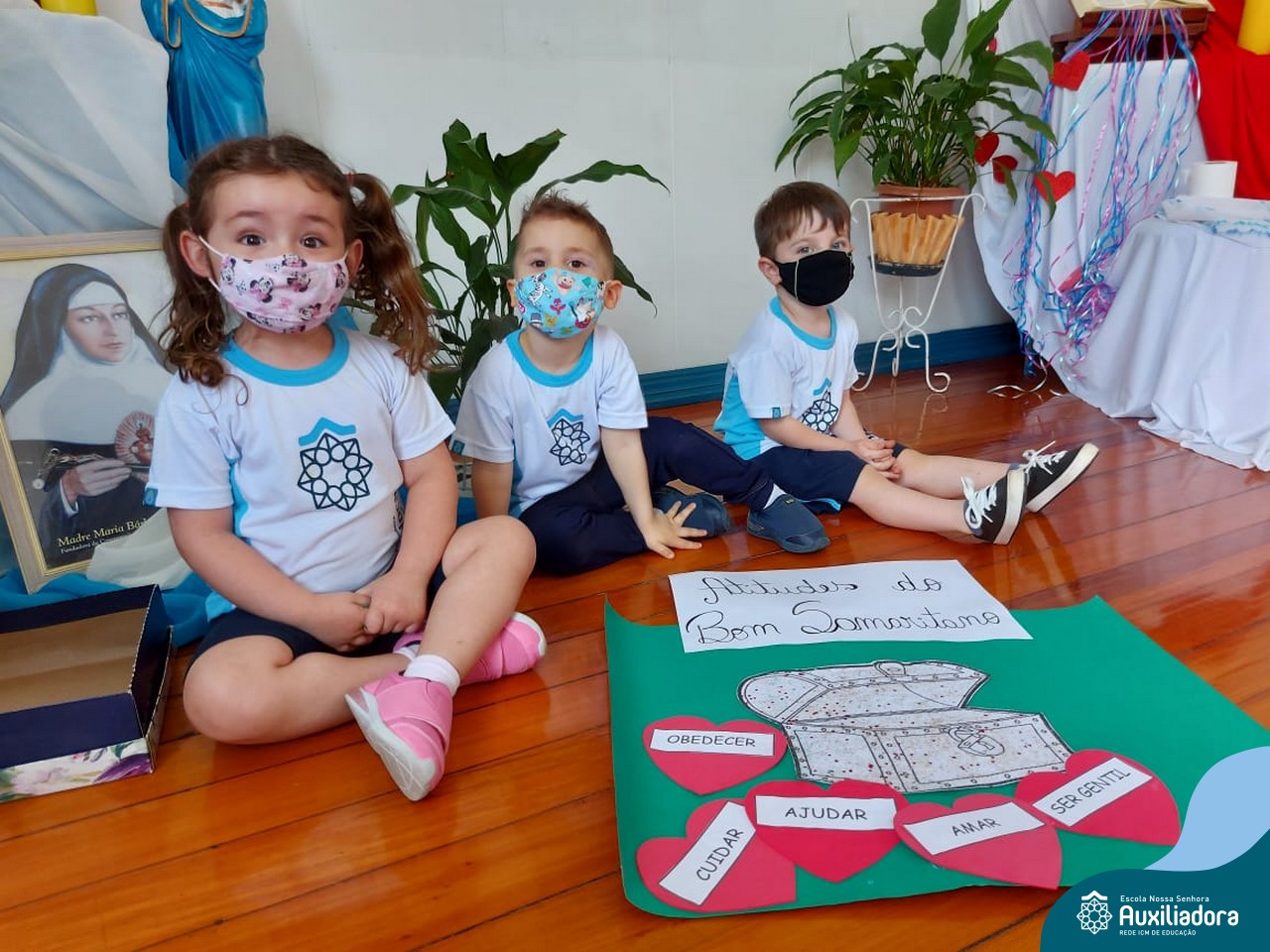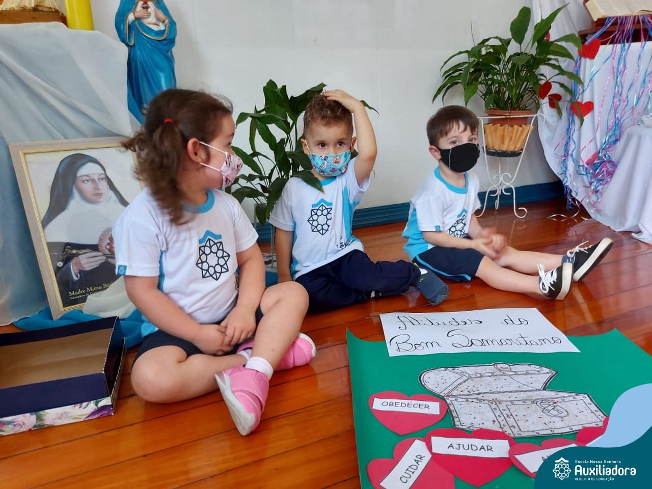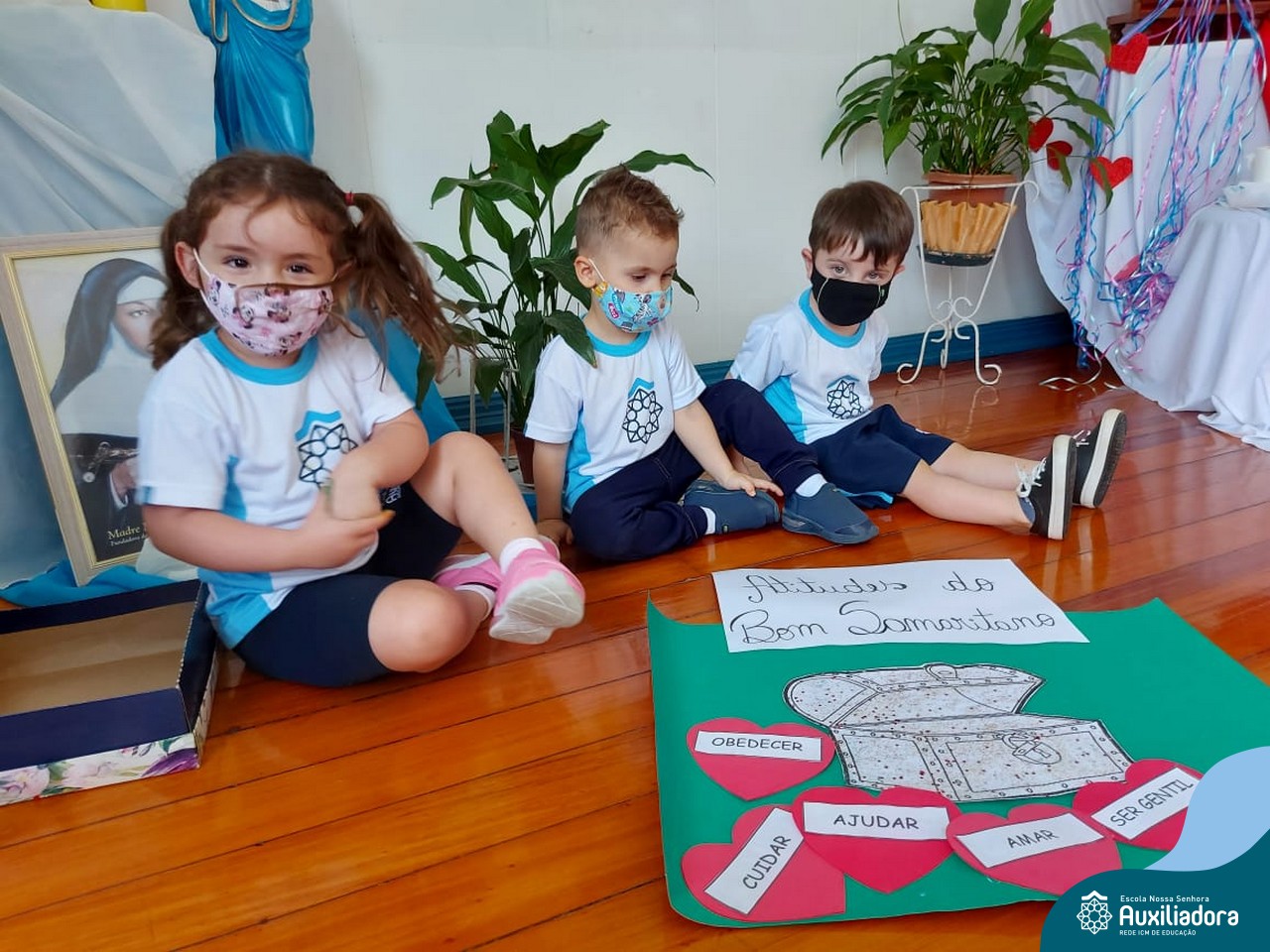 A turma do Maternal 1 A estudou e confeccionou trabalhos alusivos sobre a parábola do Bom Samaritano. Além disso, foram realizadas leituras bíblicas diariamente e visitas a Capela da Escola no decorrer do mês.